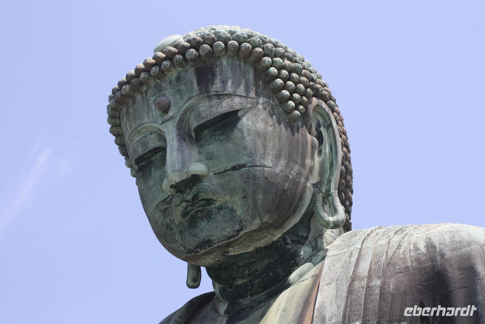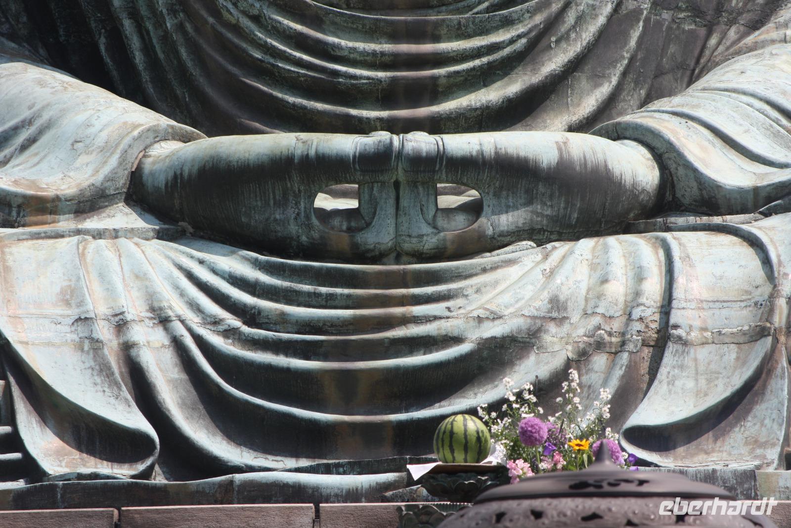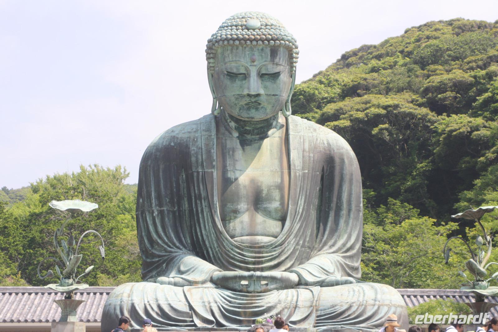 Unser Weg soll uns heute über Yokohama, der Y-Brücke und dem einsamen Windrad in den Fuji-Hakone führen. Wir halten unterwegs in Kamakura und besuchen den Kotoku-in-Tempel, welcher dem Amida-Buddha gewidmet ist. Hier steht ein 13 Meter hoher Buddha des Westens. Er steht für die warme Abendsonne und den Tod um ins westliche Paradies zu gelangen. Die Nonne Jodo hatte damals sechs Jahre Lang Almosen gesammelt, um diese Bronzestatue gießen zu lassen. Weil der Tempel immer wieder aufs Neue durch Feuer und Fluten zerstört wurde, ist man zur Erkenntnis gekommen, dass dieser Budda lieber unter freiem Himmel meditieren möchte und so blieb er seit über 600 Jahren unversehrt. Seine Hände sind zu einer Wissensfaust geformt, auf seinem Kopf befindet sich neben 460 Locken auch ein drittes Auge. Er weiß also alles über den Kosmos und über uns. Buddha bleibt ruhig, also dürften wir alle brave Kinder Buddhas sein. *Zwinker*