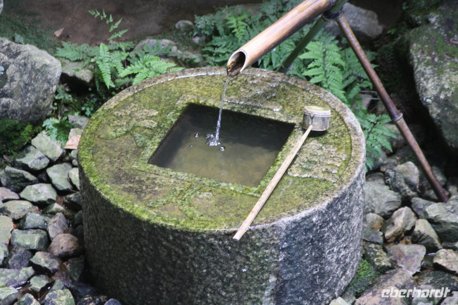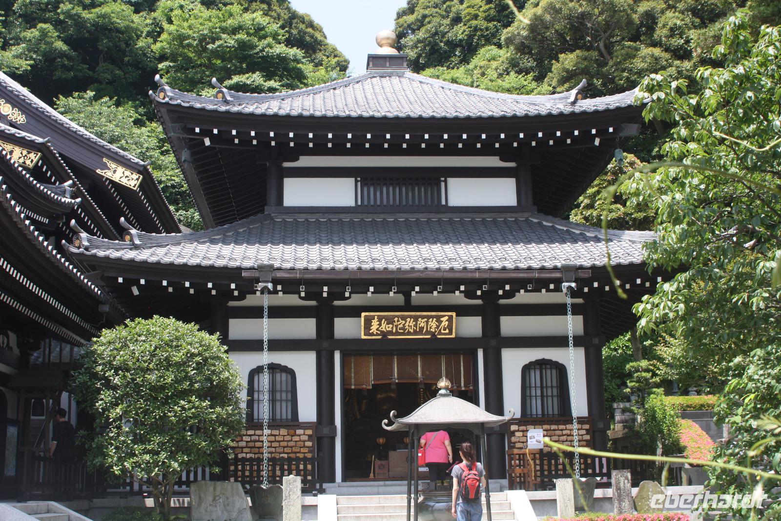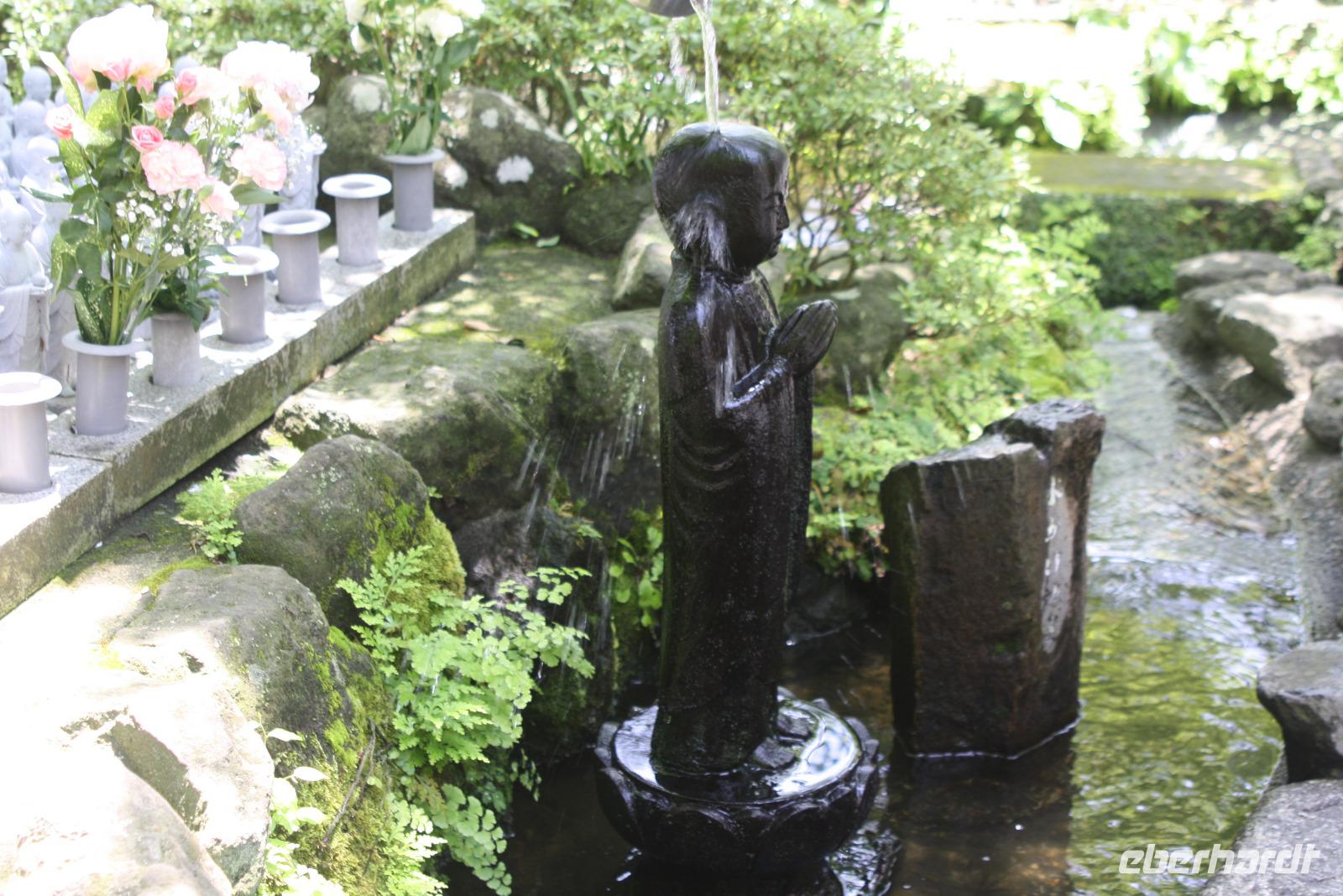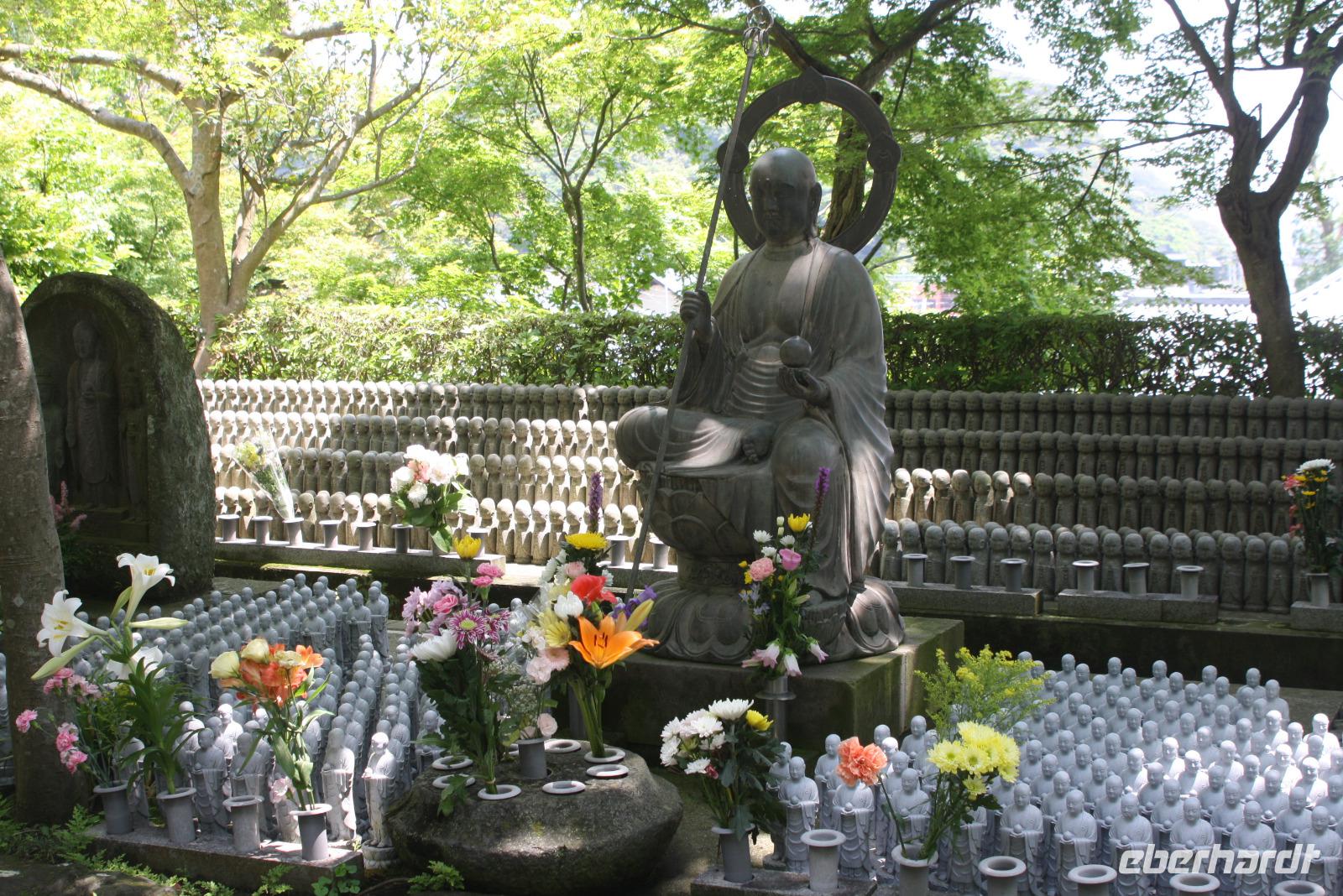 Nach wenigen Fußminuten gelangen wir zum Gartenbereich des Hase-dera Tempels. Gleich am Eingang des Tempels wächst ein Baum mit witzigem Namen: Der-Affe-Rutscht-Ab-Baum. Im Garten verteilt finden wir 12.000 Buddha Figuren für die verlorenen Kinderseelen. Sie besitzen ebenfalls ein drittes Auge, haben eine säuglingshafte Erscheinung und halten öfters den Pfirsich in der Hand, der für Lebenskraft steht. Mit Entsetzen hören wir, dass durchschnittlich 8 Abtreibungen pro Japanerin verzeichnet werden. Kein Wunder also, dass die Geburtenrate in Japan drastisch zurück geht und mit 1,2 Kindern pro Paar sogar unter der deutschen Geburtenrate liegt. Wir gießen Wasser über die Buddhaköpfe und hoffen damit, den heißen und schweren Weg der Kinder ins Jenseits zu kühlen/unterstützen.