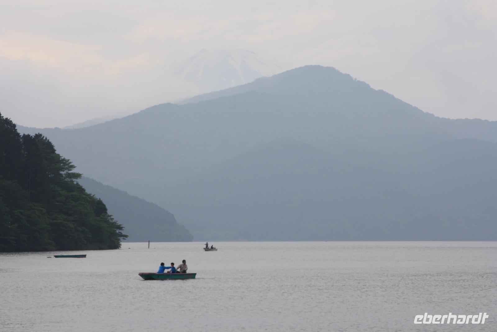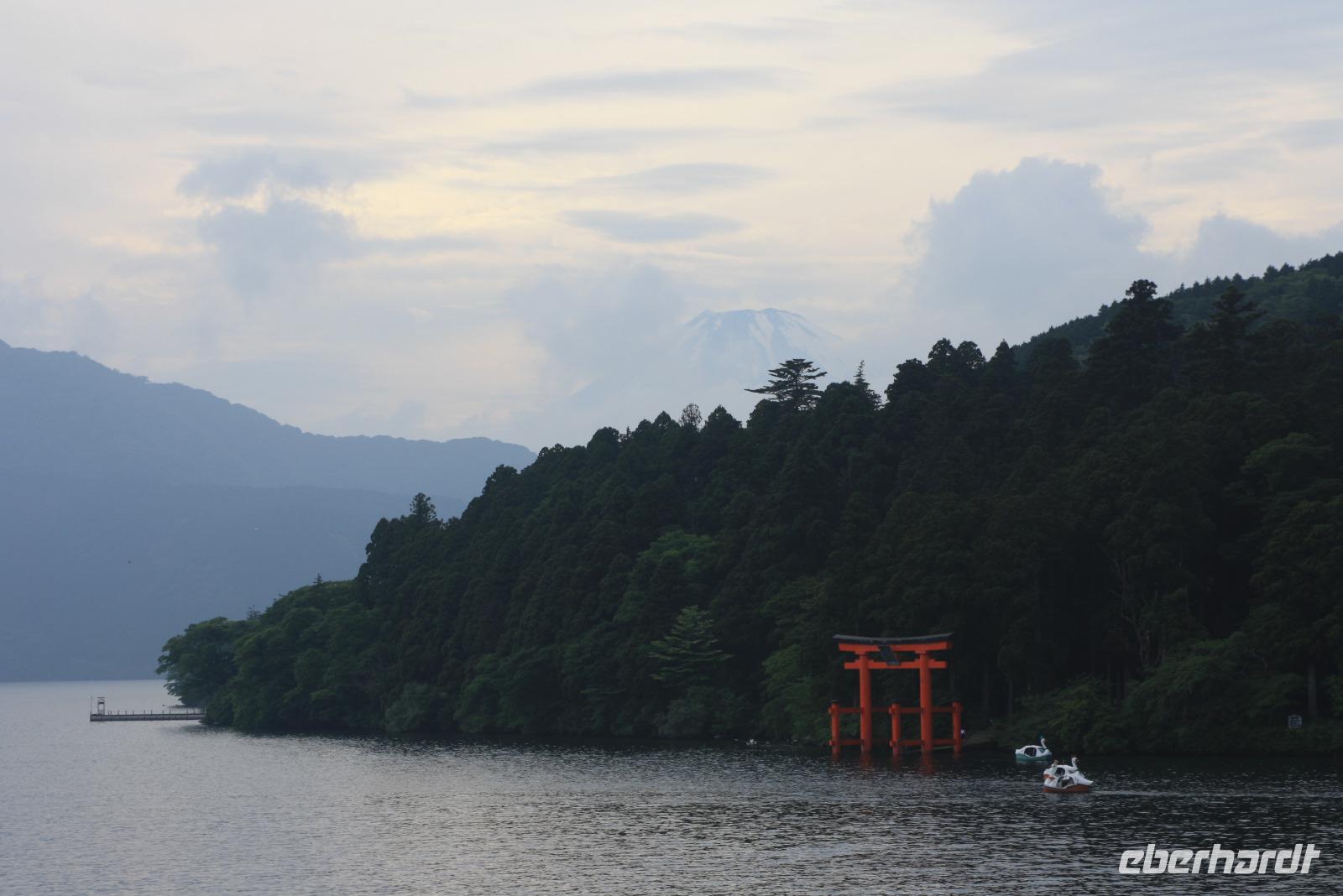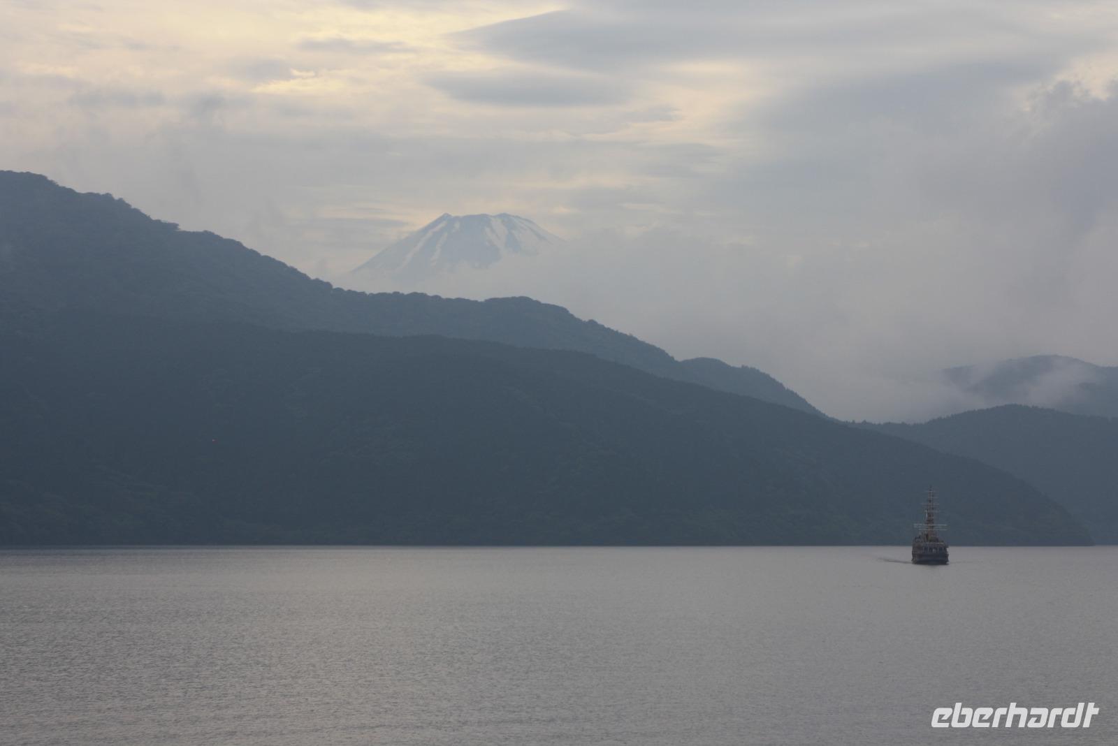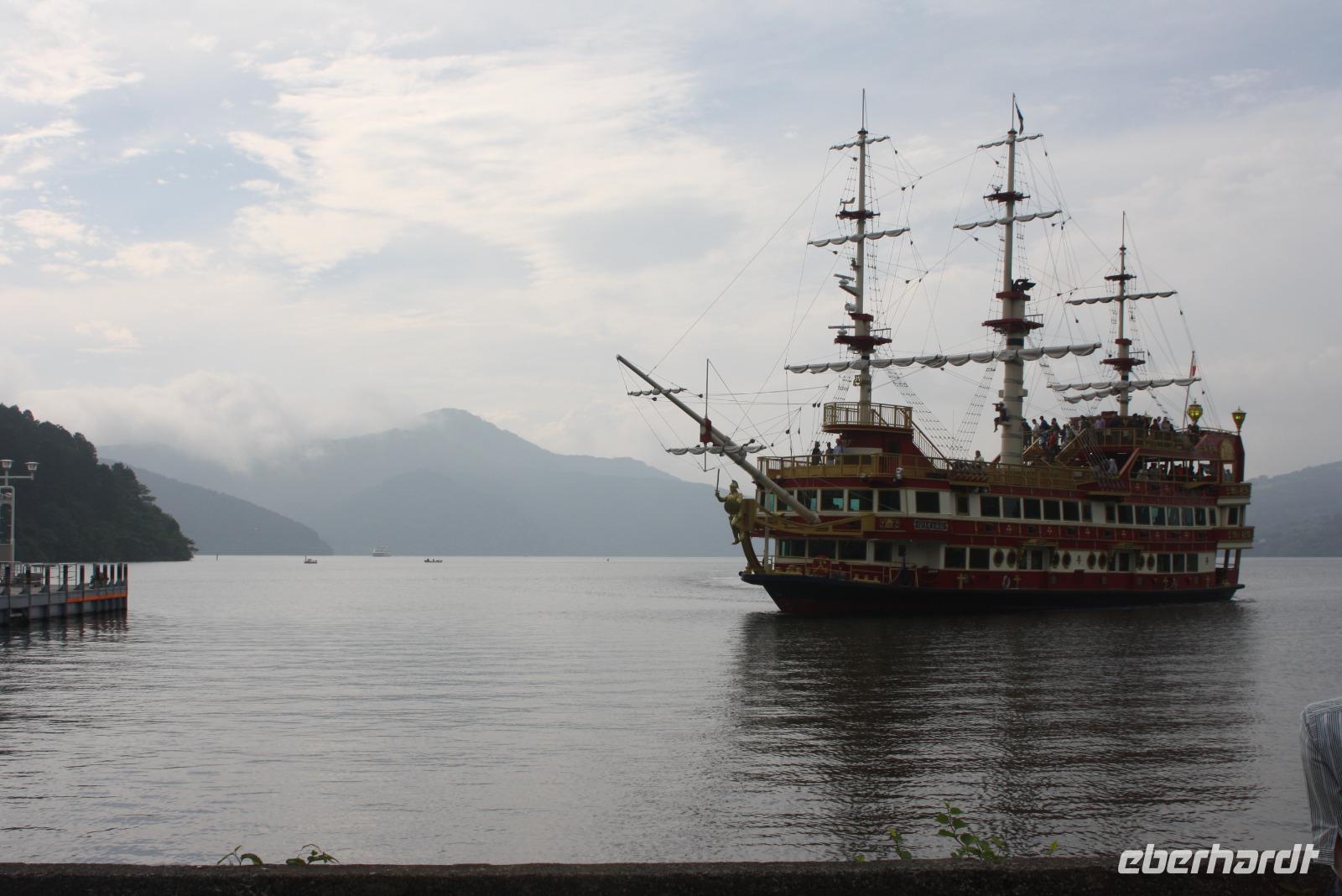 Die Reise führt uns weiter entlang des Strandes vorbei an zahlreichen Surfern zum Fuji-Hakone-Nationalpark. Zwar geraten wir unterwegs an einen Stau, doch Oliver verkürzt uns wieder die Zeit mit Informationen zur Yakuza-Mafia, was für Glücksspiele oder Prostitution gar vom Staat erlaubt sind und weitere Mysterien. Immer wieder halten wir Ausschau nach dem heiligsten aller japanischen Berge, dem Fuji-San mit 3.776 Metern Höhe. Um ihn herum haben sich über die Zeit fünf Seen gebildet. Auf dem größten See Ashi unternehmen wir mit einer Piratenschiff nachempfundener Fähre eine kleine Tour um den Berg herum. Dieser Fuji-San, der Göttin Amaterasus Hausberg, ist schon ein schüchterner Geselle. Schließlich ist er etwa 100.000 Jahre jung und spuckte zuletzt im Jahre 1707, dafür aber zwei Jahre lang. Zusammen mit 23 weiteren Vulkanen zählt er zu den noch aktiven Vulkanen in Japan. Man sagt auch, die Japaner leben am Rande des Feuers. Heute versteckt er sich gern hinter Wolken. Doch immerhin, zwei Mal hat er gegrüßt in fast voller Pracht, bis er wieder hinter der Nebelwand verschwindet. Die meisten von uns haben es nicht geschafft, ihn mit der Kamera festzuhalten, doch in unseren Herzen wird er noch lange bleiben. Denn nicht jeder Reisegast durch Japan kann behaupten, den Fuji-San wirklich gesehen zu haben. Der Chauffeur ist so engagiert, dass er uns zu einer kleinen Aussichtsstelle am Kawagushiko-See bringen möchte und zwängt seinen Bus sogar durch schmale Straßen, lässt ihn durch herunter hängende Äste und Zweige neu gestalten.