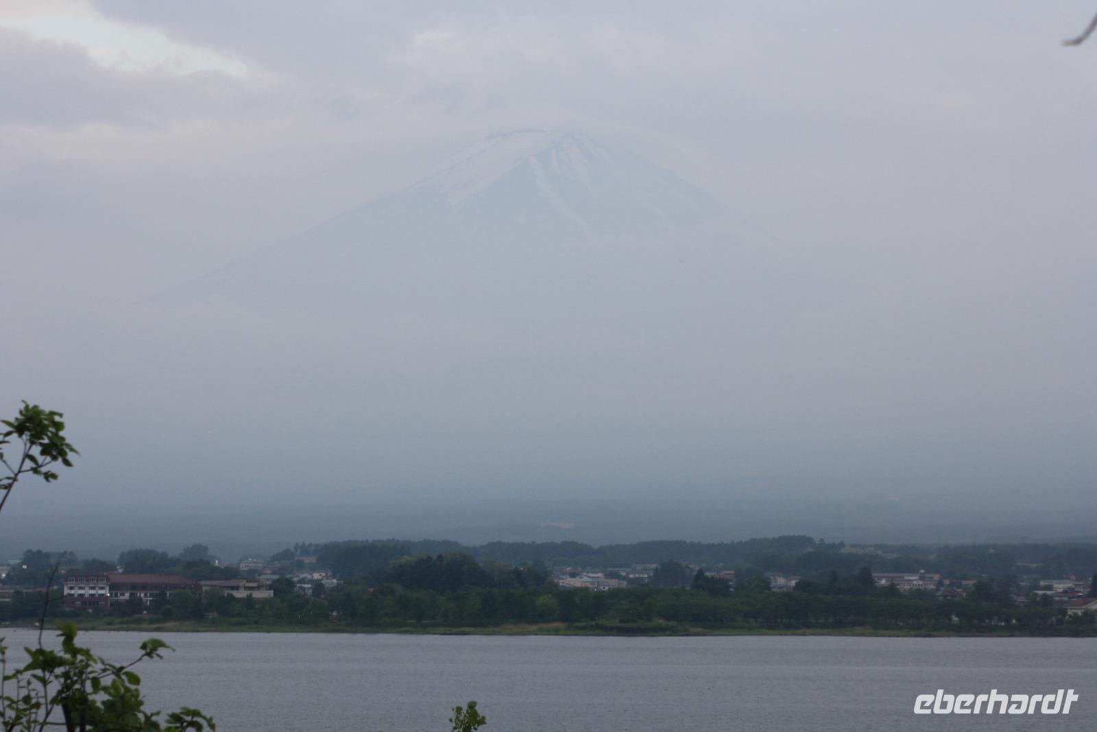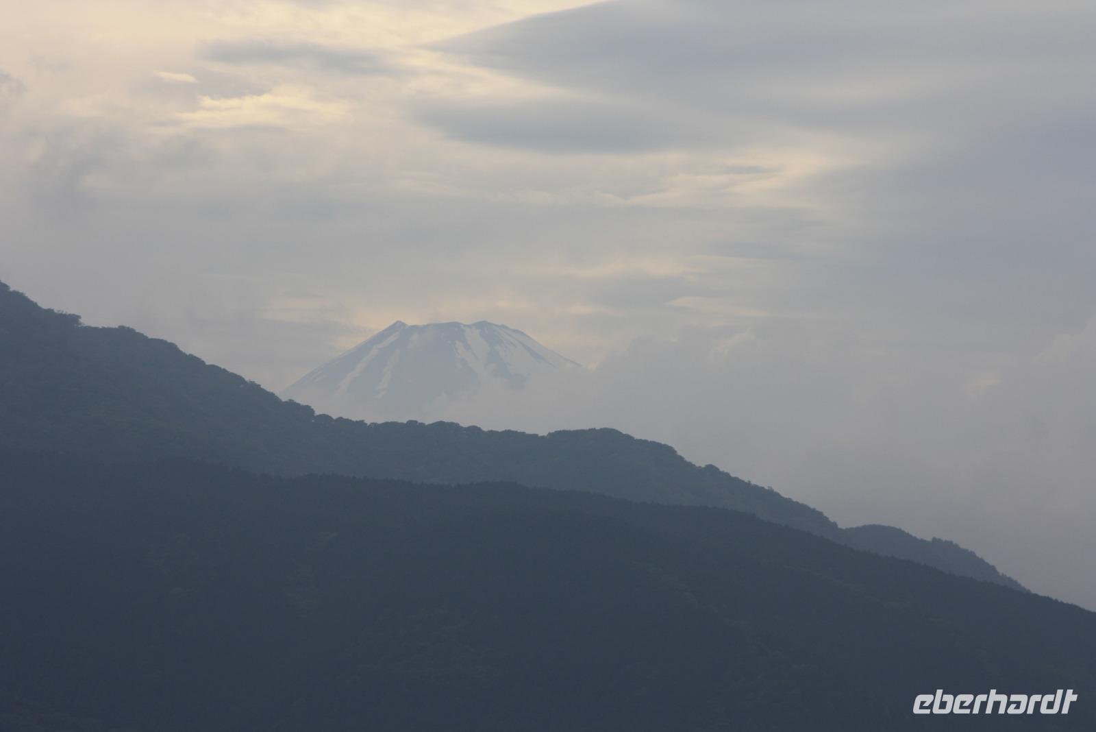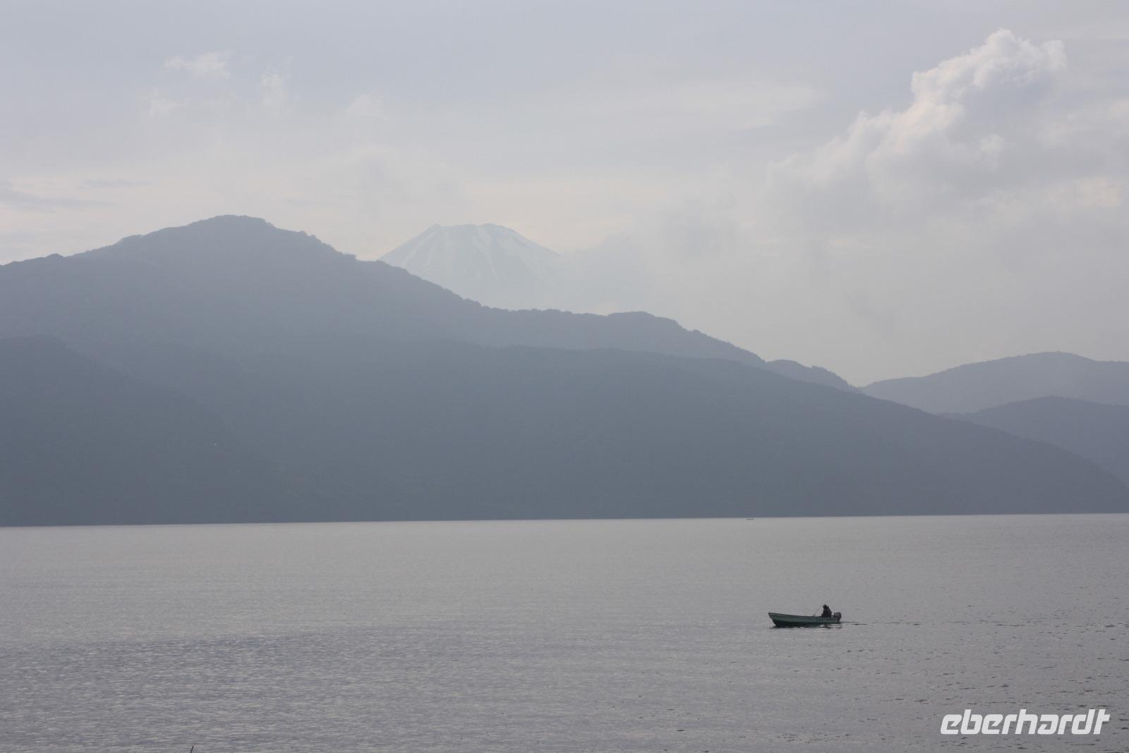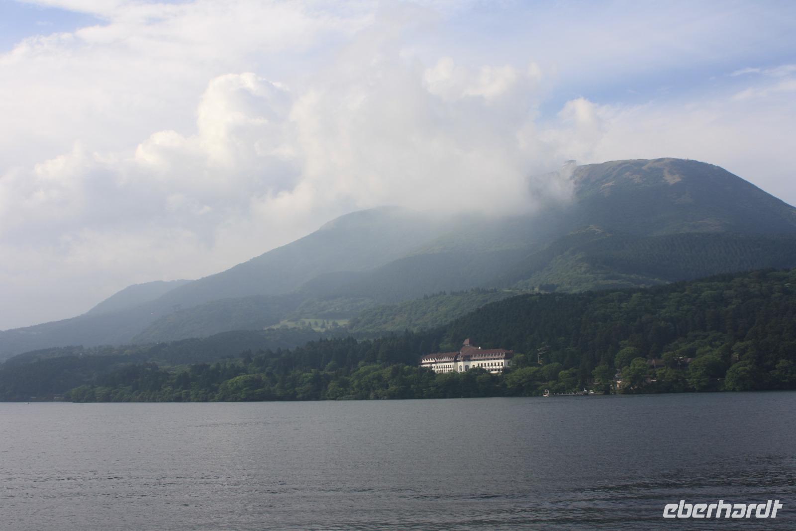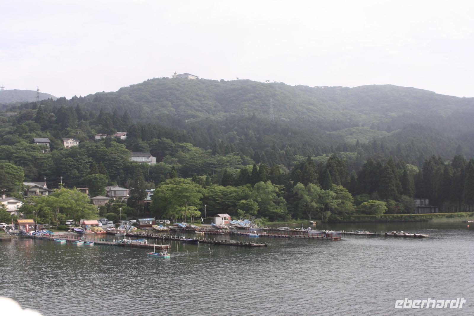 Die Reise führt uns weiter entlang des Strandes vorbei an zahlreichen Surfern zum Fuji-Hakone-Nationalpark. Zwar geraten wir unterwegs an einen Stau, doch Oliver verkürzt uns wieder die Zeit mit Informationen zur Yakuza-Mafia, was für Glücksspiele oder Prostitution gar vom Staat erlaubt sind und weitere Mysterien. Immer wieder halten wir Ausschau nach dem heiligsten aller japanischen Berge, dem Fuji-San mit 3.776 Metern Höhe. Um ihn herum haben sich über die Zeit fünf Seen gebildet. Auf dem größten See Ashi unternehmen wir mit einer Piratenschiff nachempfundener Fähre eine kleine Tour um den Berg herum. Dieser Fuji-San, der Göttin Amaterasus Hausberg, ist schon ein schüchterner Geselle. Schließlich ist er etwa 100.000 Jahre jung und spuckte zuletzt im Jahre 1707, dafür aber zwei Jahre lang. Zusammen mit 23 weiteren Vulkanen zählt er zu den noch aktiven Vulkanen in Japan. Man sagt auch, die Japaner leben am Rande des Feuers. Heute versteckt er sich gern hinter Wolken. Doch immerhin, zwei Mal hat er gegrüßt in fast voller Pracht, bis er wieder hinter der Nebelwand verschwindet. Die meisten von uns haben es nicht geschafft, ihn mit der Kamera festzuhalten, doch in unseren Herzen wird er noch lange bleiben. Denn nicht jeder Reisegast durch Japan kann behaupten, den Fuji-San wirklich gesehen zu haben. Der Chauffeur ist so engagiert, dass er uns zu einer kleinen Aussichtsstelle am Kawagushiko-See bringen möchte und zwängt seinen Bus sogar durch schmale Straßen, lässt ihn durch herunter hängende Äste und Zweige neu gestalten.