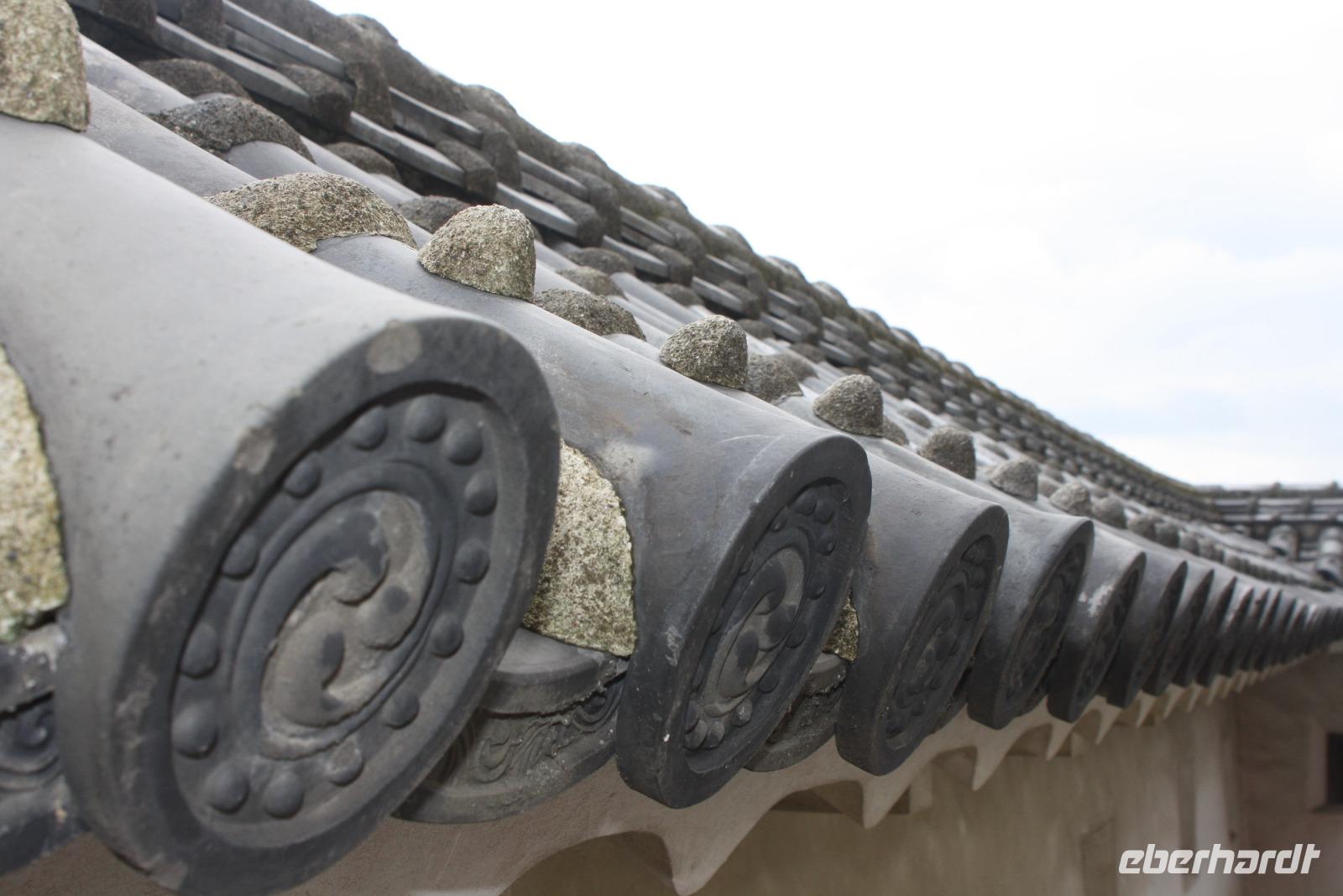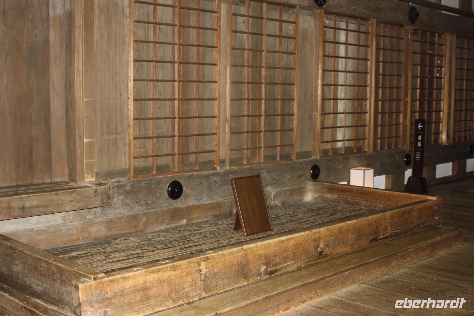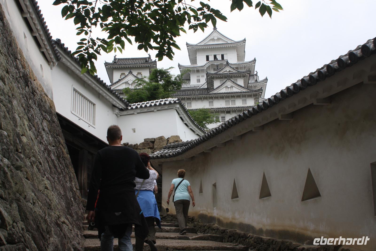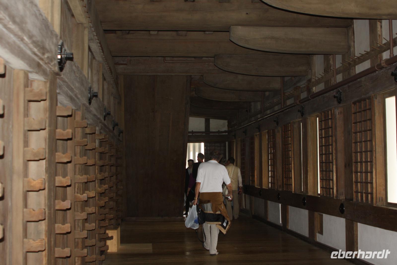 Ausnahmsweise heißt es heute zeitig aufstehen, denn wir wollen unsere Zugfahrt mit dem Shinkansen auf keinen Fall verpassen. Letztes Jahr feierte der Sinkansen 40 Jahre Jubiläum. Dieser Zug erreicht beeindruckende Spitzengeschwindigkeiten bis zu 330 km/h. Von Shin-Fuji fahren wir vorbei an Teeplantagen, von denen Sencha-Tee, der Giokoro-Vollschattentee sowie der beste Matcha-Tee hergestellt werden, nach Himeji. Um die Fahrt locker zu gestalten verteilt Anh Taiyakis, ein japanisches Waffelgebäck mit einer Paste aus roten Bohnen. Dazu wird japanischer Pflaumenwein gereicht. So sind wir ruckzuck in Himeji angekommen. Schnell wird das Handgepäck verstaut und dann auf zum Fußmarsch von ca. 20 Minuten zur Burg. Inmitten der modernen Stadt thront die größte, schönste und fast einzig erhaltene Burganlage Japans aus dem 17. Jahrhundert. Bewundernswert, wie damals schon die Errichtung gemeistert wurde. Die Burg, die als Verteidigung dienen sollte, ist auf einem künstlichen aus Lehm und Sand aufgeschütteten Hügel von ca. 65 Metern über dem Meeresspiegel errichtet worden, während die gleichnamige Stadt auf nur 12 Metern Höhe steht. Seit mehreren Hundert Jahren übersteht sie Wind, Wetter und vor allem Erdbeben. Wortwörtlich bedeutet Himeji Himmels beschützender Pavillon. Wir besichtigen die inneren Räume, die leider nie wirklich genutzt wurden. Außen edel verziert, sind die Innenräume einfach und relativ schmucklos gehalten. Etliche Holztreppen sind zu überwinden, bis man endlich die sechste und höchste Etage erreicht. Bei klarer Sicht kann man über die Stadt bis zum Ozean blicken.