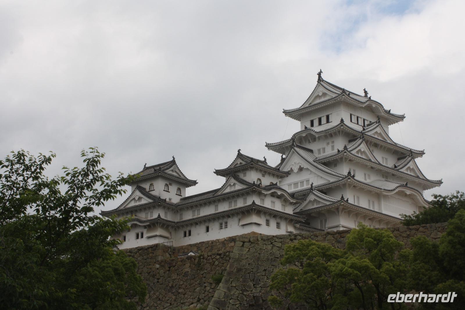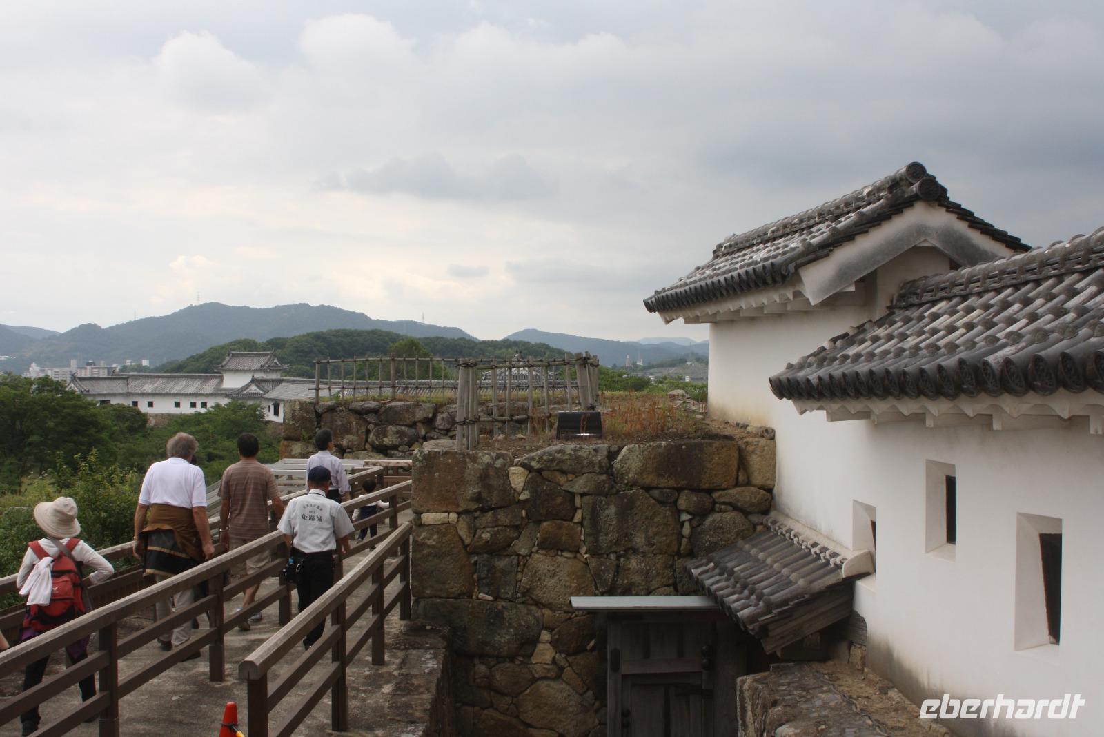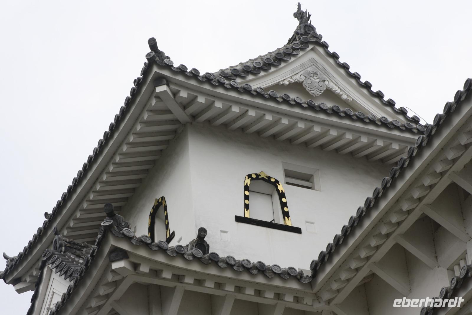 Ausnahmsweise heißt es heute zeitig aufstehen, denn wir wollen unsere Zugfahrt mit dem Shinkansen auf keinen Fall verpassen. Letztes Jahr feierte der Sinkansen 40 Jahre Jubiläum. Dieser Zug erreicht beeindruckende Spitzengeschwindigkeiten bis zu 330 km/h. Von Shin-Fuji fahren wir vorbei an Teeplantagen, von denen Sencha-Tee, der Giokoro-Vollschattentee sowie der beste Matcha-Tee hergestellt werden, nach Himeji. Um die Fahrt locker zu gestalten verteilt Anh Taiyakis, ein japanisches Waffelgebäck mit einer Paste aus roten Bohnen. Dazu wird japanischer Pflaumenwein gereicht. So sind wir ruckzuck in Himeji angekommen. Schnell wird das Handgepäck verstaut und dann auf zum Fußmarsch von ca. 20 Minuten zur Burg. Inmitten der modernen Stadt thront die größte, schönste und fast einzig erhaltene Burganlage Japans aus dem 17. Jahrhundert. Bewundernswert, wie damals schon die Errichtung gemeistert wurde. Die Burg, die als Verteidigung dienen sollte, ist auf einem künstlichen aus Lehm und Sand aufgeschütteten Hügel von ca. 65 Metern über dem Meeresspiegel errichtet worden, während die gleichnamige Stadt auf nur 12 Metern Höhe steht. Seit mehreren Hundert Jahren übersteht sie Wind, Wetter und vor allem Erdbeben. Wortwörtlich bedeutet Himeji Himmels beschützender Pavillon. Wir besichtigen die inneren Räume, die leider nie wirklich genutzt wurden. Außen edel verziert, sind die Innenräume einfach und relativ schmucklos gehalten. Etliche Holztreppen sind zu überwinden, bis man endlich die sechste und höchste Etage erreicht. Bei klarer Sicht kann man über die Stadt bis zum Ozean blicken.