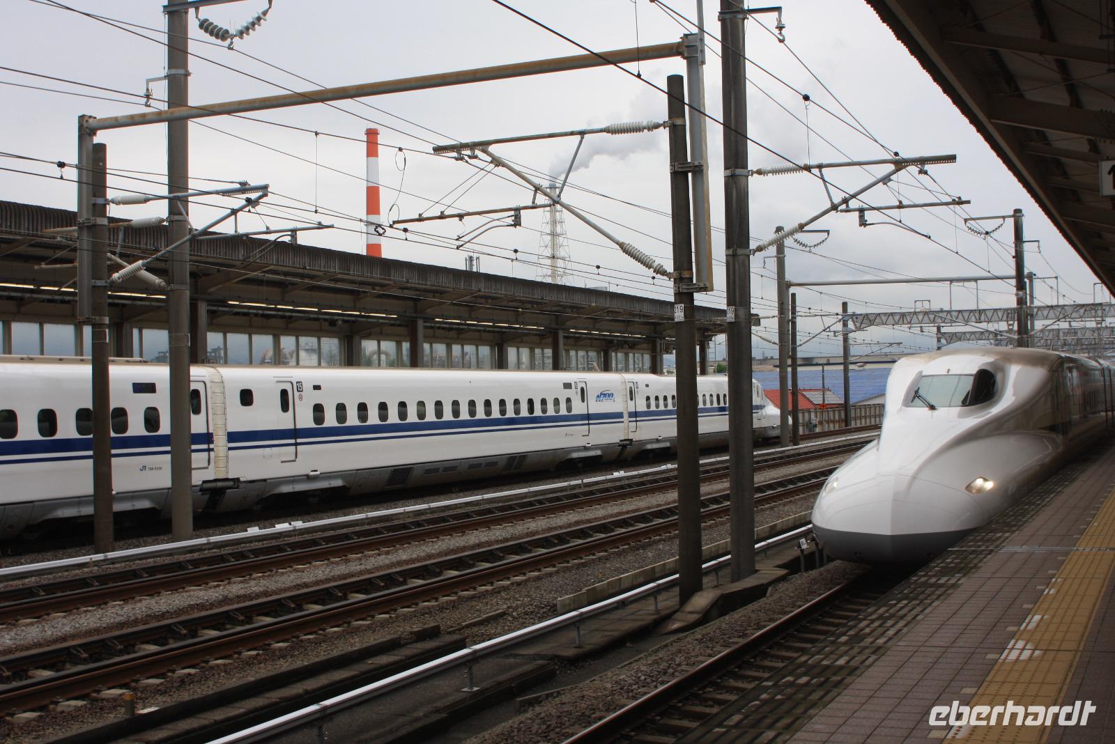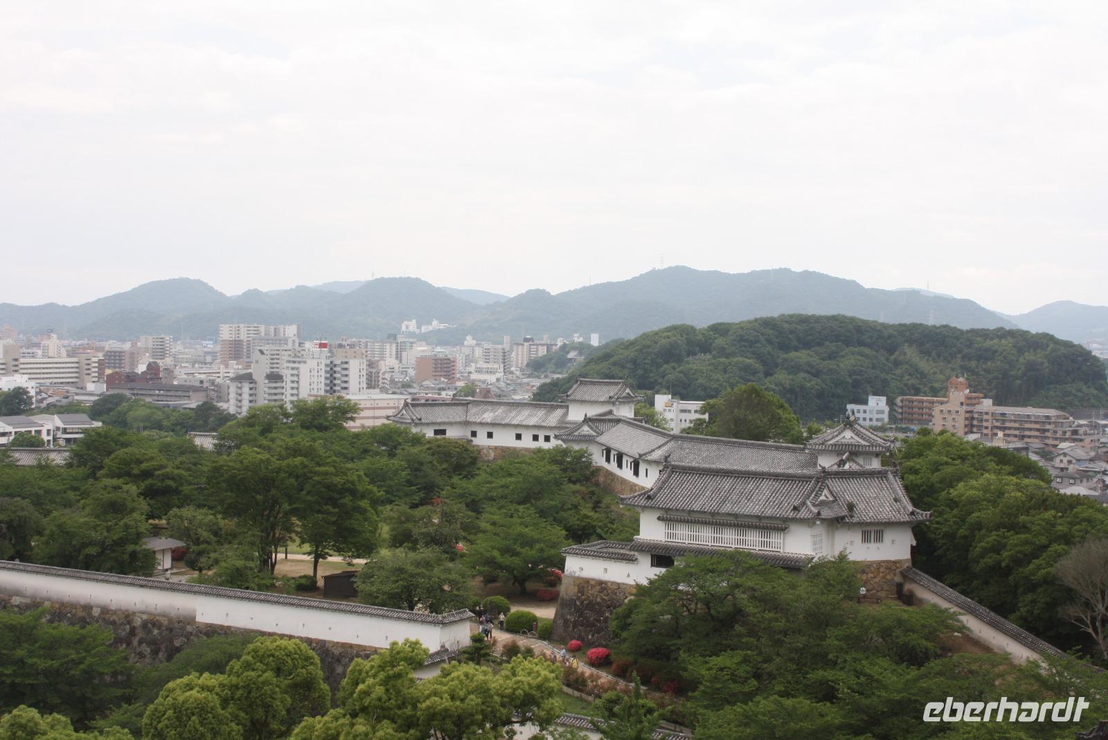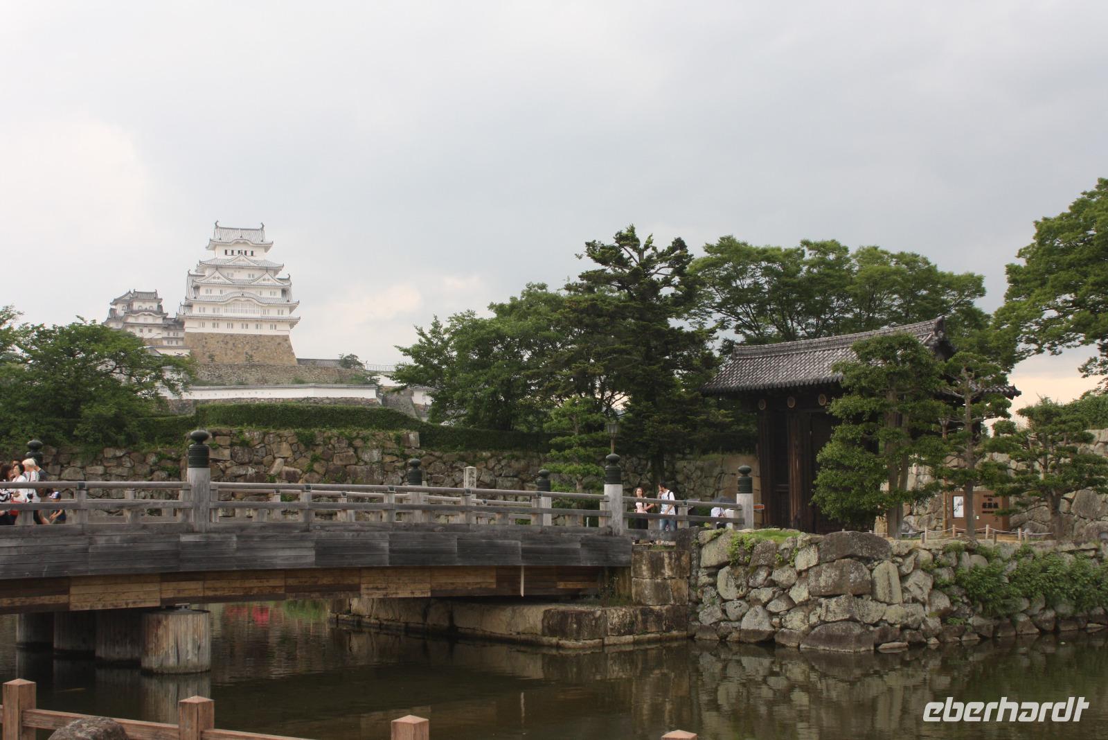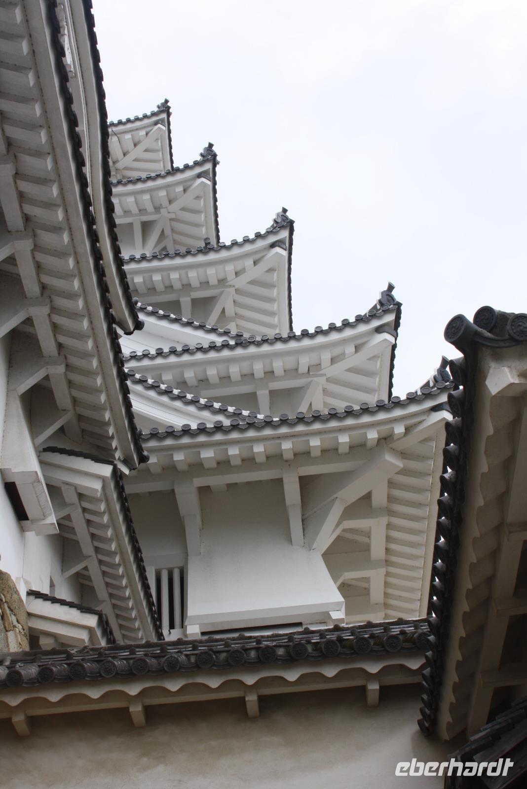 Ausnahmsweise heißt es heute zeitig aufstehen, denn wir wollen unsere Zugfahrt mit dem Shinkansen auf keinen Fall verpassen. Letztes Jahr feierte der Sinkansen 40 Jahre Jubiläum. Dieser Zug erreicht beeindruckende Spitzengeschwindigkeiten bis zu 330 km/h. Von Shin-Fuji fahren wir vorbei an Teeplantagen, von denen Sencha-Tee, der Giokoro-Vollschattentee sowie der beste Matcha-Tee hergestellt werden, nach Himeji. Um die Fahrt locker zu gestalten verteilt Anh Taiyakis, ein japanisches Waffelgebäck mit einer Paste aus roten Bohnen. Dazu wird japanischer Pflaumenwein gereicht. So sind wir ruckzuck in Himeji angekommen. Schnell wird das Handgepäck verstaut und dann auf zum Fußmarsch von ca. 20 Minuten zur Burg. Inmitten der modernen Stadt thront die größte, schönste und fast einzig erhaltene Burganlage Japans aus dem 17. Jahrhundert. Bewundernswert, wie damals schon die Errichtung gemeistert wurde. Die Burg, die als Verteidigung dienen sollte, ist auf einem künstlichen aus Lehm und Sand aufgeschütteten Hügel von ca. 65 Metern über dem Meeresspiegel errichtet worden, während die gleichnamige Stadt auf nur 12 Metern Höhe steht. Seit mehreren Hundert Jahren übersteht sie Wind, Wetter und vor allem Erdbeben. Wortwörtlich bedeutet Himeji Himmels beschützender Pavillon. Wir besichtigen die inneren Räume, die leider nie wirklich genutzt wurden. Außen edel verziert, sind die Innenräume einfach und relativ schmucklos gehalten. Etliche Holztreppen sind zu überwinden, bis man endlich die sechste und höchste Etage erreicht. Bei klarer Sicht kann man über die Stadt bis zum Ozean blicken.