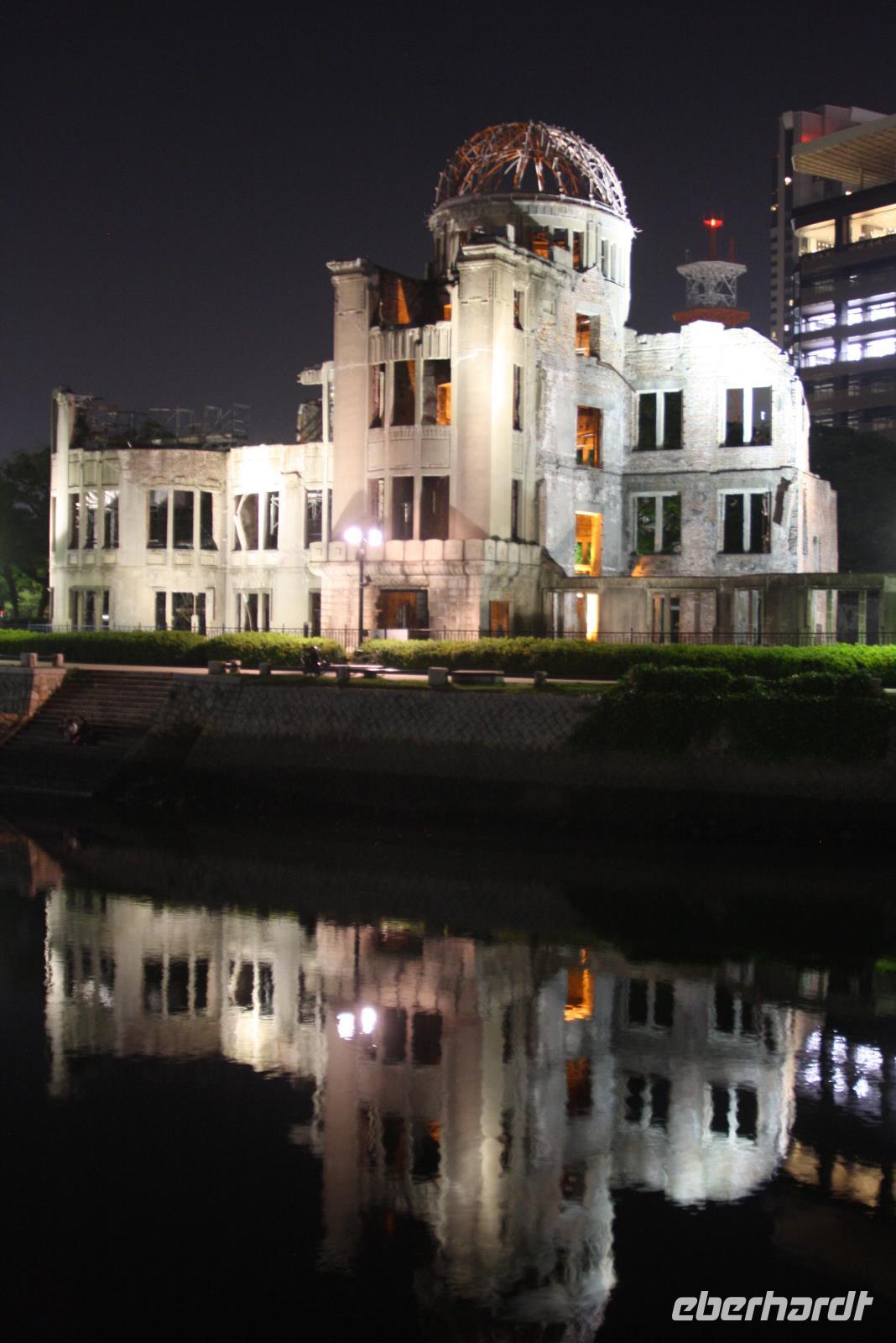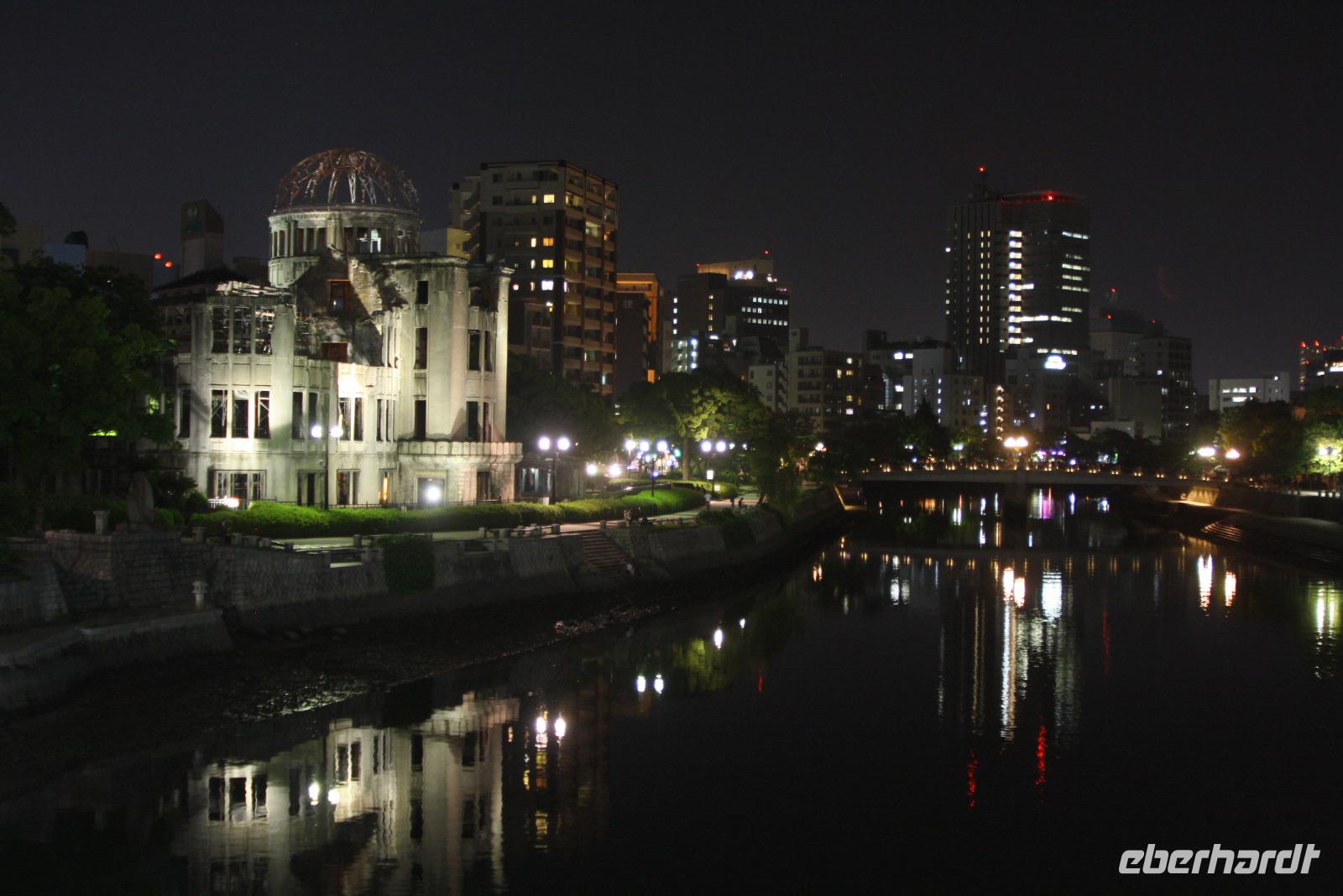 Per Shinkansen überwinden wir in kurzer Zeit die letzte Strecke bis Hiroshima. Dann folgen wir unseren Taxi-Kapitän zum Sunroute Hotel direkt am Ota-Fluss neben dem Friedenspark. Oliver organisiert uns zum Abendessen die Spezialität Hiroshimas: Okonomiyaki - eine Art Pfannkuchen aus Buchweizenfladen, Nudeln und je nach Wahl Ei, Speck, Käse oder Fleisch. Zum Abrunden des Tages spazieren wir auf dem Rückweg durch den schön beleuchteten Friedenpark.