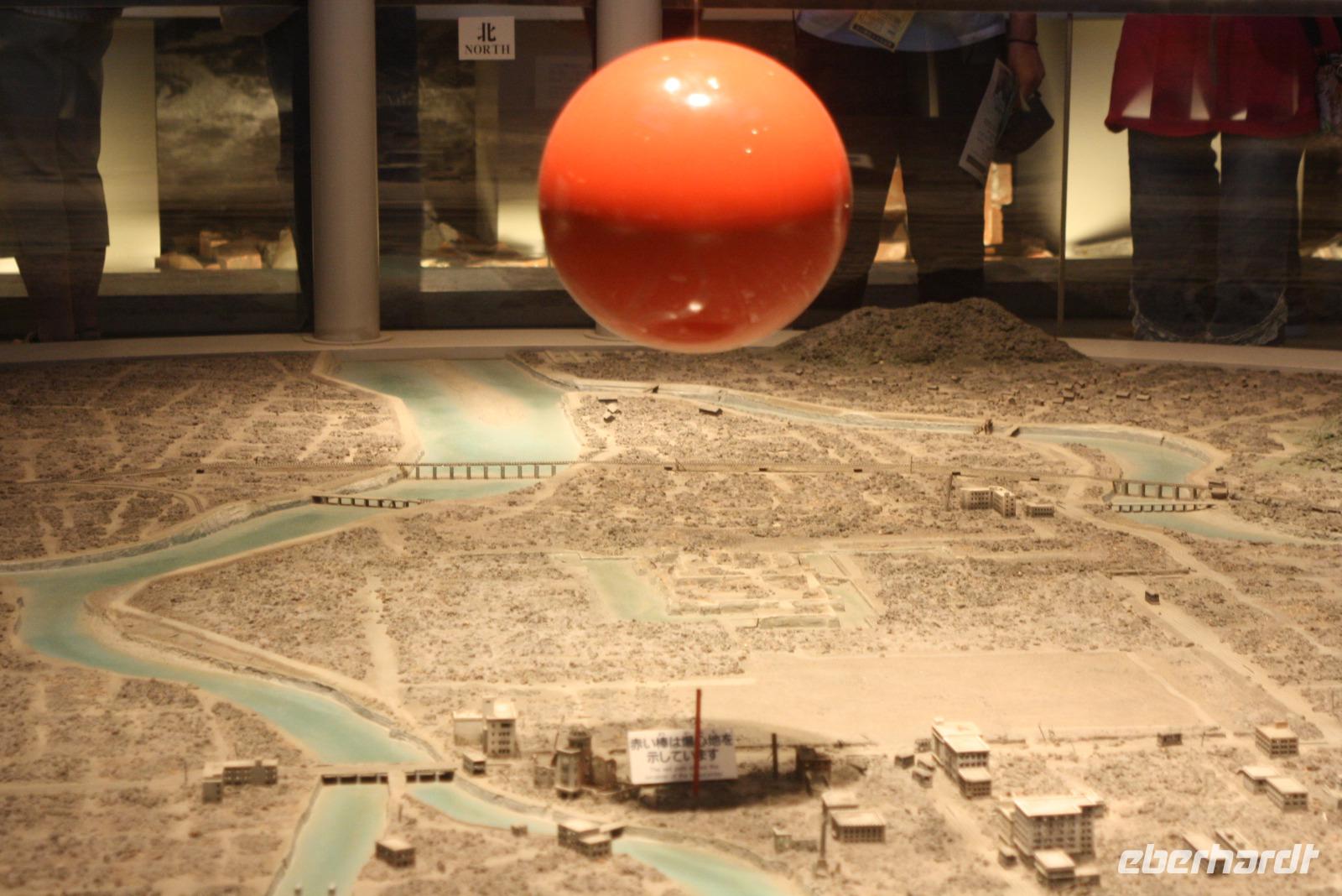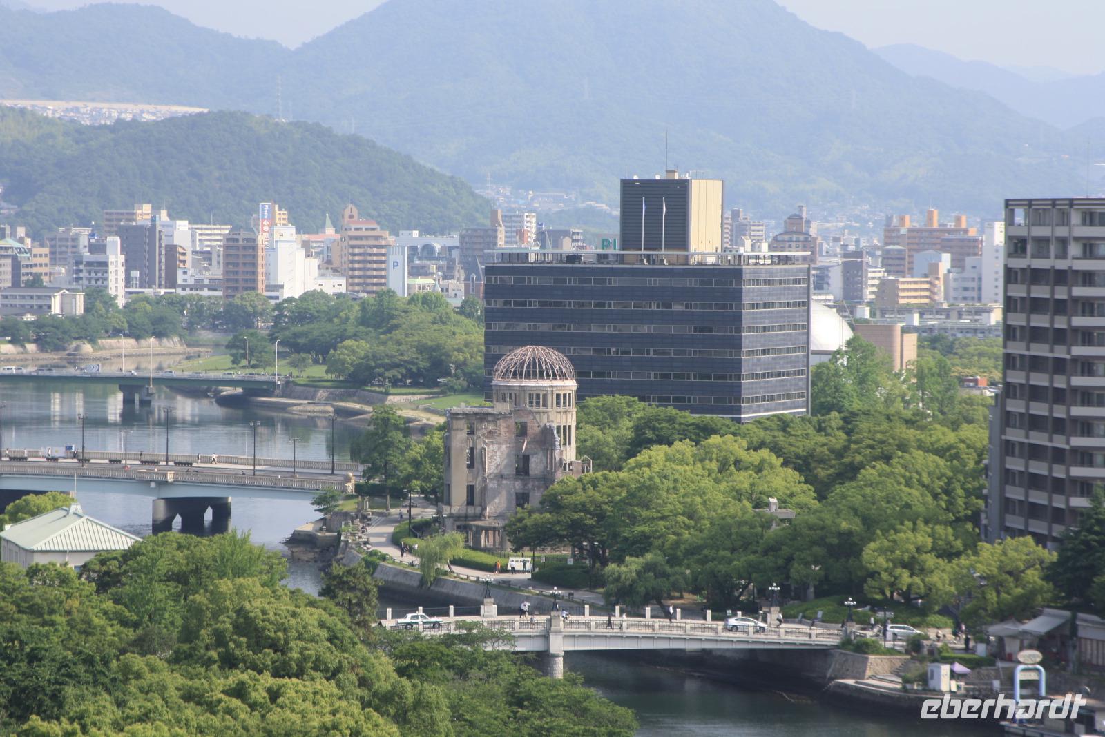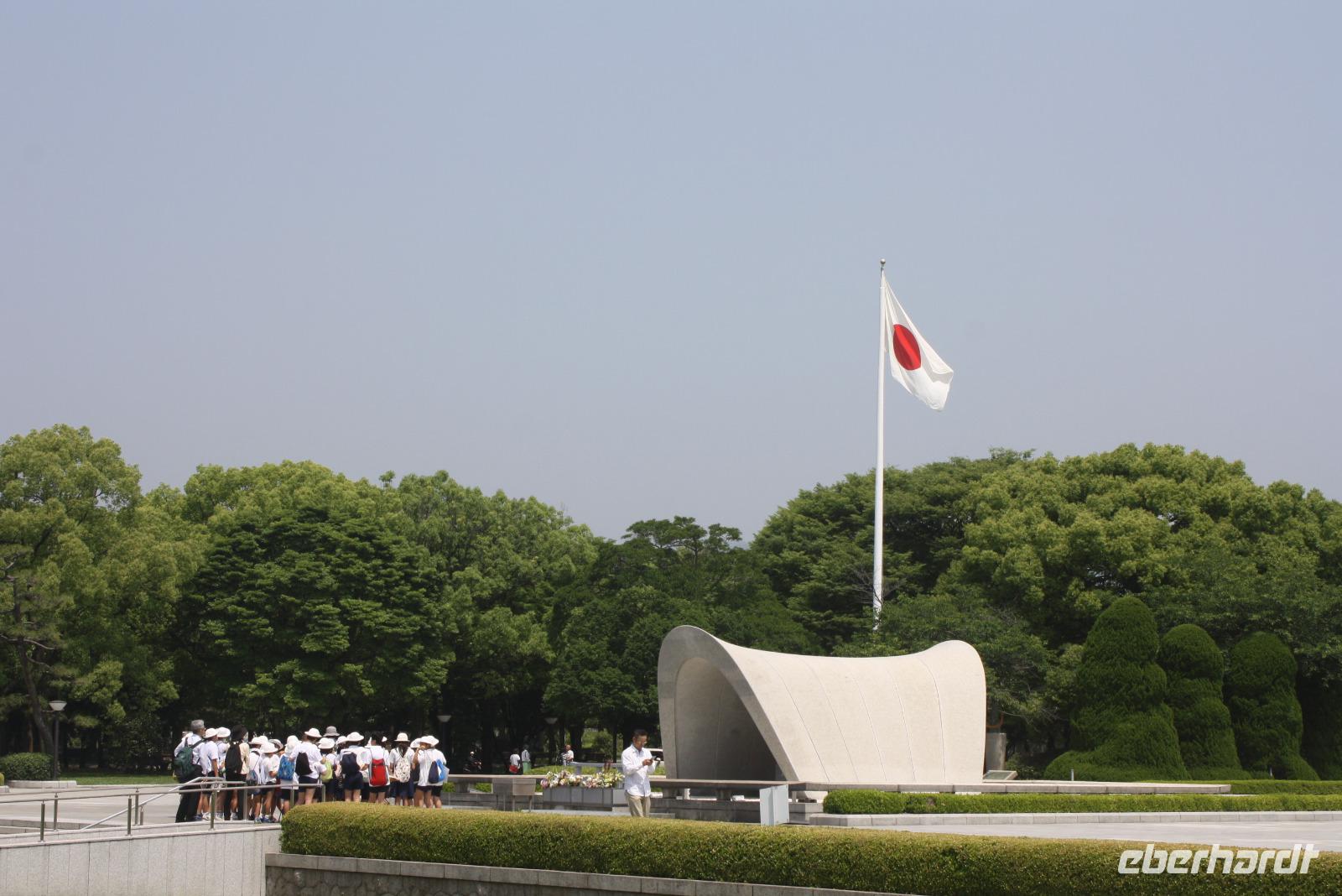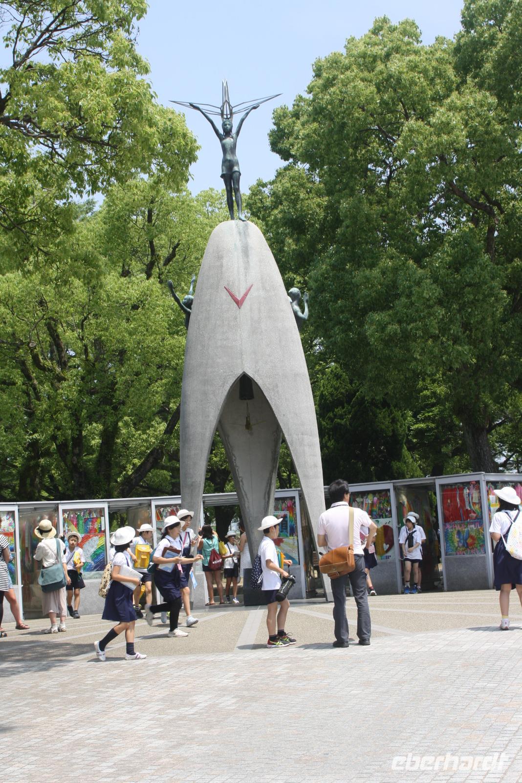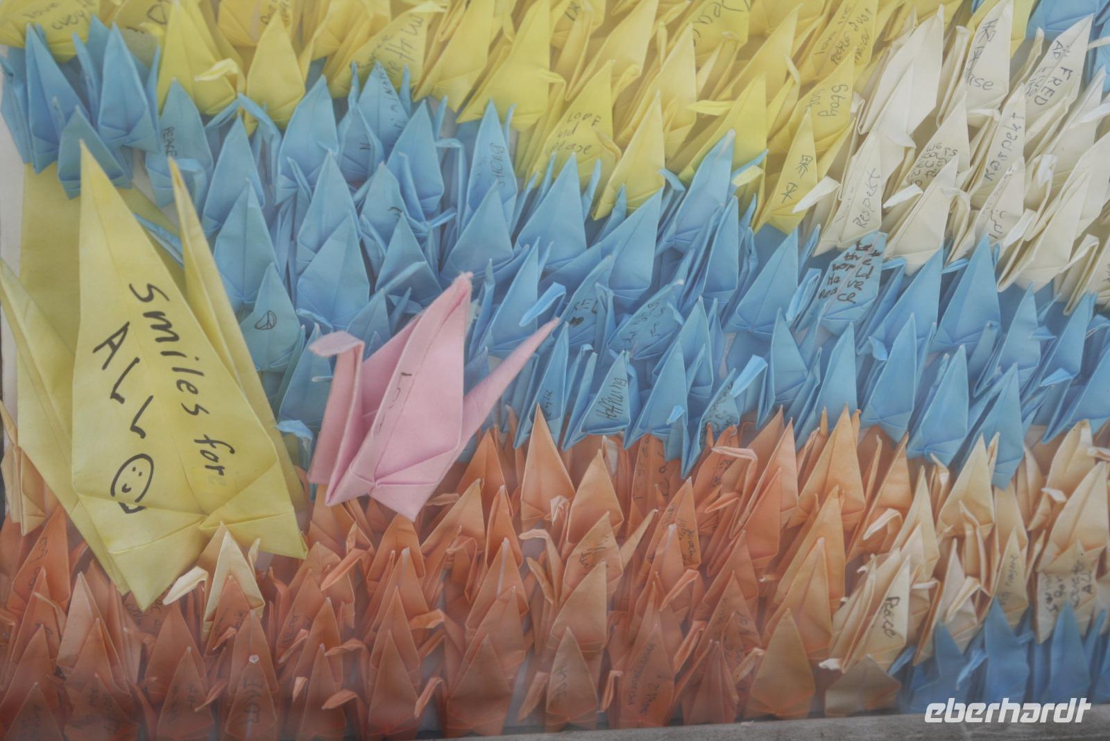 Gestärkt und gut gelaunt beginnen wir den Tag mit dem Besuch des Friedensmuseum und seine Parkanlage. Mitreißende Darstellungen lassen uns nachdenklich werden. Der Atombombenkuppel, die Ruine der ehemaligen Industrie- und Handelskammer, erinnern uns an Atombombenabwurf vom 06. August 1945. Einen Zeugen des Krieges begegnen wir: einer von zwei überlebenden Bäumen, davon ein Phoenixbaum, steht noch direkt neben dem Museum. Viele An der Gedenkstätte für das Mädchen Sasasuka werden täglich mehrere Ketten aus 1.000 gefalteten Kranichen gespendet. Unsere Reisegruppe leutet die Glocke als Gebet für den Frieden.
