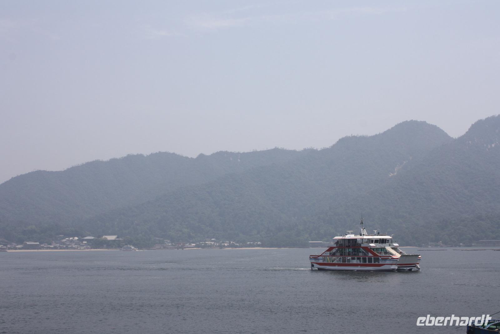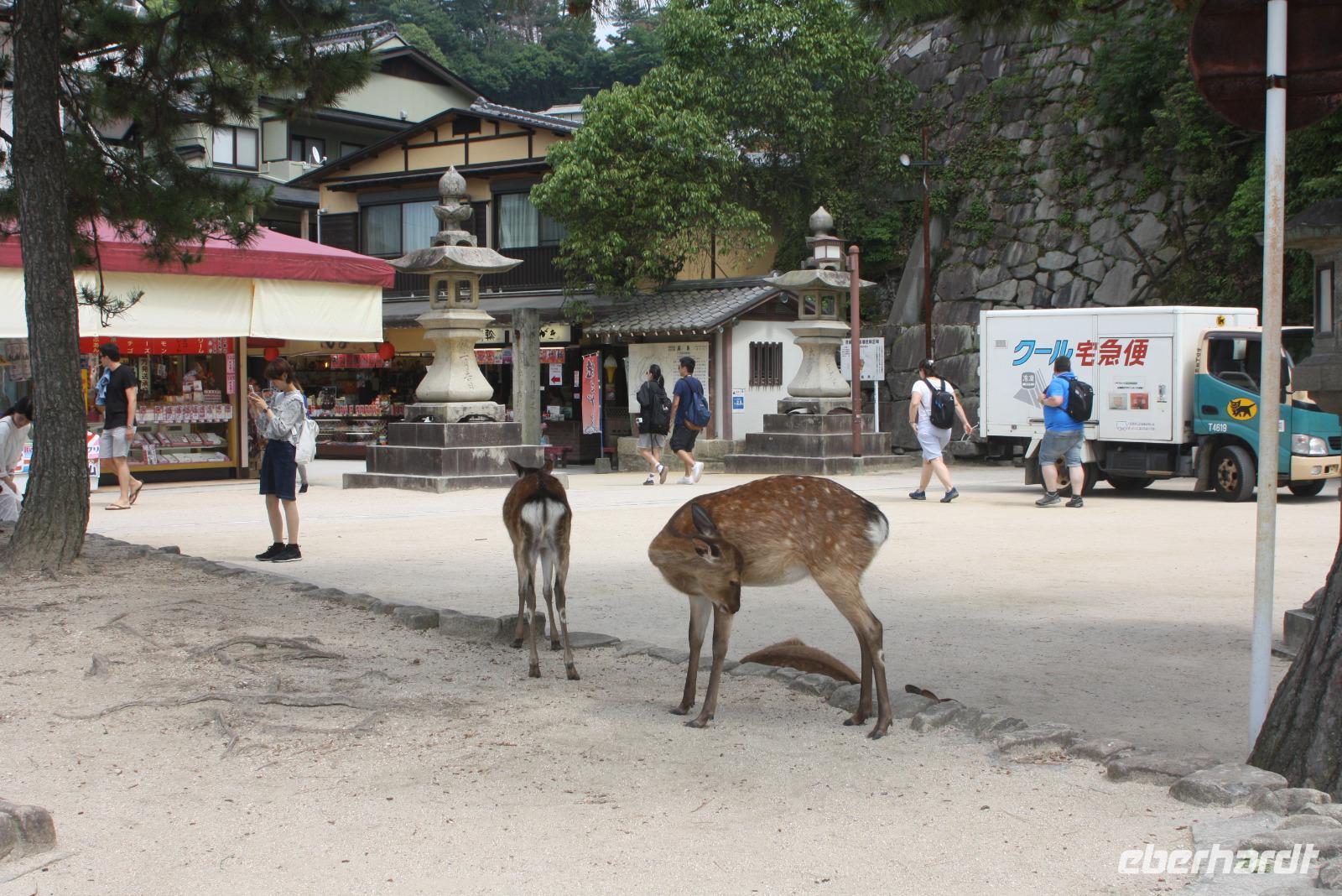 Mit der Straßenbahn, für die wir Rubbelfahrscheine erhalten, und per Fähre gelangen wir zur kleinen Insel Miyajimia. Es leben ca. 600 Einwohner auf dem Eiland. Der Boden gilt hier als heilig und es darf auf diesem weder geboren noch gestorben werden. Daher haben sich auch viele japanische Zwerghirsche angesiedelt, die friedlich zusammen mit Einwohner und Touristen leben. Miyajima produzierte früher viele Holzlöffel zum Reisekochen (Chamuchi). Inzwischen lebt man hauptsächlich vom Tourismus, aber die vielen Holzlöffel sowie der weltweit größte seiner Pracht sind hier zu finden.