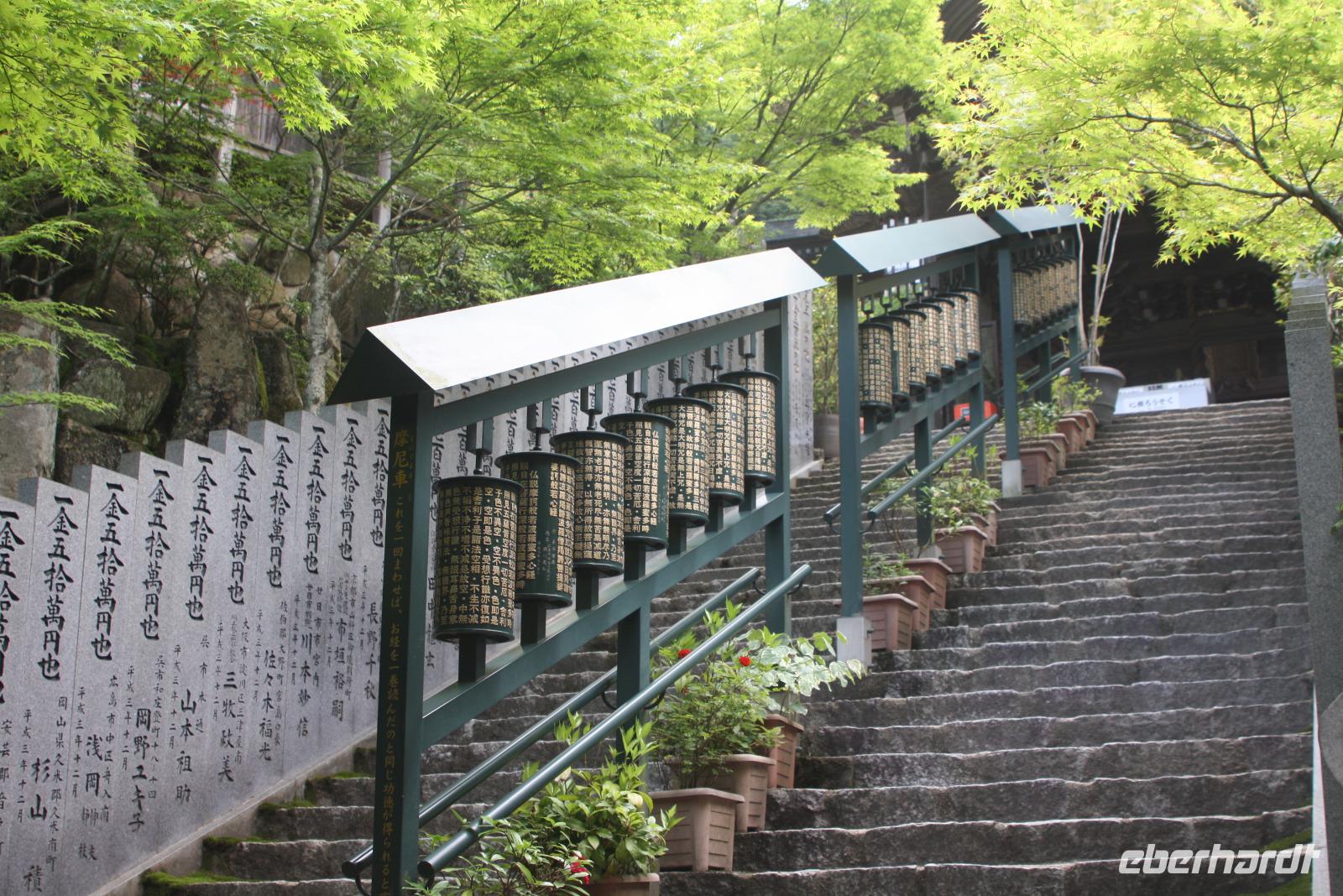 Jetzt besichtigen wir das Wahrzeichen der Insel, dem Itsukushima-Schrein mit dem roten Tori (Tor) im Meer. Vorbei am ältesten No-Theater der Welt, wo buddhistische Sutrengesänge, Flöten- und Trommelmusik aufgeführt werden, zeigt uns Oliver einen seiner Lieblingsorte der Insel: dem Daisho-In-Tempel. Er steht zwar nicht auf unserem Programm, aber Oli dreht gern diese Extra-Runde mit uns. In einer Höhle hängen aberhunderte Laternen an der Decke und versprühen eine besondere Atmosphäre.