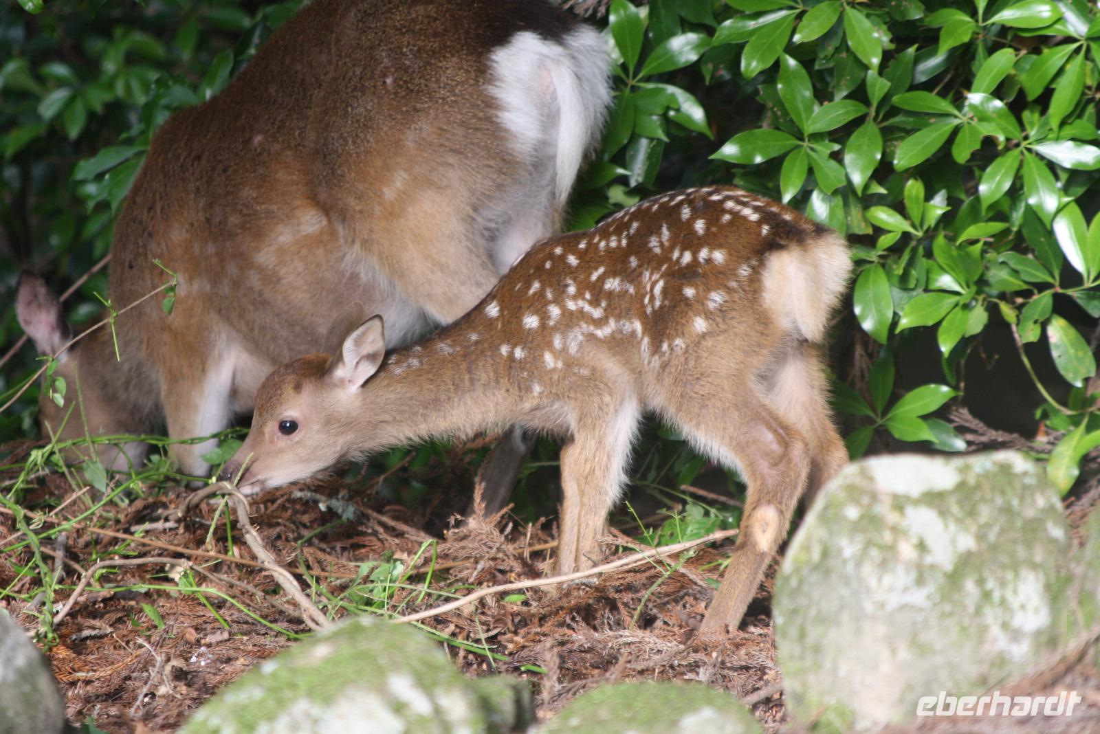 Bevor es zum Itsukushima-Schrein mit dem roten Tori (Tor) im Meer geht, naschen wir Fischkuchen am Spieß oder schlürfen eine gegrillte Auster. Nur Vorsicht, zahme Rehe fressen alles und sind sofort da, wenn wir Lebensmittel in den Händen halten. Außerdem knabbern sie auch gern an geblümten Kleidern und Reiseleitern herum, bemerken wir.