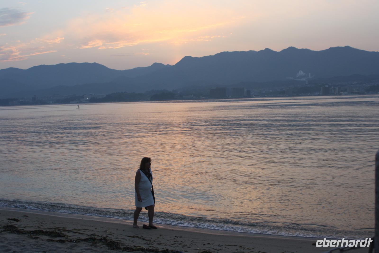 Das Abendessen nehmen wir in einem Restaurant mit dem Logo eines japnaischen Marders, wieder eine endemische Art, ein. Ja, es gibt wieder Aal. Doch dieses Mal ist es fünf-fach-gegrillter Salzwasseraal mit eingelegtem Gemüse und süßem Gourmetreis. Zum Abschluss ergötzen wir uns am dem herrlichen Anblick des mit warmem Sonnenlicht bestrahltem Tores und die Spiegelung des Sonnenuntergangs auf dem Wasser.