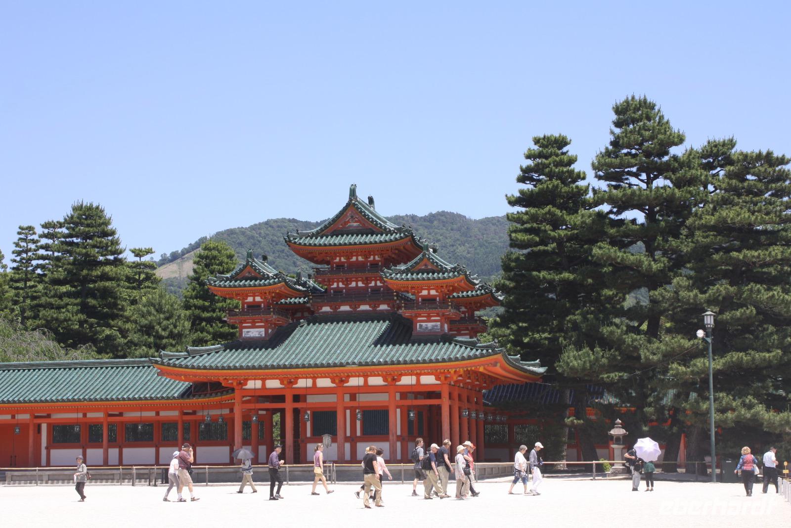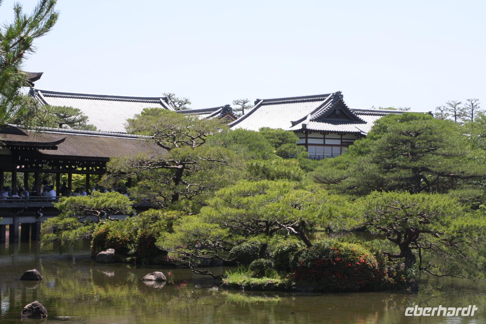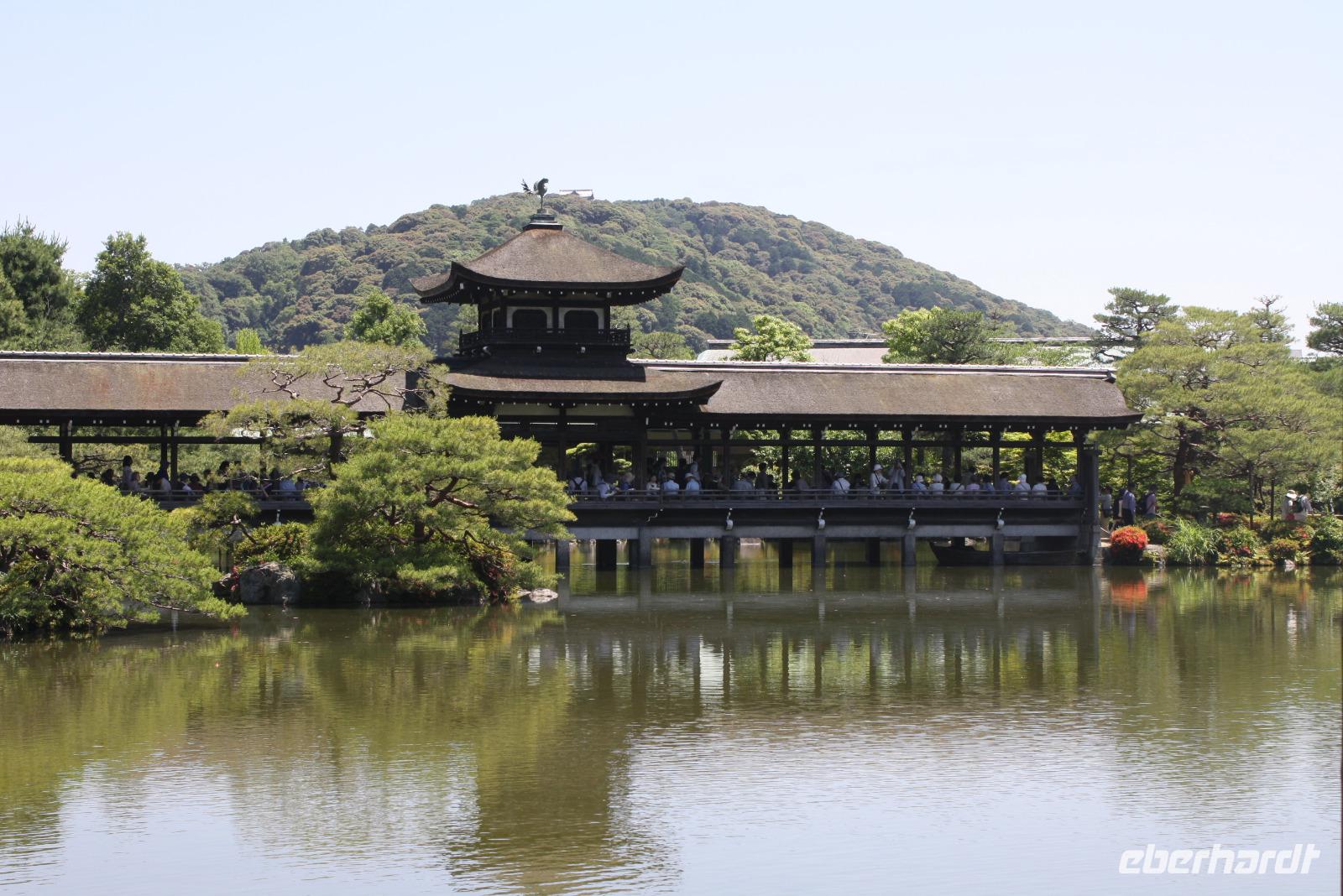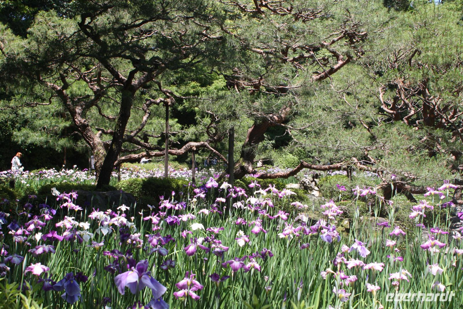 Der letzte aber eines der schönsten Schreine ist der Heian Jingu-Schrein. Anders als die meisten bedecken ihn grüne glasierte Ziegel und wird von einem wundervollen Wandelgarten umgeben (meist sind die Zen-Gärten immergrün). Gerade dürfen wir die prächtig violetten Schwerlilien bewundern. Gegenüber dem Schrein befindet sich das größte Holztor Japans.