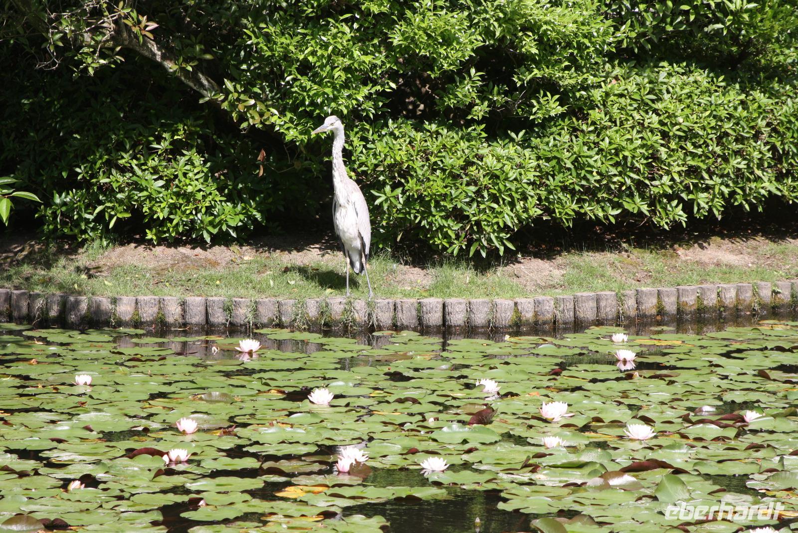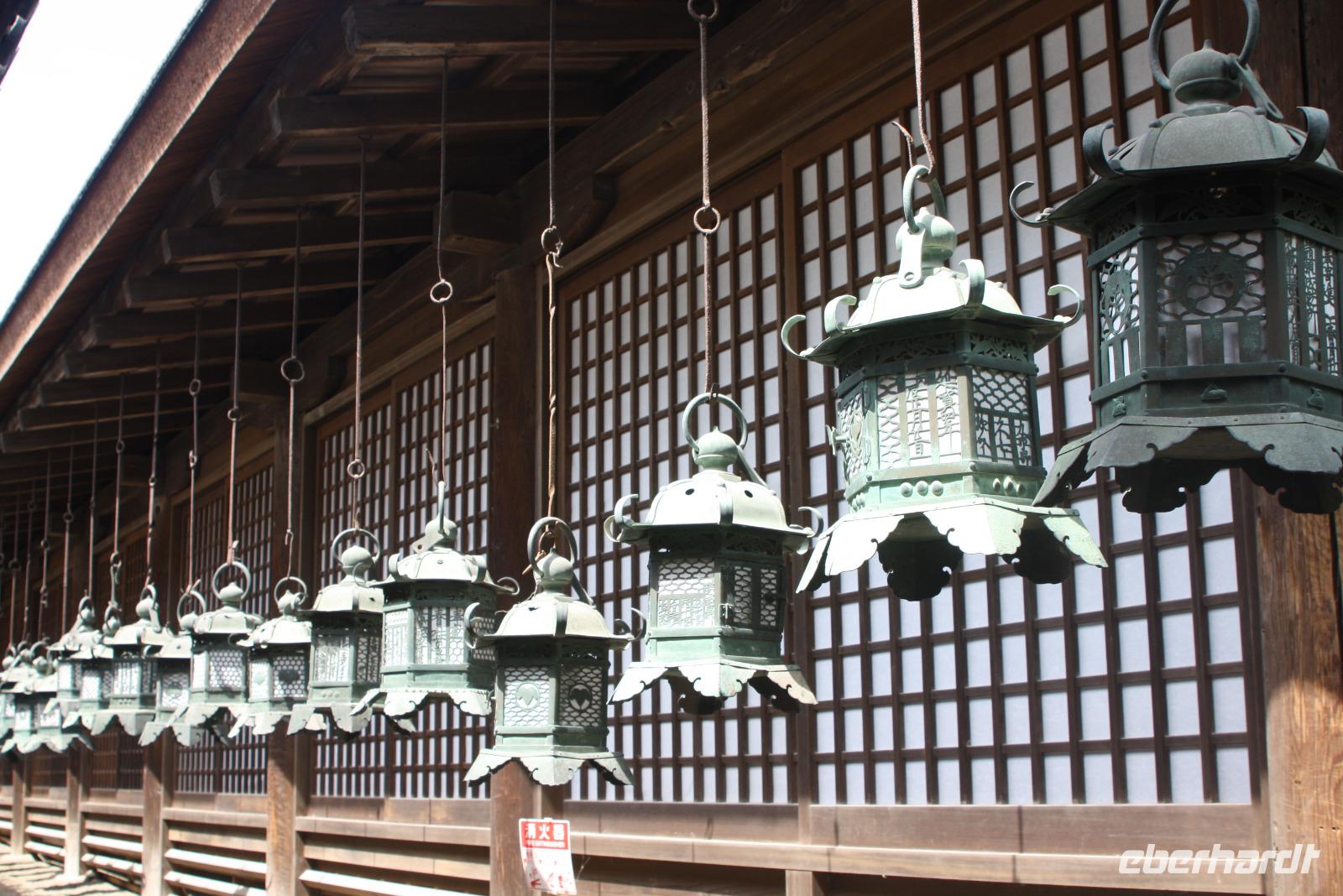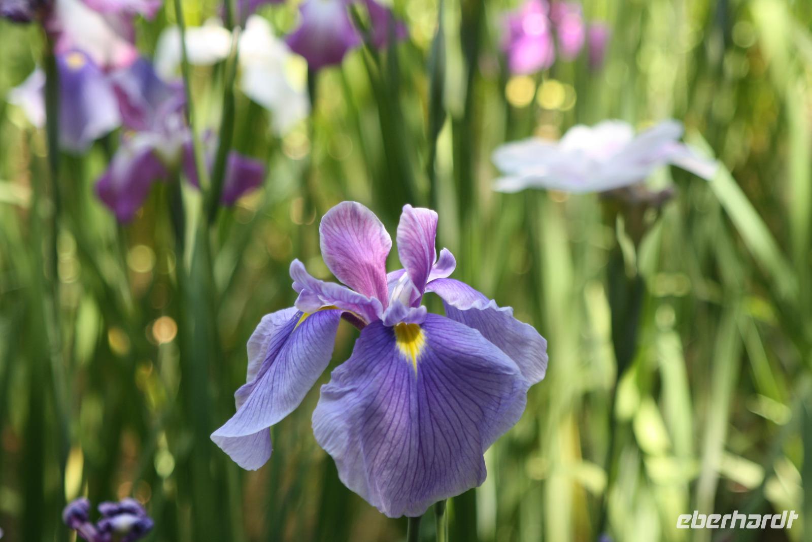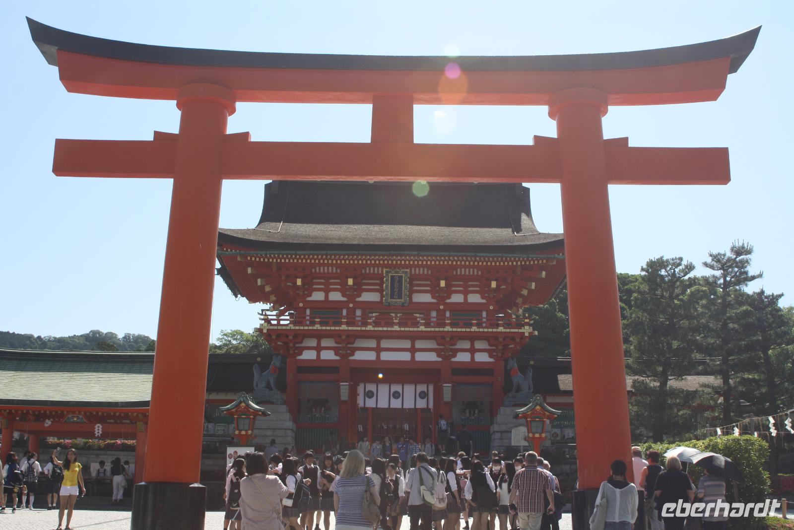 Der letzte aber eines der schönsten Schreine ist der Heian Jingu-Schrein. Anders als die meisten bedecken ihn grüne glasierte Ziegel und wird von einem wundervollen Wandelgarten umgeben (meist sind die Zen-Gärten immergrün). Gerade dürfen wir die prächtig violetten Schwerlilien bewundern. Gegenüber dem Schrein befindet sich das größte Holztor Japans.