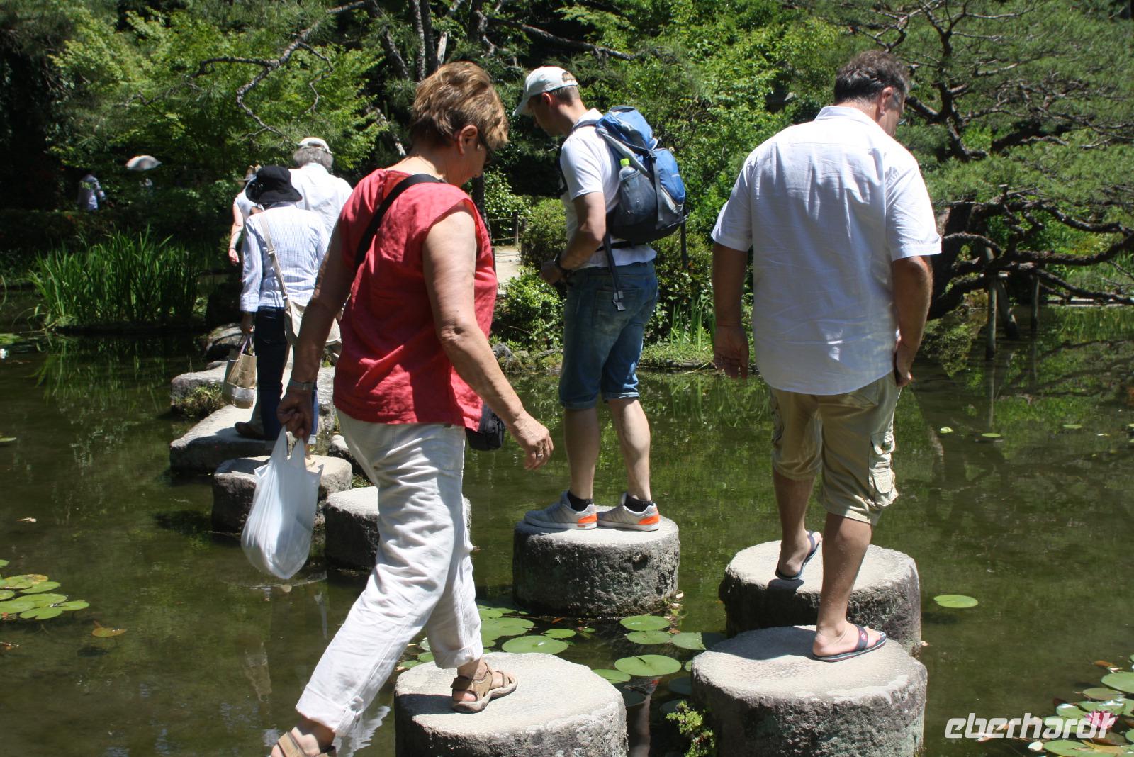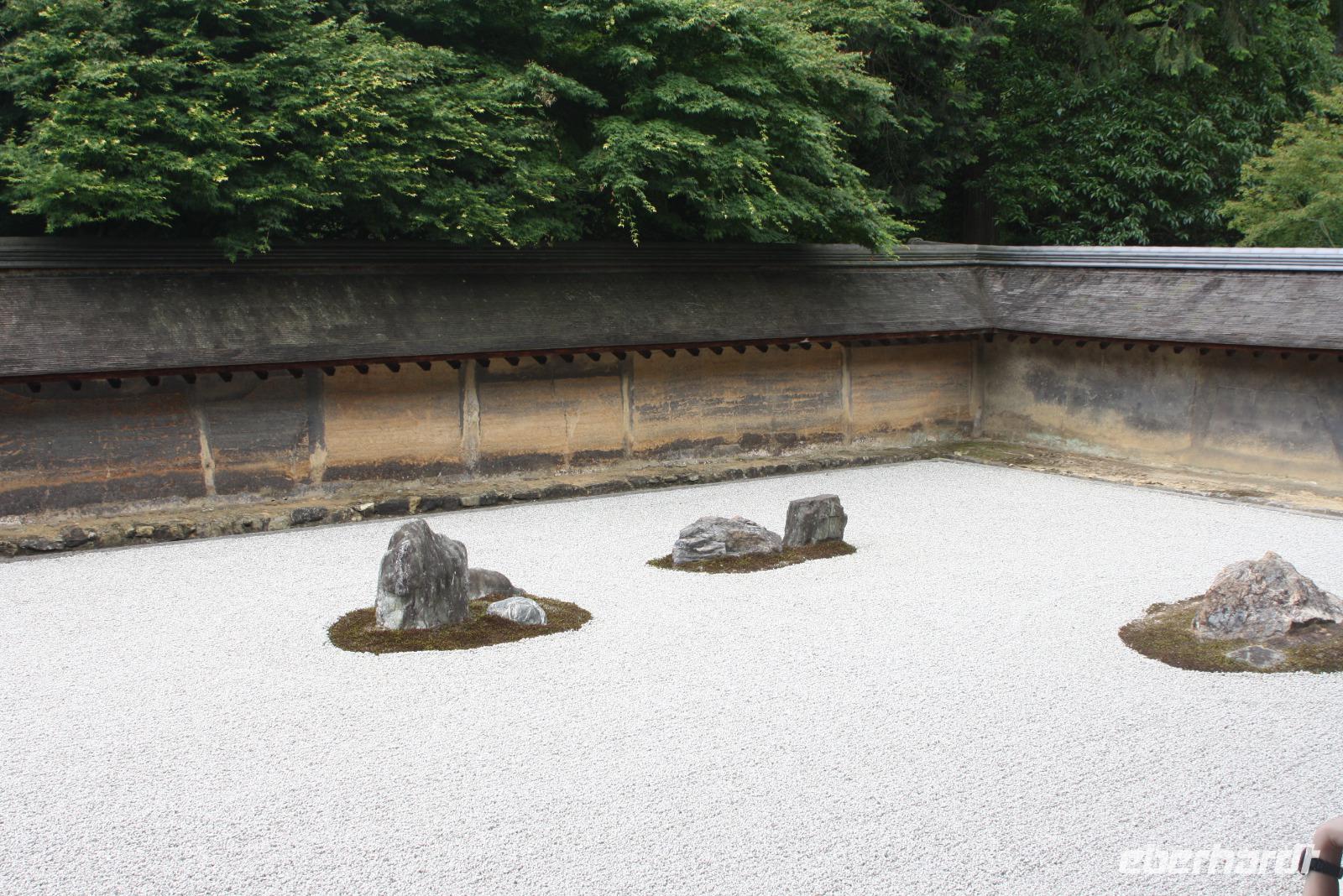 Oliver zeigt den ersten Tempel: Royanji Zen. In ihm werden 80 Mönche ausgebildet. Der bekannteste Fleck ist der Sandgarten mit 15 Steinen. Alle 15 Steine sind nur von einer Stelle aus zu sehen. Es soll zeigen, dass unser Bewusstsein genau wie der Betrachter meist nicht alles sieht, sondern vieles unbewusst geschieht und bleibt. In jedem Zen-Tempel wird auch ein Rätsel aufgestellt, der den Besucher zum Nachdenken bringen soll.