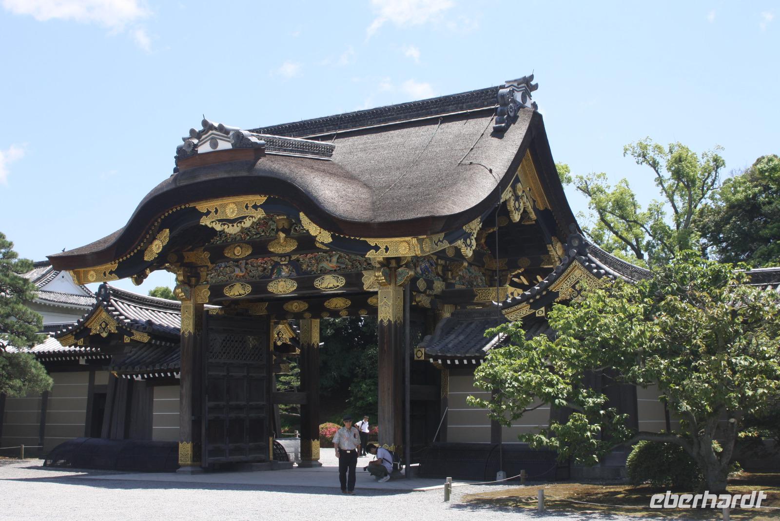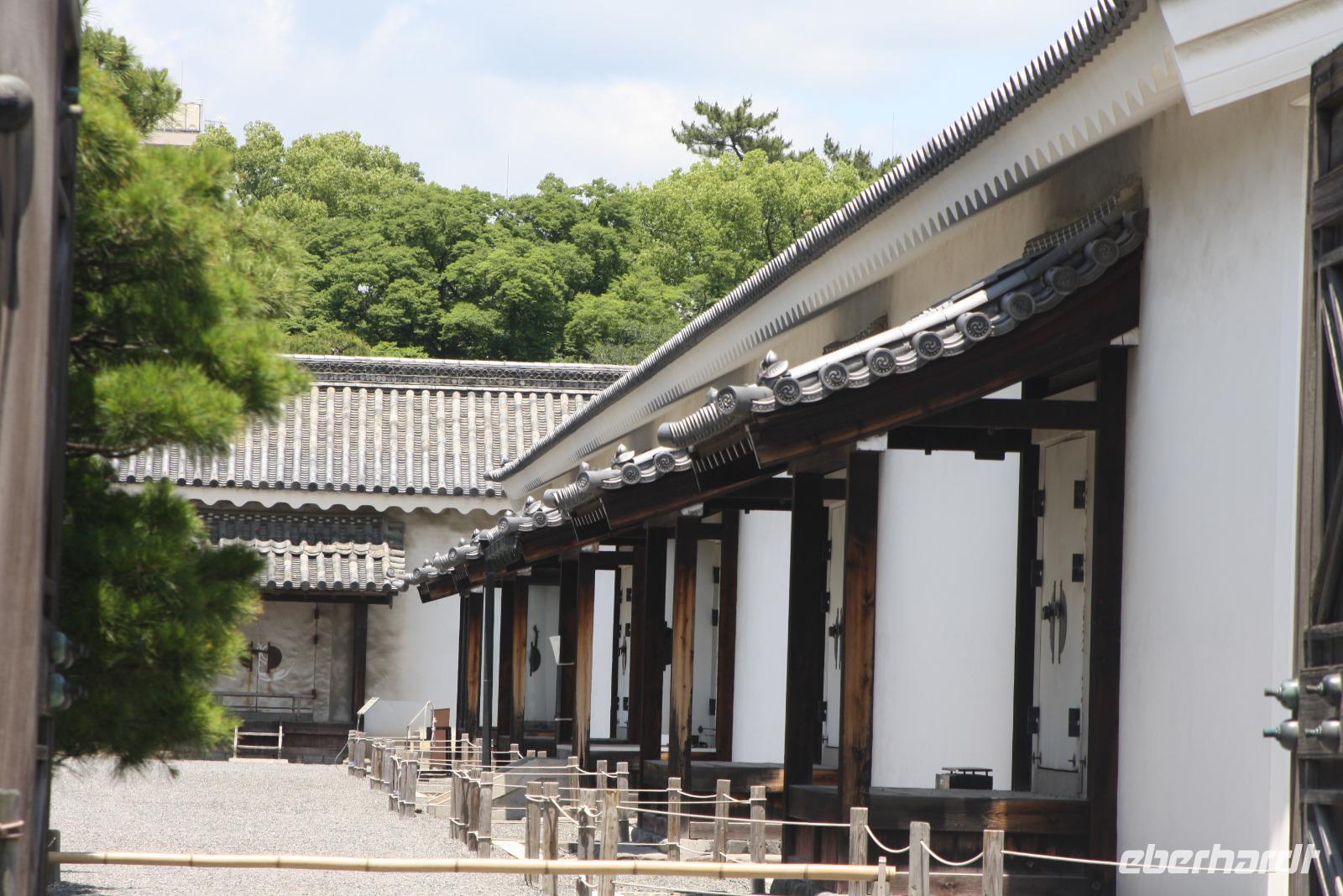 Nächster Stopp: Nijo-Schloss: Ab 1601 wurde 25 Jahre lang an dem Schloss gebaut. Die wunderschön auf Papier bemalten Deckengemälde, aufwändige Bronzebeschläge und dunkle Holz versetzen uns während der Führung in die alte Edo-Zeit. Wir erfahren interessante Geschichten und Mysterien über das Leben der Samurai.