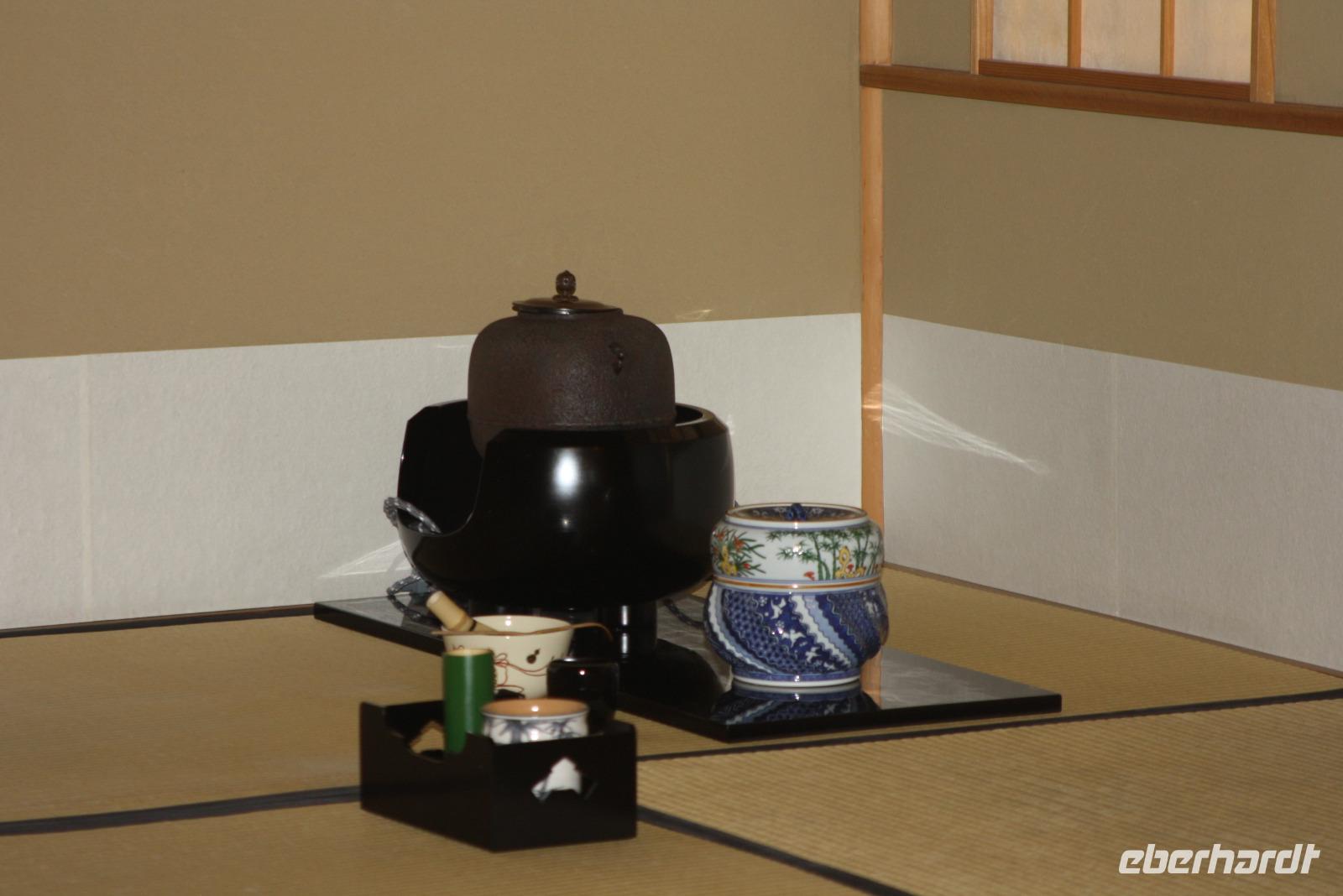 Am Nachmittag gibt es die Möglichkeit, eine japanische Teezeremonie zu erleben. Eine Teemeisterin erklärt uns wie der Ablauf einer Zeremonie ist, was für Aufgaben der Gast sowie der Gastgeber haben und weist uns in die Zubereitung und dem Trinken von Matcha-Tee. Matcha-Tee wird aus den oberen Blättern der Teepflanze hergestellt uns zu feinstem Pulver zerkleinert. Ein bitterer, sehr vitaminreicher grüner Tee, der aber mit den dazu gebotenen Süßigkeiten gut bekömmlich ist. Er ist wohl nicht ohnehin eines der teuersten Grünteesorten der Welt.