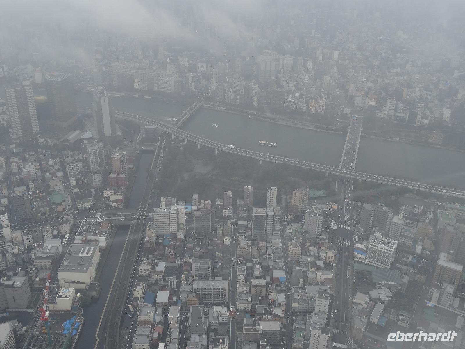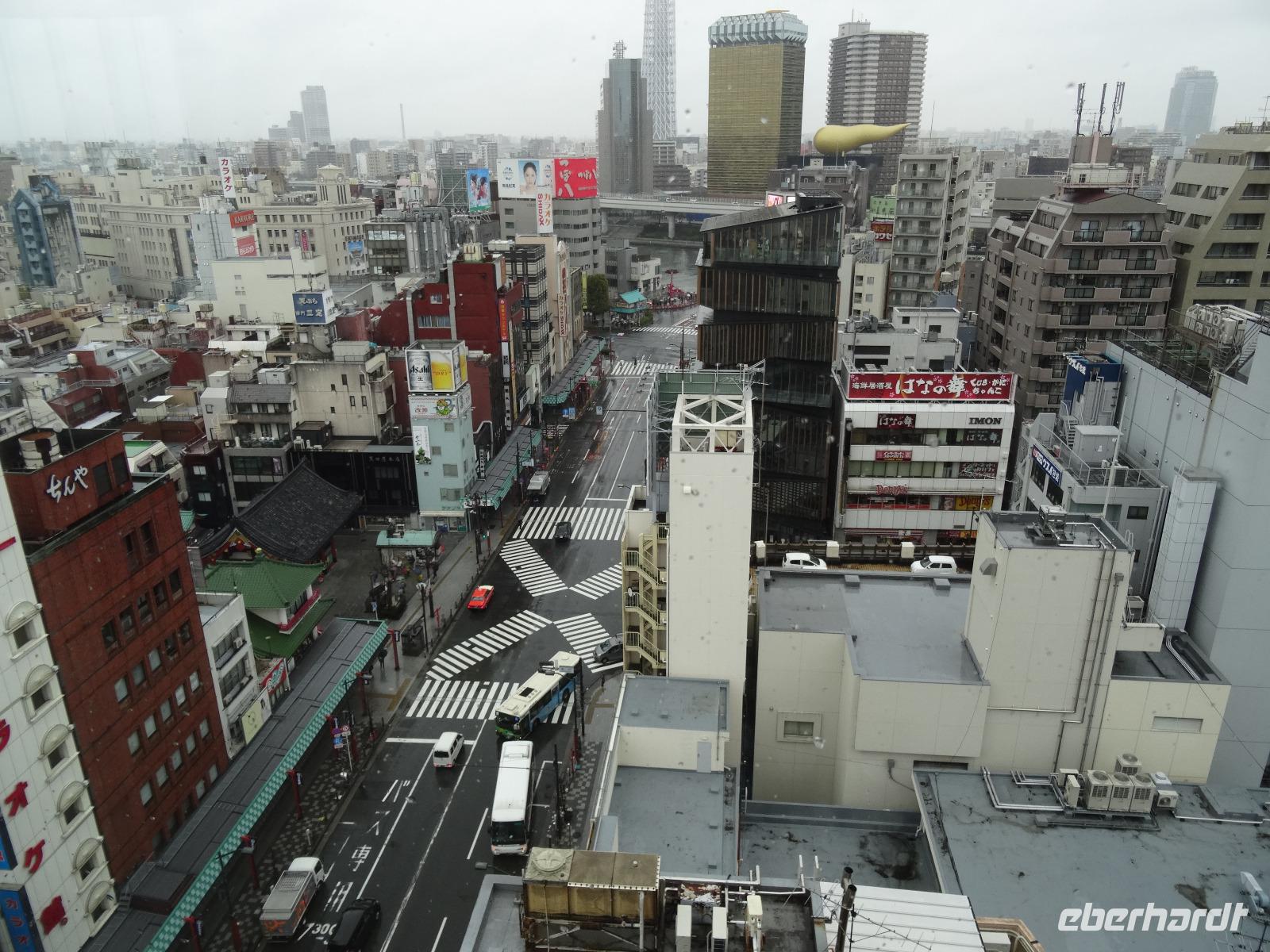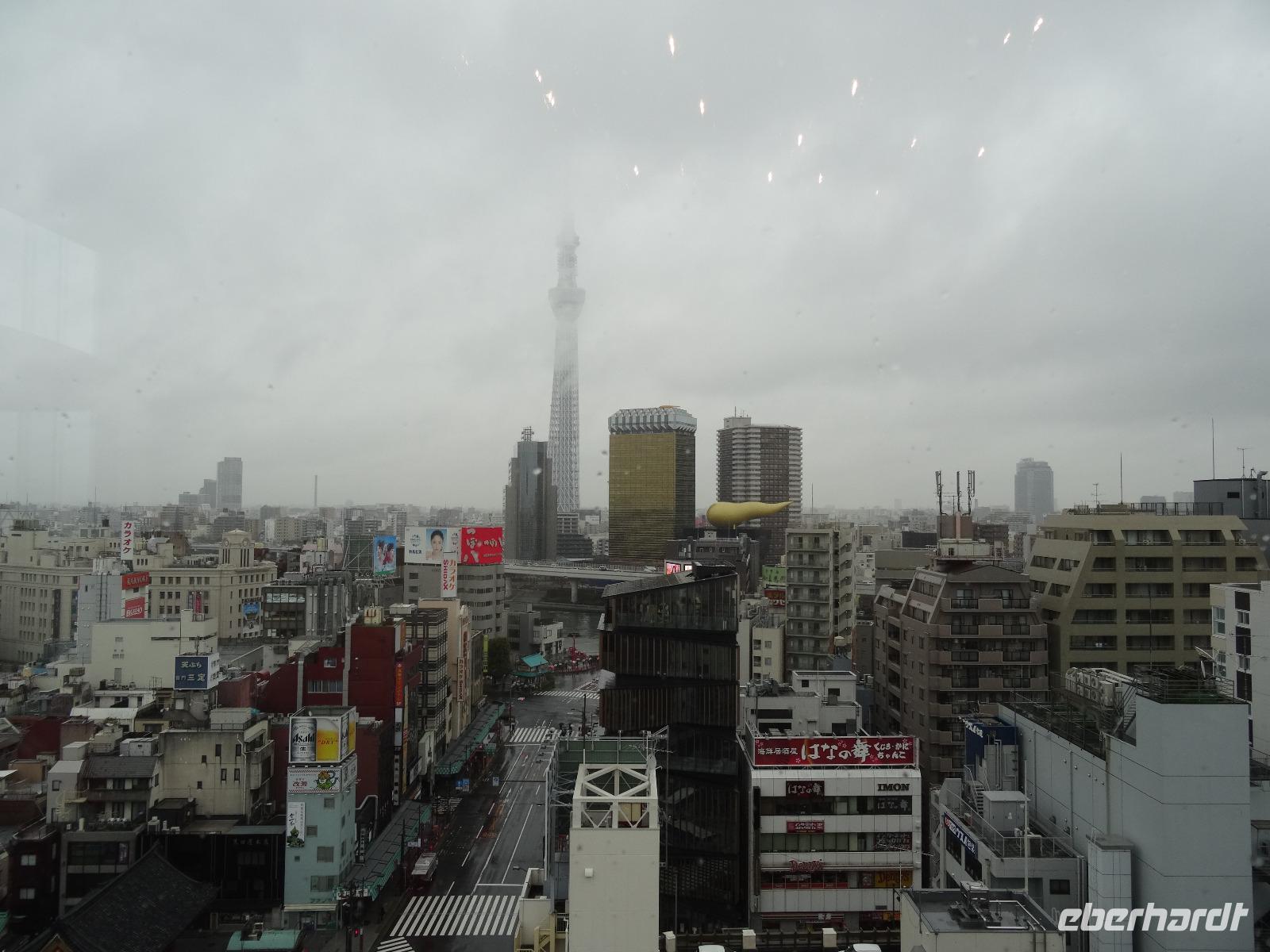 Ist man aber erst einmal vor Ort, wird, wie überall auf der Welt, aus vermeintlichem Wissen Halbwissen, aus manifestiertem Denken staunendes Erfahren und Erfühlen. Dies sollten wir im Verlauf unserer Reise noch oft genug vor Augen geführt bekommen. Ein elfstündiger Flug führte uns über Russland und die karge, sibirische Taiga nach Tokio, wo wir am frühen Nachmittag auf dem Flughafen Haneda landeten. Nach der obligatorischen Einreiseprozedur mit Foto und Fingerabdruck sammelten wir unsere Koffer ein und traten hinaus in das Japan unserer mitgebrachten Vorstellungen. Unsere Reiseleiterin Kerstin, welche mit uns aus Frankfurt gekommen war, parlierte im besten japanisch und geleitet uns zuerst zu unserer hauptstädtischen Unterkunft. Nach dem schnellen Zimmerbezug im Hotel The Gate Kaminarimon trafen wir uns alle wieder und absolvierten den ersten Programmpunkt auf japanischem Boden, eine Auffahrt auf den SkyTree, den 634 Metern hohen Fernsehturm, das Wahrzeichen Tokios. Aus dreihundertfünfzig Meter Höhe kann man bei schönem Wetter die Viel-Millionen-Stadt zu seinen Füßen bewundern. Bei schönem Wetter kann man auch den perfekten Kegel des Fuji in der Ferne bestaunen. Bei schönem Wetter... hatten wir aber nicht. Wir erhaschten aus dreihundertfünfzig Metern Höhe ab und an einen Blick auf das regennasse Tokio, sofern die sich wandelnde Wolkendecke das zuließ. Diesig, grau und unfreundlich präsentierte sich die Metropole an der gleichnamigen Bucht, was einerseits sehr schade war, andererseits oftmals aber die Realität des Reisens widerspiegelt. Die stimmungsvollen Bilder der einschlägigen Reiseführer sind über Monate oder gar Jahre unter den günstigsten Bedingungen entstanden und zusammengesammelt wurden, da sollte es jedem Reisenden klar sein, dass man in einer Zeitspanne von knapp zwei Wochen nur sehr selten vergleichbare Bilder bekommen wird. Wir ließen uns davon aber nicht die Stimmung vermiesen, sondern freuten uns auf die Eindrücke und Erfahrungen der kommenden Tage. Gleich unser erstes Abendessen in einem Izakaya Restaurant bescherte uns neue Erfahrungen, hieß es doch beim Betreten des Restaurants: Schuhe ausziehen! Was für uns Europäer ungewohnt ist, hat in Japan Tradition. Entweder bemächtigt man sich vereinzelt herumliegender "Hausschlappen", oder man lässt die Füße unbeschuht in der Vertiefung unter dem Tisch verschwinden. Anschließend genossen wir eine sehr leckere Speisenfolge, bestehend aus Salat, verschiedenen Gemüsen, unterschiedlich verarbeiteten Meeresfrüchten, Hühnchen, Fleischpasteten und vieles mehr. Darüber hinaus stießen wir auf zwei Geburtstagskinder und ein Hochzeitspärchen in unserer Gruppe an, bevor wir müde von den ersten Eindrücken zu Bett gingen.