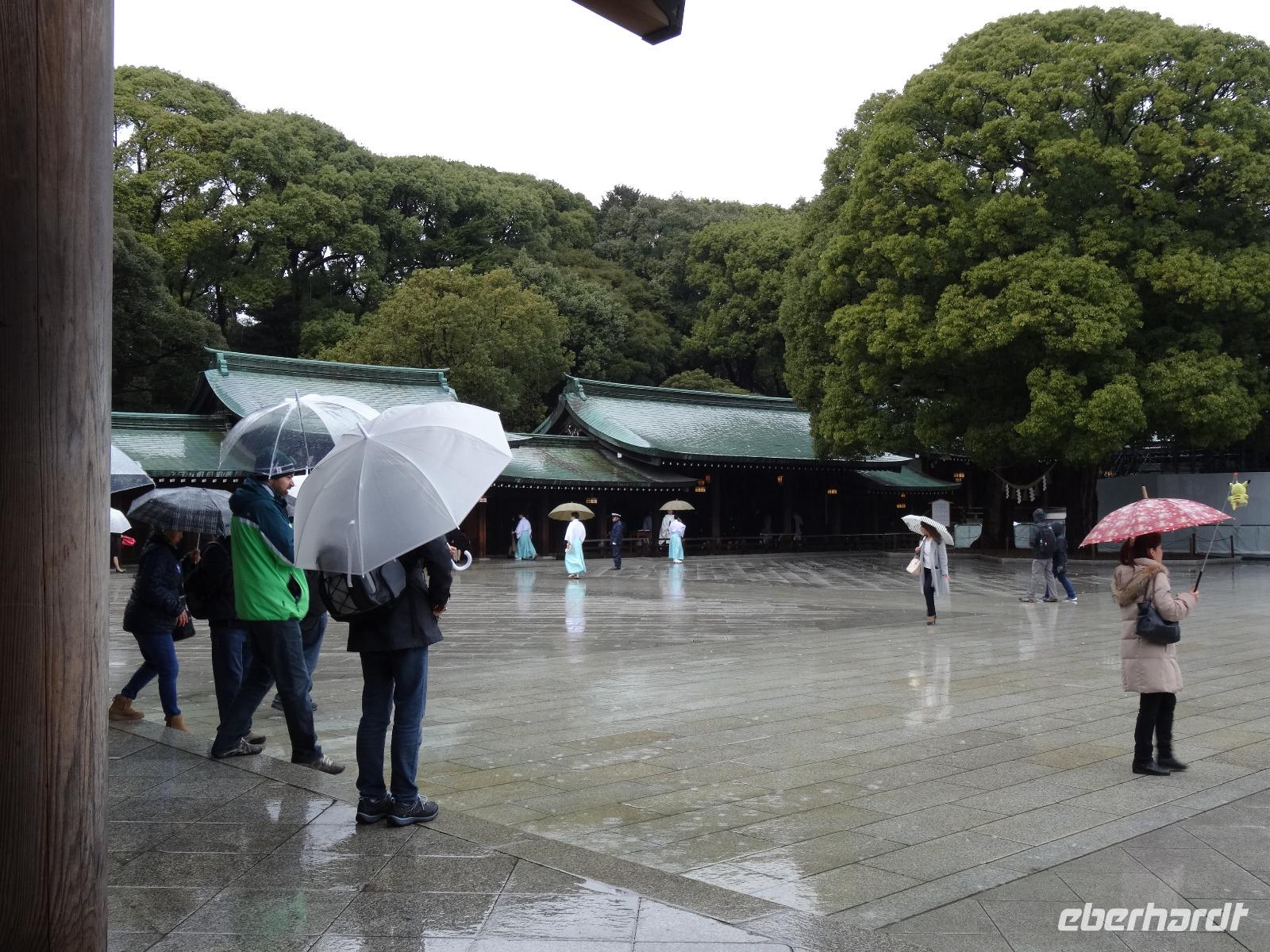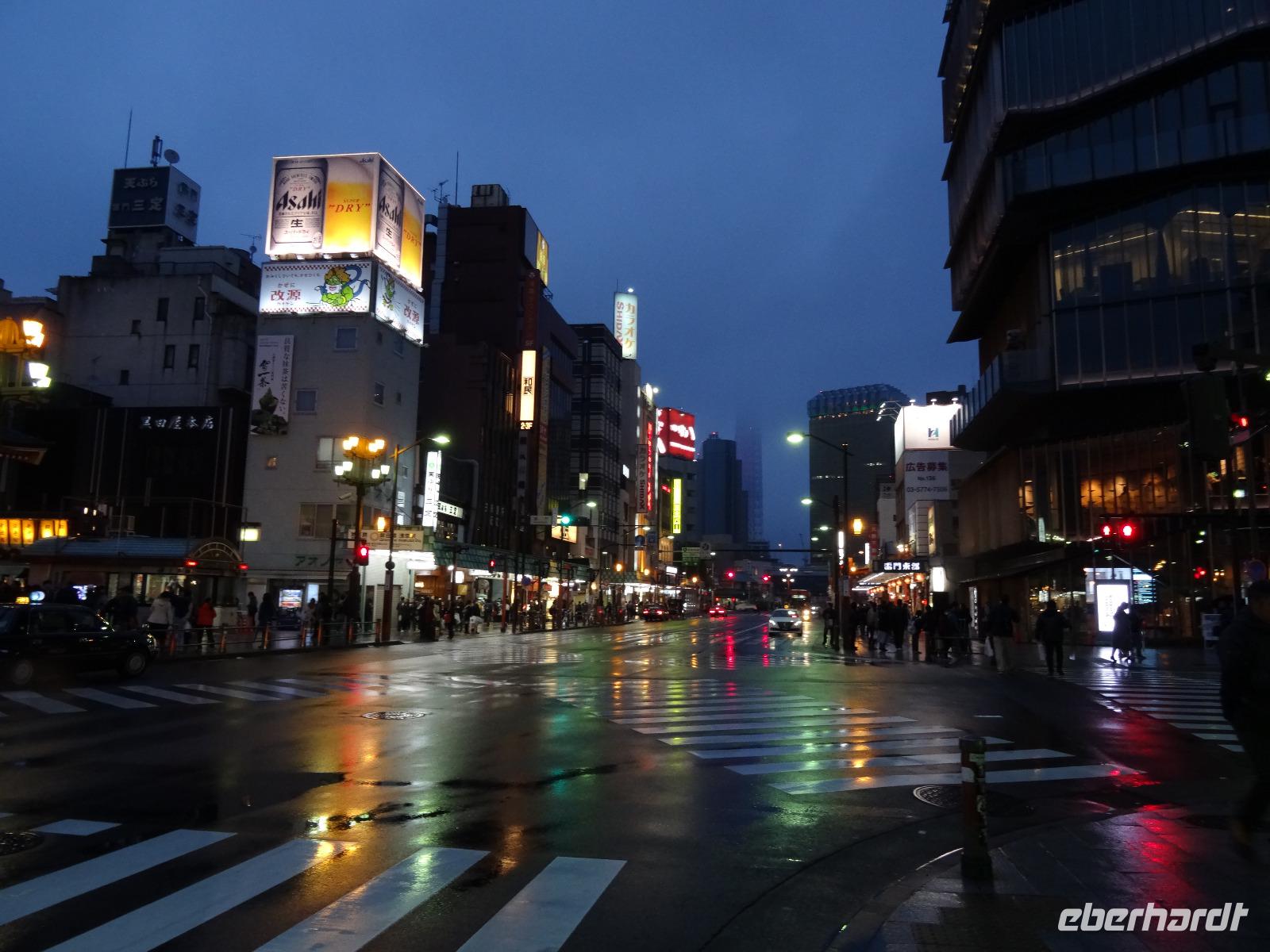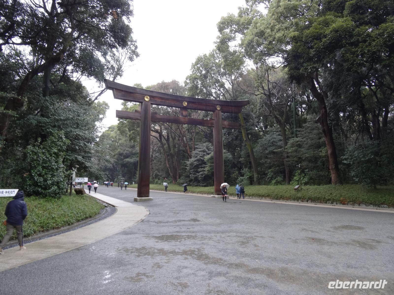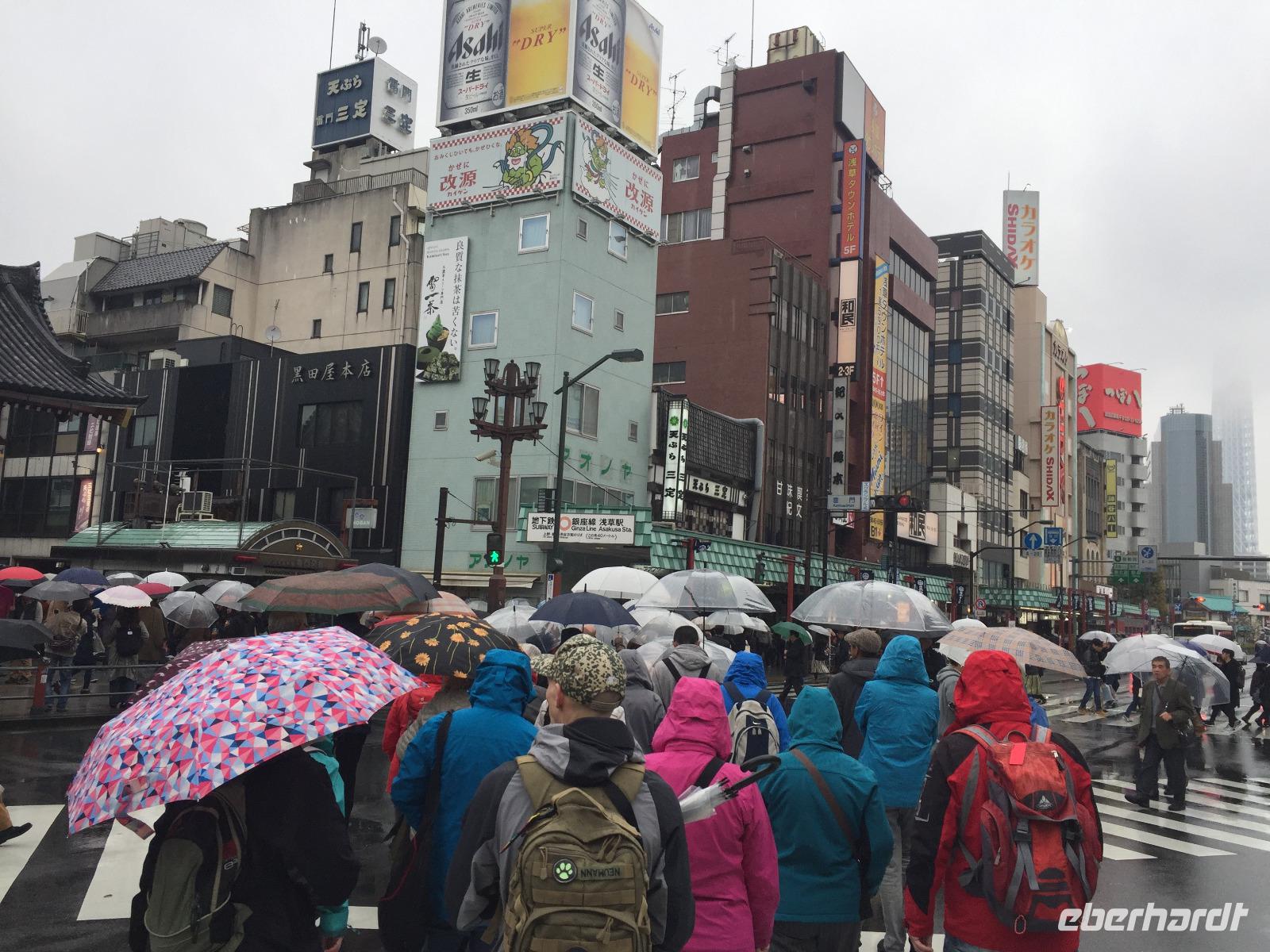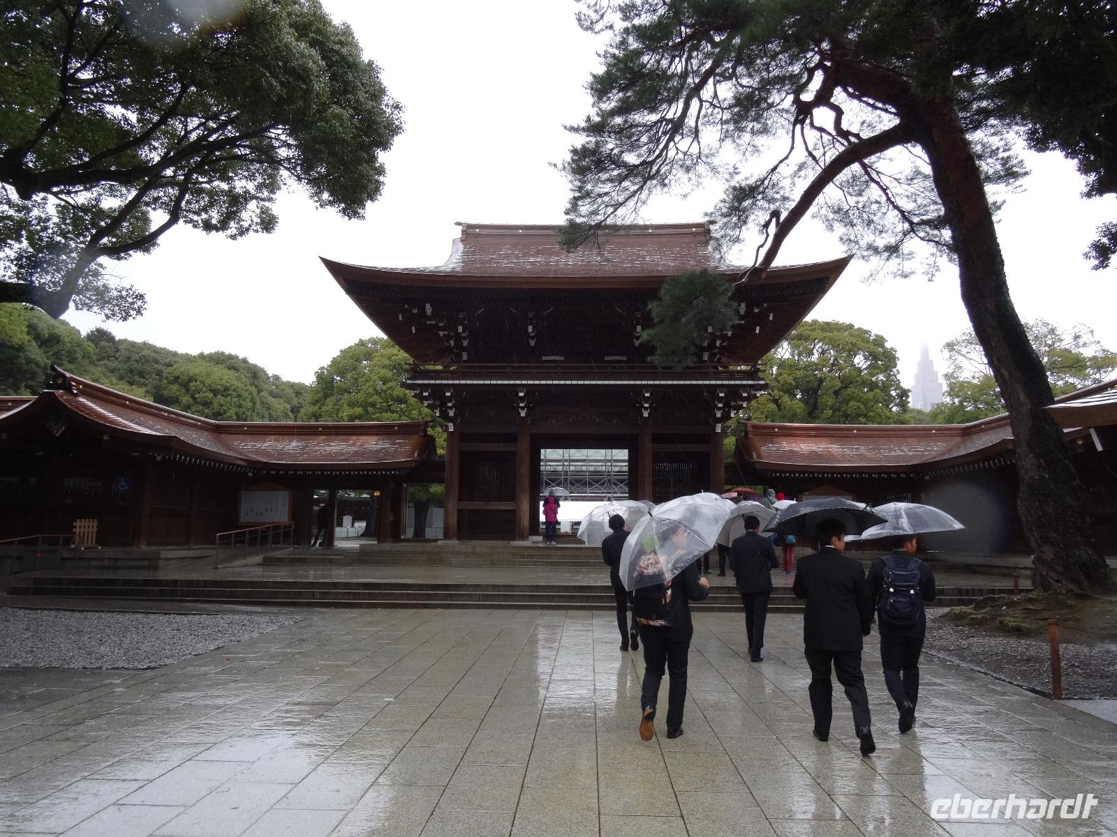 Nach einer erholsamen Nachtruhe und einem kleinen, aber feinen Frühstück stand ein ganzer Tag in der japanischen Hauptstadt auf dem Programm. Das Wetter hatte sich zum gestrigen Tag leider nicht signifikant verbessert, es regnete immer noch relativ stark, so dass der Regenschirm zur Grundausstattung gehörte. Erstes Ziel war der Meiji-Schrein, im Tokioter Stadtteil Shibuya gelegen, welcher den Seelen des Kaisers Meiji und seiner Frau Shoken-kotaigo gewidmet ist. Eingeweiht im Jahre 1920 ist der Shinto-Schrein das zentrale Heiligtum nicht nur für Millionen Tokioter. Wir schritten entlang einer Galerie von gespendeten Sake-und-Rotweinfässern zum Eingang des Schreins, welchen wir durch ein Torii betraten. Wir schauten uns den Naien, den inneren Bezirk mit den wichtigsten Gebäuden an und Kerstin, unsere RLin, gab uns ausführliche Informationen zur Bedeutung des Schreins und seines Namensgebers, dem Meiji-Tenno. Alsbald kehrten wir in den Bus zurück und setzten unsere Stadtrundfahrt durch das regnerische Tokio fort. Den nächsten Stopp legten wir am Gelände des Kaiserpalastes ein, von dem wir nur ein Eingangstor und ein höher gelegenes Gebäude zu Gesicht bekamen, da er die meiste Zeit des Jahres nicht besichtigt werden kann. Generell lebt die kaiserliche Familie sehr zurückgezogen von der Öffentlichkeit, was sich in der Exilgleichen Verstecktheit der Palastanlagen widerspiegelt. Allein die weitläufigen unbebauten Außenanlagen in einer Stadt, die mit die höchsten Bodenpreise weltweit ihr Eigen nennt, lässt die immer noch große Bedeutung des japanischen Tenno für die kulturelle Identifikation einer ganzen Nation erahnen. Es wird kolportiert, dass das gesamte Gelände des Kaiserpalastes vom Grundstückswert her mit ganz Kalifornien gleichzusetzen wäre. Unvorstellbar und natürlich auch nicht belegt. Wir fuhren weiter zur weltweit bekannten Einkaufsstraße Ginza, wo wir bei einem kurzen Stopp die Auslagen in den Schaufenstern der großen Modelabels begutachteten. Tokio ist nicht nur eine Stadt der kleinen Wohnungen und großen Preise, es ist auch eine Stadt des guten Essens und der modischen Kleidung. Tokioter legen ebenso großen Wert auf stylische, hippe Kleidung von den momentan angesagtesten Designern wie ihre Pendants in New York oder London. Und kaufen kann man das alles, neben vielen anderen Dingen, auf der Ginza. Für die anschließende Mittagspause fuhren wir zurück zum Stadtteil Asakusa. Wer wollte, konnte Sushi essen gehen oder eine Nudelsuppe in einem der umliegenden Lokale probieren. Gut gestärkt trafen wir uns am Nachmittag wieder und besuchten Tokios ältesten und wichtigsten Tempel, den nahegelegenen Senso-ji-Tempel. Über das Kaminari-mon, das Donnertor, gelangten wir über die zu beiden Seiten von Verkaufsständen flankierte Nakamise-dori zum Hozo-mon, dem Eingangstor zum eigentlichen Tempelbezirk. Hier hatten wir dann Zeit, die Haupthalle zu besichtigen bzw. das wuselige Treiben im Tempelbereich auf uns wirken zu lassen. Im Anschluss an die Besichtigung blieb Zeit für einen Einkaufsbummel oder man nutzte die Möglichkeit, mit nach Shibuya, zum Hachiko-Square zu fahren. Mit der Metro gelangten wir in knapp dreißig Minuten zur wahrscheinlich bekanntesten Straßenkreuzung in Tokio, die in Spitzenzeiten von bis zu 15.000 Menschen pro Ampelphase überquert wird. Ähnlich wie am Times Square in New York trifft hier Kommerz auf Neon, fluten Menschenmassen vorwiegend jüngeren Alters die angrenzenden Bars, Cafés und Shopping-Malls. Ein kleines Denkmal am Rande des Platzes ist dem Hund Hachiko gewidmet, dessen Geschichte über Treue und Zuneigung in verschiedenen Filmen gehuldigt wurde. Unser Abendessen nahmen wir in einem Restaurant zu uns, welches Sukiyaki anbot, verschiedene, dünn geschnittene Fleischscheiben, die mit diversen Beilagen in einem kochenden Gewürzsud gegart wurden. Je nach Gusto konnte man soviel Schwein-, Rind- oder Hühnchenfleisch essen, wie man wollte oder besser schaffte. Später gingen wir gesättigt die paar Schritte zu unserem Hotel zurück und freuten uns auf den folgenden Tag.