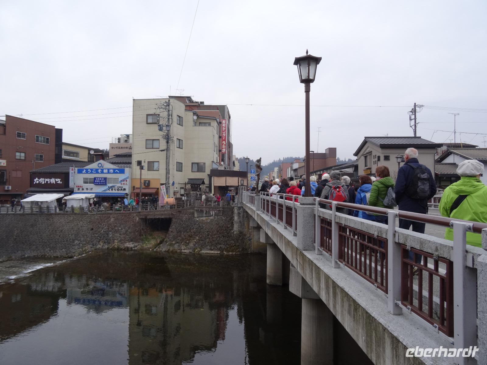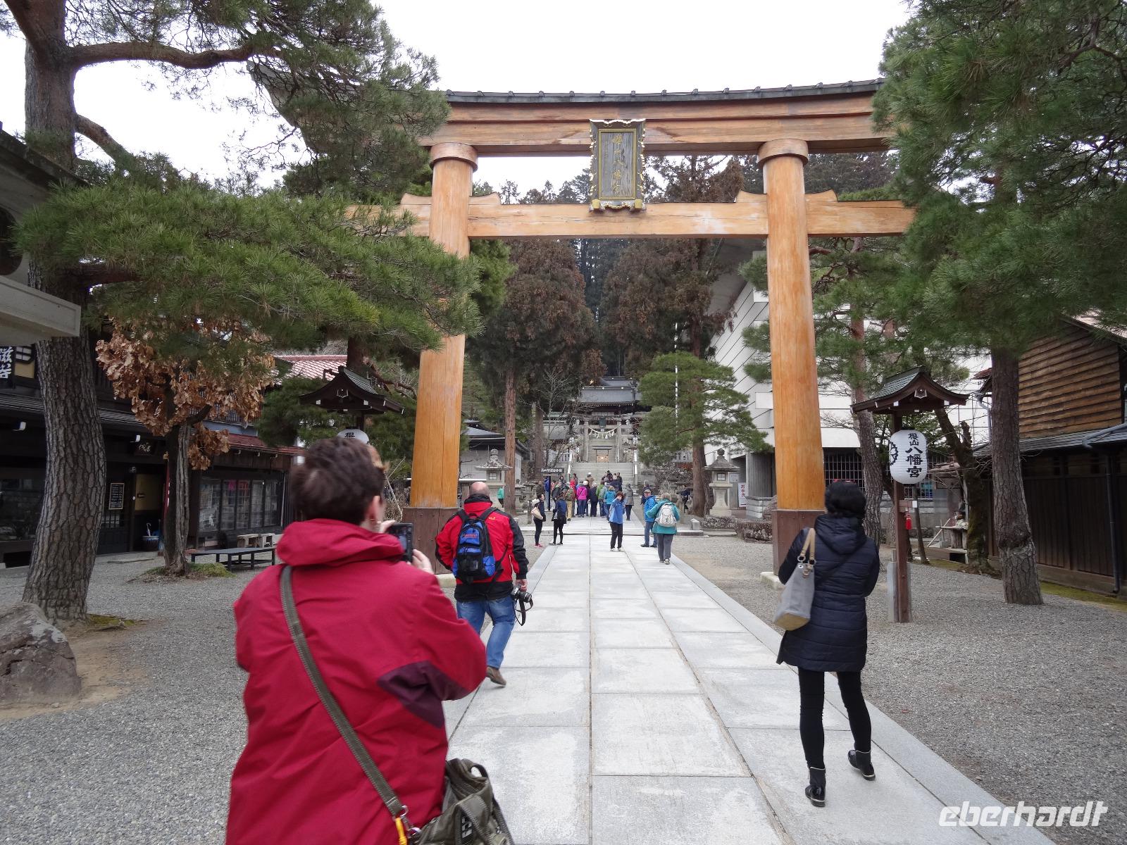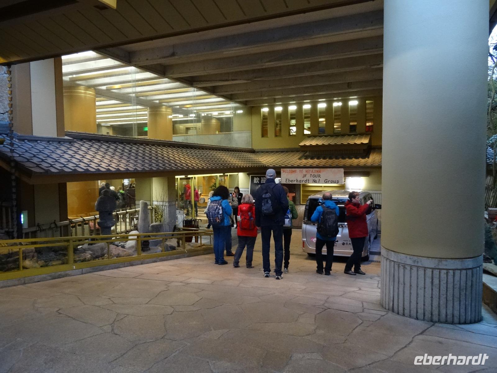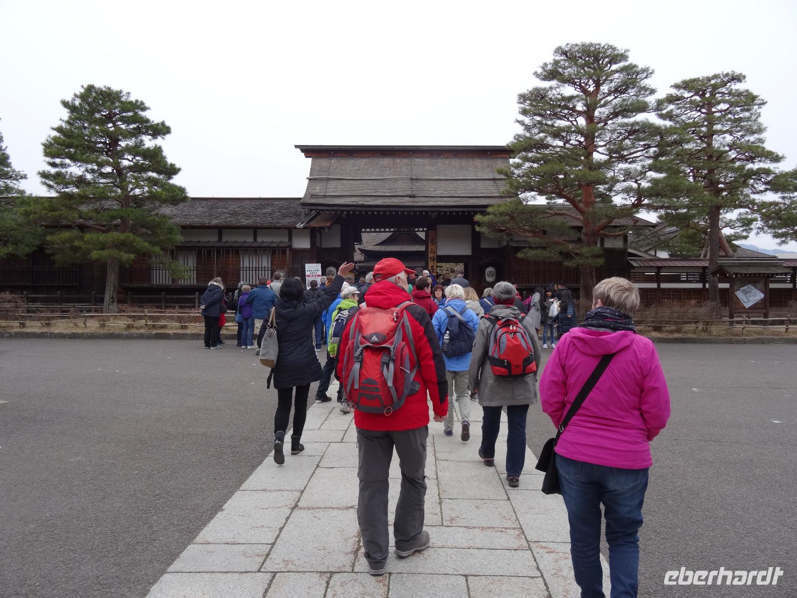 Am heutigen Morgen regnete es zwar nicht, aber es war nur vier Grad warm, als wir das Hotel verließen und uns auf den Weg zum Miyagawa Morgenmarkt machten. Auf unserem Weg dahin besichtigten wir den Kokubun-ji Schrein, in dessen Mitte ein riesiger Gingkobaum emporwuchs. Beim anschließenden Bummel über den Morgenmarkt konnte man das eine oder andere Geschenk oder Andenken erwerben oder einfach nur dem Treiben zuschauen. Mit dem Bus ging es danach in knapp fünfzigminütiger Fahrt nach Shirakawa-go, eine Ansammlung kleiner Dörfer, von denen einige zum UNESCO Weltkulturerbe zählen. Bekannt geworden sind sie durch die Bauweise ihrer Dächer, die so steil in den Himmel ragen, dass sie dabei wie zum Gebet gefaltete Hände aussehen. Notwendig machten das die hohen Schneelasten in dieser Region, so dass man sich mit einer etwa sechzig Grad steilen Dachkonstruktion aus Stroh dagegen wappnete. Bei einem Rundgang besichtigten wir auch eines dieser Häuser, das sogenannte Wada-Haus, welches ein sehr gutes Bild von den Lebensumständen und der Anordnung der Räumlichkeiten bot. In früheren Zeiten wurde hier Salpeter hergestellt und im Dachgeschoss war eine Seidenraupenzucht untergebracht. Gegen Mittag verließen wir das historische Dorf am Shogawa-Fluss wieder und fuhren nach Takayama zurück. Wir verabschiedeten unseren Busfahrer und weiter ging unsere Erkundung jetzt zu Fuß. In der Yatai-Kaikan-Halle sahen wir eine Ausstellung wunderschöner Prunk- und Umzugswagen, die alljährlich jeweils im April und Oktober zum Takayama-Fest in großer Zeremonie durch die Straßen gezogen werden. Ein kleiner Film zeigte anschaulich die Prozession der eindrucksvollen Wagen. Der weitere Weg führte uns durch das Zentrum der Altstadt zum alten Regierungsgebäude Takayama Jin'ya, welches im 17. Jahrhundert unter dem Einfluss des Shogunats gebaut wurde und zu den besterhaltenen Anlagen dieser Art in Japan zählt. Nach einem fünfundvierzigminütigen Rundgang ließen wir unser Tagesprogramm bei einer kleinen Sake-Verkostung ausklingen, für 200 Yen konnte man etwa acht verschiedene Weinsorten ausprobieren. Das half unter anderem gegen die Kälte, die bereits schon gute Stimmung wurde dadurch natürlich noch zusätzlich befeuert. Der heutige Abend stand ganz im Zeichen von Fleisch, viel Fleisch. Im Restaurant "Rokubee" erwarteten uns Yakiniku, riesige gemischte Fleischplatten sowie vegetarische Beilagen, welche auf einem eingelassenen Grill in einer Vertiefung in der Mitte des Tisches frisch zubereitet wurden. Das war nicht nur sehr lecker, sondern hat auch noch viel Spaß gemacht. Mit den entsprechenden Gewürzen und Soßen stellte man so, je nach Geschmack, schnell sein bevorzugtes Fleischgericht selber her. Nach den eher fleischarmen Gerichten der vergangenen Tage war es für alle eine willkommene Alternative zu Sushi und Sashimi.