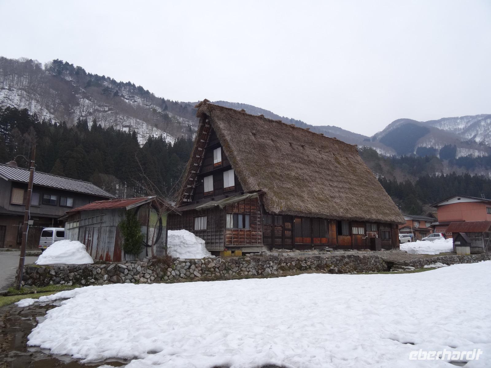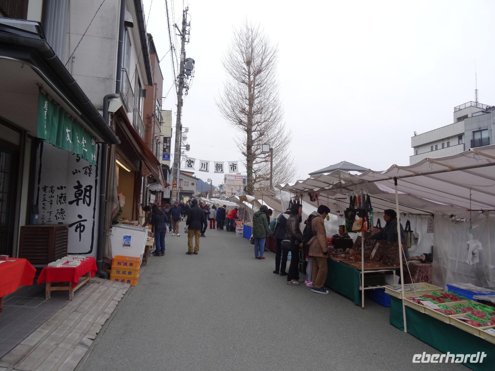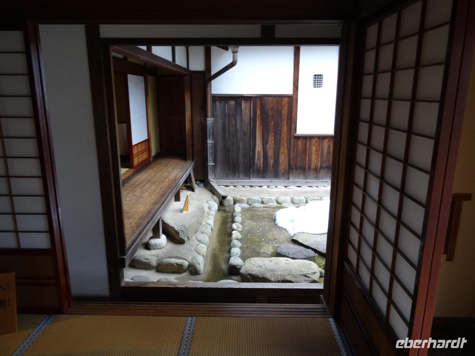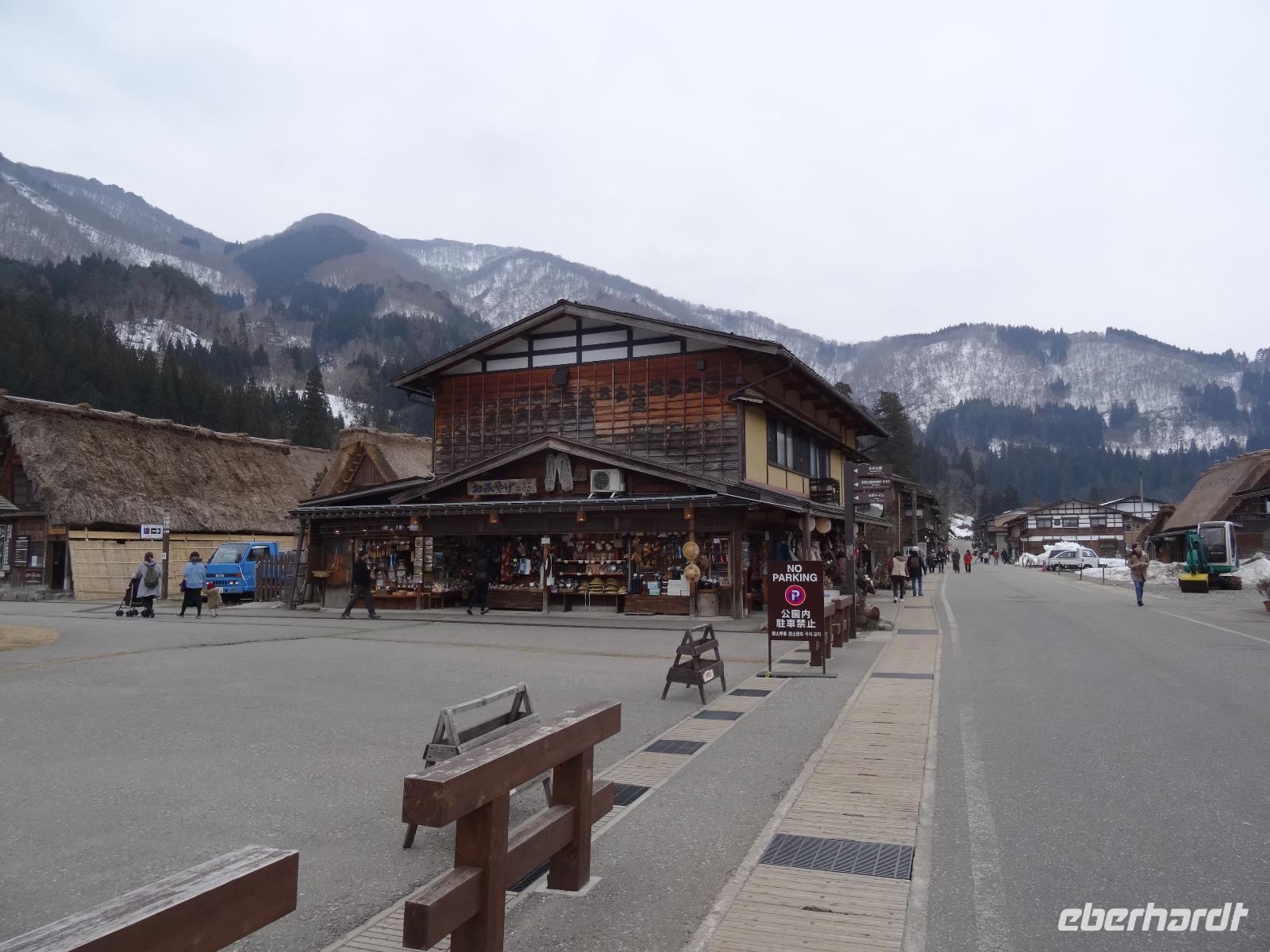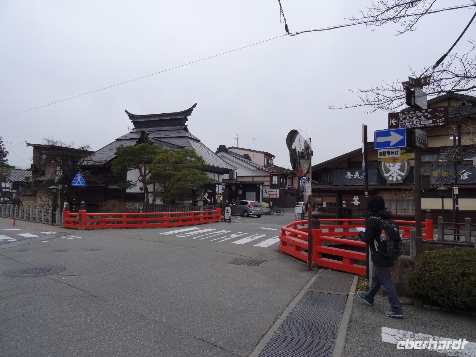 Am heutigen Morgen regnete es zwar nicht, aber es war nur vier Grad warm, als wir das Hotel verließen und uns auf den Weg zum Miyagawa Morgenmarkt machten. Auf unserem Weg dahin besichtigten wir den Kokubun-ji Schrein, in dessen Mitte ein riesiger Gingkobaum emporwuchs. Beim anschließenden Bummel über den Morgenmarkt konnte man das eine oder andere Geschenk oder Andenken erwerben oder einfach nur dem Treiben zuschauen. Mit dem Bus ging es danach in knapp fünfzigminütiger Fahrt nach Shirakawa-go, eine Ansammlung kleiner Dörfer, von denen einige zum UNESCO Weltkulturerbe zählen. Bekannt geworden sind sie durch die Bauweise ihrer Dächer, die so steil in den Himmel ragen, dass sie dabei wie zum Gebet gefaltete Hände aussehen. Notwendig machten das die hohen Schneelasten in dieser Region, so dass man sich mit einer etwa sechzig Grad steilen Dachkonstruktion aus Stroh dagegen wappnete. Bei einem Rundgang besichtigten wir auch eines dieser Häuser, das sogenannte Wada-Haus, welches ein sehr gutes Bild von den Lebensumständen und der Anordnung der Räumlichkeiten bot. In früheren Zeiten wurde hier Salpeter hergestellt und im Dachgeschoss war eine Seidenraupenzucht untergebracht. Gegen Mittag verließen wir das historische Dorf am Shogawa-Fluss wieder und fuhren nach Takayama zurück. Wir verabschiedeten unseren Busfahrer und weiter ging unsere Erkundung jetzt zu Fuß. In der Yatai-Kaikan-Halle sahen wir eine Ausstellung wunderschöner Prunk- und Umzugswagen, die alljährlich jeweils im April und Oktober zum Takayama-Fest in großer Zeremonie durch die Straßen gezogen werden. Ein kleiner Film zeigte anschaulich die Prozession der eindrucksvollen Wagen. Der weitere Weg führte uns durch das Zentrum der Altstadt zum alten Regierungsgebäude Takayama Jin'ya, welches im 17. Jahrhundert unter dem Einfluss des Shogunats gebaut wurde und zu den besterhaltenen Anlagen dieser Art in Japan zählt. Nach einem fünfundvierzigminütigen Rundgang ließen wir unser Tagesprogramm bei einer kleinen Sake-Verkostung ausklingen, für 200 Yen konnte man etwa acht verschiedene Weinsorten ausprobieren. Das half unter anderem gegen die Kälte, die bereits schon gute Stimmung wurde dadurch natürlich noch zusätzlich befeuert. Der heutige Abend stand ganz im Zeichen von Fleisch, viel Fleisch. Im Restaurant "Rokubee" erwarteten uns Yakiniku, riesige gemischte Fleischplatten sowie vegetarische Beilagen, welche auf einem eingelassenen Grill in einer Vertiefung in der Mitte des Tisches frisch zubereitet wurden. Das war nicht nur sehr lecker, sondern hat auch noch viel Spaß gemacht. Mit den entsprechenden Gewürzen und Soßen stellte man so, je nach Geschmack, schnell sein bevorzugtes Fleischgericht selber her. Nach den eher fleischarmen Gerichten der vergangenen Tage war es für alle eine willkommene Alternative zu Sushi und Sashimi.