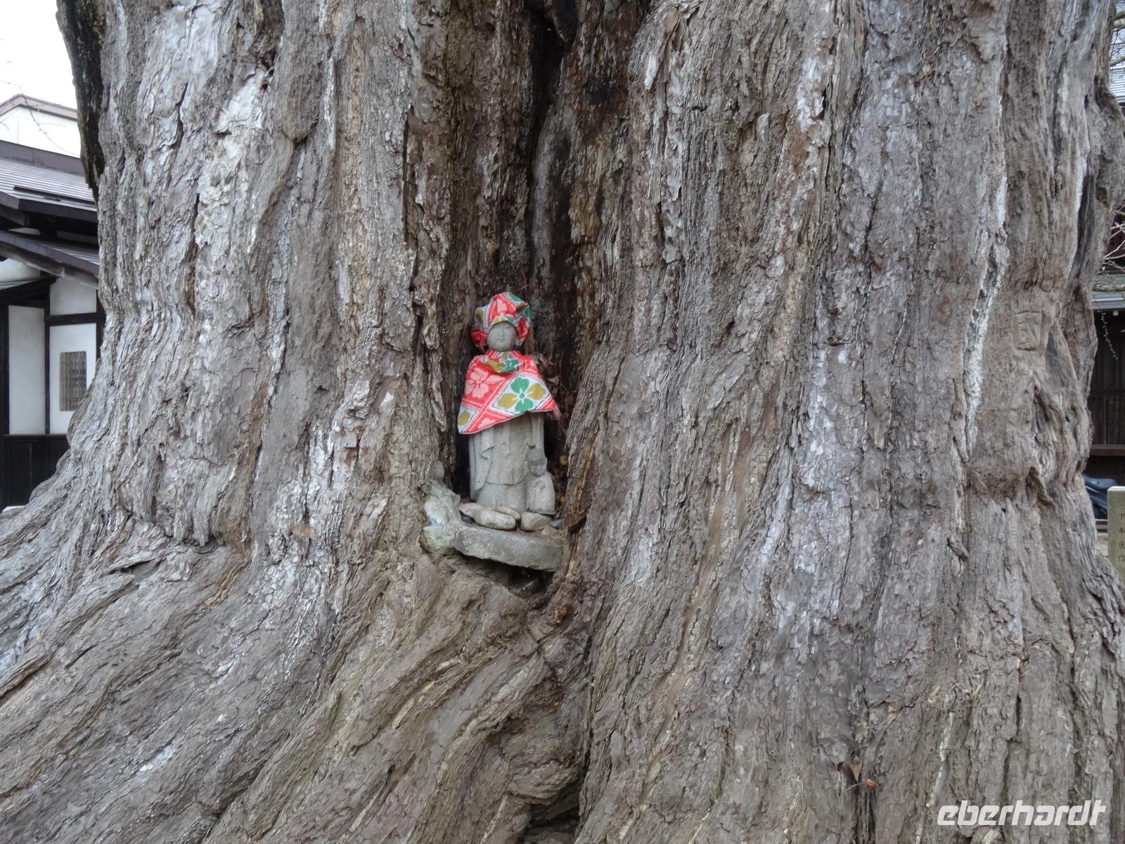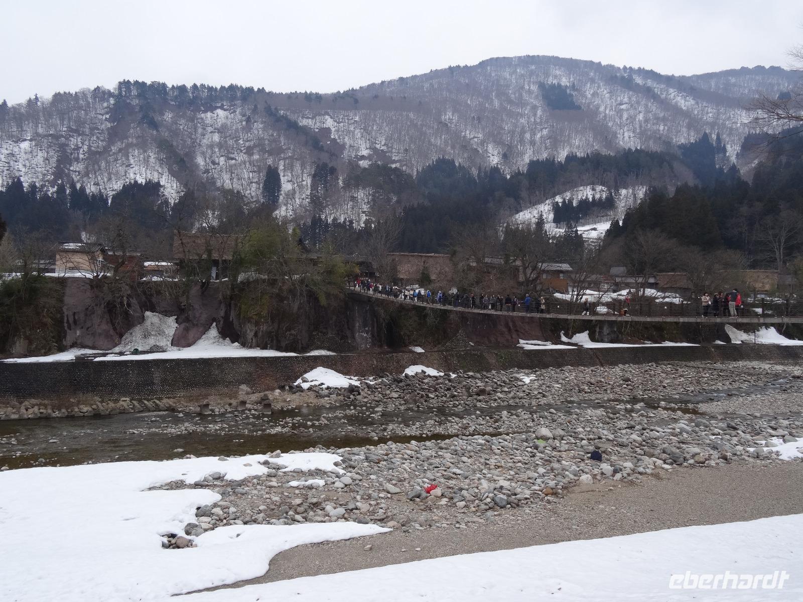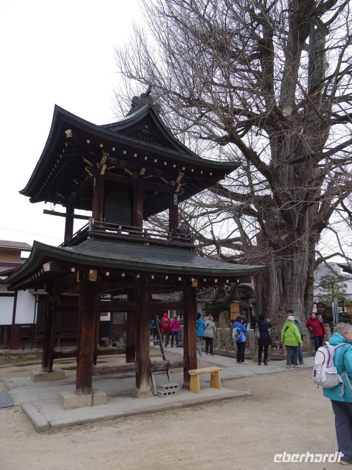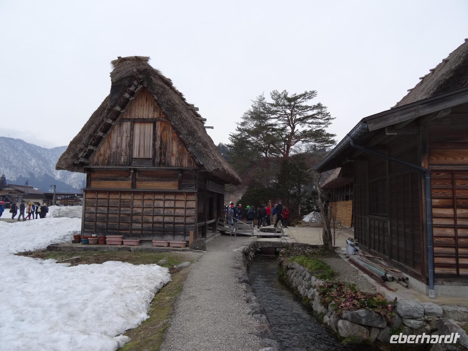 Am heutigen Morgen regnete es zwar nicht, aber es war nur vier Grad warm, als wir das Hotel verließen und uns auf den Weg zum Miyagawa Morgenmarkt machten. Auf unserem Weg dahin besichtigten wir den Kokubun-ji Schrein, in dessen Mitte ein riesiger Gingkobaum emporwuchs. Beim anschließenden Bummel über den Morgenmarkt konnte man das eine oder andere Geschenk oder Andenken erwerben oder einfach nur dem Treiben zuschauen. Mit dem Bus ging es danach in knapp fünfzigminütiger Fahrt nach Shirakawa-go, eine Ansammlung kleiner Dörfer, von denen einige zum UNESCO Weltkulturerbe zählen. Bekannt geworden sind sie durch die Bauweise ihrer Dächer, die so steil in den Himmel ragen, dass sie dabei wie zum Gebet gefaltete Hände aussehen. Notwendig machten das die hohen Schneelasten in dieser Region, so dass man sich mit einer etwa sechzig Grad steilen Dachkonstruktion aus Stroh dagegen wappnete. Bei einem Rundgang besichtigten wir auch eines dieser Häuser, das sogenannte Wada-Haus, welches ein sehr gutes Bild von den Lebensumständen und der Anordnung der Räumlichkeiten bot. In früheren Zeiten wurde hier Salpeter hergestellt und im Dachgeschoss war eine Seidenraupenzucht untergebracht. Gegen Mittag verließen wir das historische Dorf am Shogawa-Fluss wieder und fuhren nach Takayama zurück. Wir verabschiedeten unseren Busfahrer und weiter ging unsere Erkundung jetzt zu Fuß. In der Yatai-Kaikan-Halle sahen wir eine Ausstellung wunderschöner Prunk- und Umzugswagen, die alljährlich jeweils im April und Oktober zum Takayama-Fest in großer Zeremonie durch die Straßen gezogen werden. Ein kleiner Film zeigte anschaulich die Prozession der eindrucksvollen Wagen. Der weitere Weg führte uns durch das Zentrum der Altstadt zum alten Regierungsgebäude Takayama Jin'ya, welches im 17. Jahrhundert unter dem Einfluss des Shogunats gebaut wurde und zu den besterhaltenen Anlagen dieser Art in Japan zählt. Nach einem fünfundvierzigminütigen Rundgang ließen wir unser Tagesprogramm bei einer kleinen Sake-Verkostung ausklingen, für 200 Yen konnte man etwa acht verschiedene Weinsorten ausprobieren. Das half unter anderem gegen die Kälte, die bereits schon gute Stimmung wurde dadurch natürlich noch zusätzlich befeuert. Der heutige Abend stand ganz im Zeichen von Fleisch, viel Fleisch. Im Restaurant "Rokubee" erwarteten uns Yakiniku, riesige gemischte Fleischplatten sowie vegetarische Beilagen, welche auf einem eingelassenen Grill in einer Vertiefung in der Mitte des Tisches frisch zubereitet wurden. Das war nicht nur sehr lecker, sondern hat auch noch viel Spaß gemacht. Mit den entsprechenden Gewürzen und Soßen stellte man so, je nach Geschmack, schnell sein bevorzugtes Fleischgericht selber her. Nach den eher fleischarmen Gerichten der vergangenen Tage war es für alle eine willkommene Alternative zu Sushi und Sashimi.