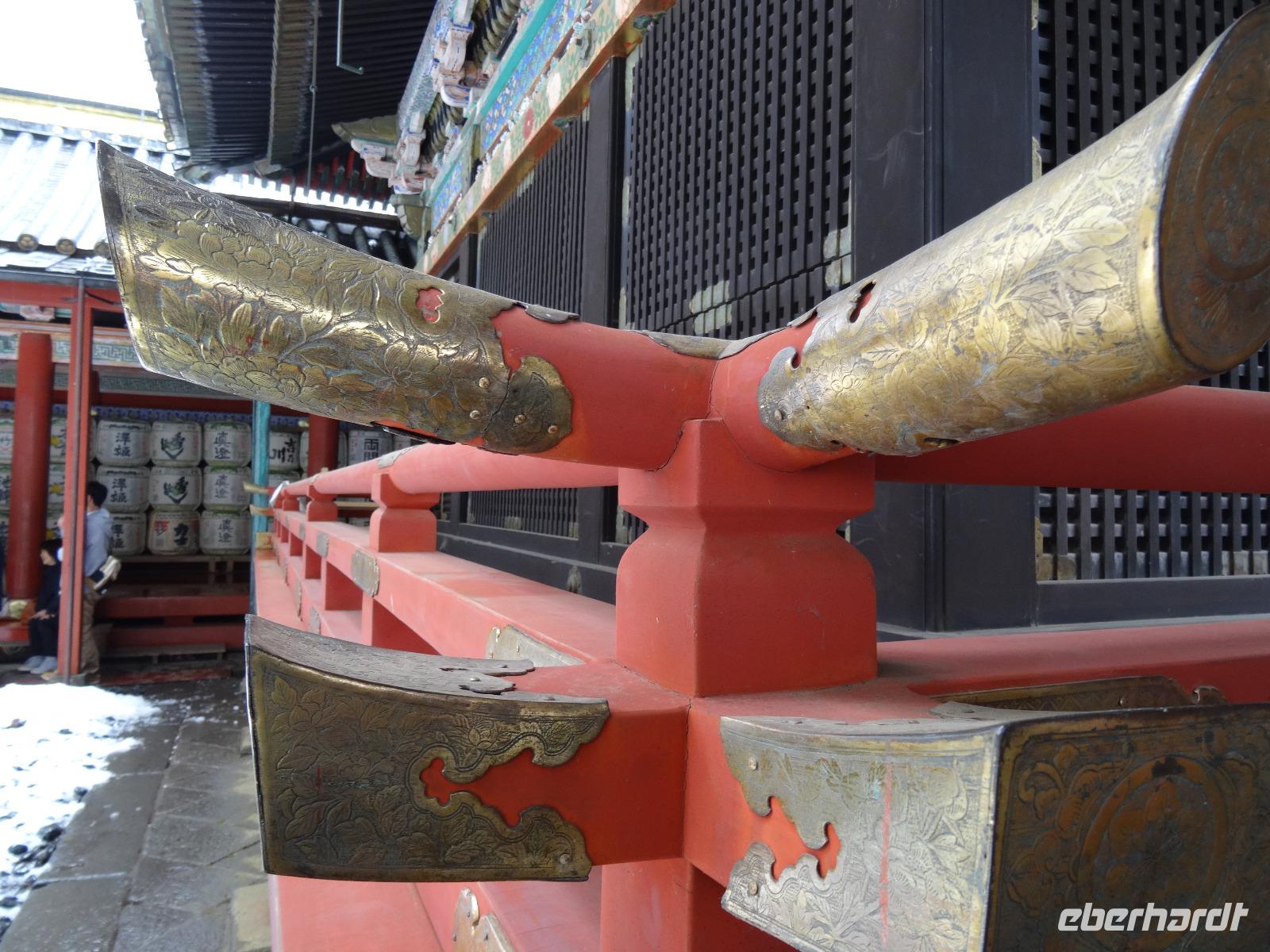 Obwohl wir Tokio-Stadt mit seinen knapp neun Millionen Einwohnern noch nicht endgültig verließen, führte uns unser heutiger Ausflug erst einmal zur Stadt hinaus. Unser Bus steuerte nach Nordwesten, zum Nikko-Nationalpark, knapp 140 Kilometer außerhalb der Hauptstadt gelegen. Eigentliches Ziel war der prachtvolle und wunderschön restaurierte Tosho-gu-Schrein mit dem Mausoleum des Shogun Togugawa leyasu, welcher zum UNESCO Weltkulturerbe zählt. Am Eingang findet man neben einem Torii, dem schintoistischen Torbogen auch eine fünfstöckige buddhistische Pagode. Das Innere der Anlage ist von verschiedenen Gebäuden gekennzeichnet, unter anderem dem Pferdestall mit den Schnitzereien der berühmten drei Affen, reich verzierte Vorratsgebäude oder dem Trommelturm. Man könnte sich stundenlang im Schrein aufhalten und würde immer wieder neue Details erkennen und finden. Irgendwann mussten wir allerdings aufbrechen, denn unser weiterer Weg sollte uns die 48 Kurven der Iroha-Steigung den Berg hinauf führen. In 1260 Metern Höhe erreichten wir den Chuzenji-See, am Fuße eines Vulkans gelegen und rund 12 Quadratkilometer groß. Die Ufer und die umliegenden Bergketten waren noch von Schnee gesäumt und die Luft war winterlich kalt. Nur wenige Gehminuten am Ostufer des Sees gelegen, stürzt der Kegon-Wasserfall fast 100 Meter in die Tiefe. Von der gegenüberliegenden Plattform hatte man einen schönen Blick auf das Schauspiel. Am späten Nachmittag machten wir uns auf die beinahe dreistündige Rückreise nach Tokio. Das ist viel für eine Strecke von weniger als 150 Kilometern, aber nicht viel für einen Verkehrsmoloch wie den Großraum Tokio. Den heutigen Tag sollte ein Sushi-Essen beschließen. Für die Mehrheit unserer Gruppe war das das erste Aufeinandertreffen mit der japanischen Spezialität. Roher Fisch und eine spezielle Auswahl an Meeresfrüchten ist auch nicht jedermanns Sache. So waren denn auch alle gespannt, was da alles kommen und vor allem wie es schmecken würde. Im "Sushizanmai", wie das Lokal hieß, bekamen wir eine Auswahl verschiedener Sushis (Meer-Brasse, Ei, Garnele, Hummer, Fischrogen, Muschel, Seeigel, Tintenfisch, Thunfisch, Seetang, Aal u.a.) sowie eine Miso-Suppe, dem japanischen Nationalgericht, welche dem Grunde nach aus Fischsud und Sojabohnenpaste besteht und mit weiteren Ingredienzien verfeinert werden kann. Manche Sushi schmeckten wirklich lecker, bei manchen brauchte der europäische Gaumen etwas Überwindung, manche ließen sich auch mit großem Willen (das vormalige Tier vor Augen) nicht hinunterschlucken. Insgesamt war es für alle eine interessante Erfahrung, wobei die Zahl der neu hinzugekommenen Sushi-Liebhaber überschaubar geblieben war.