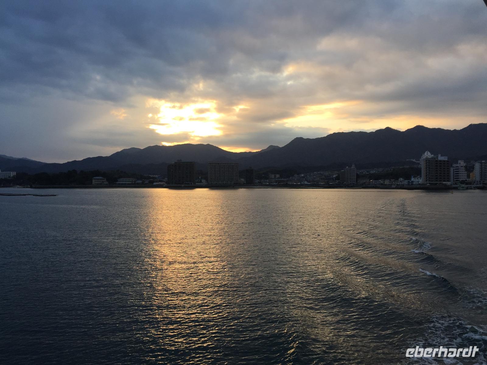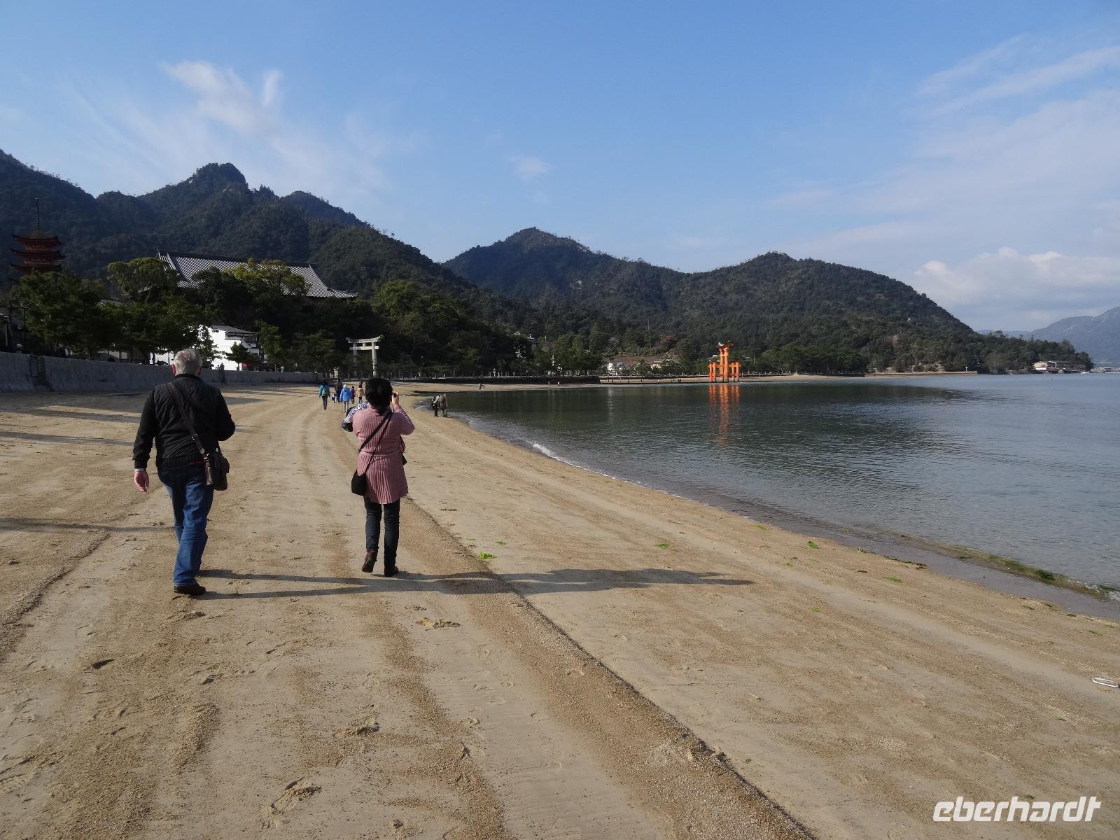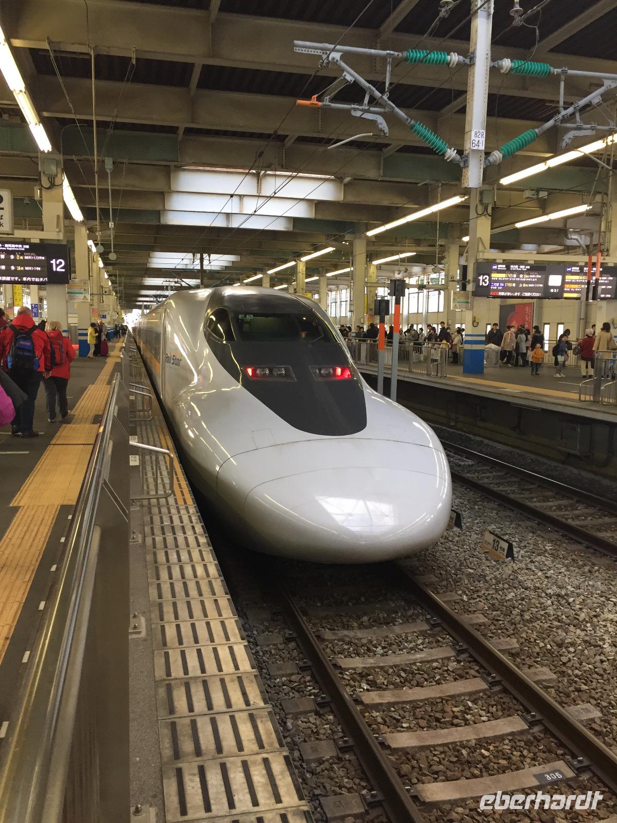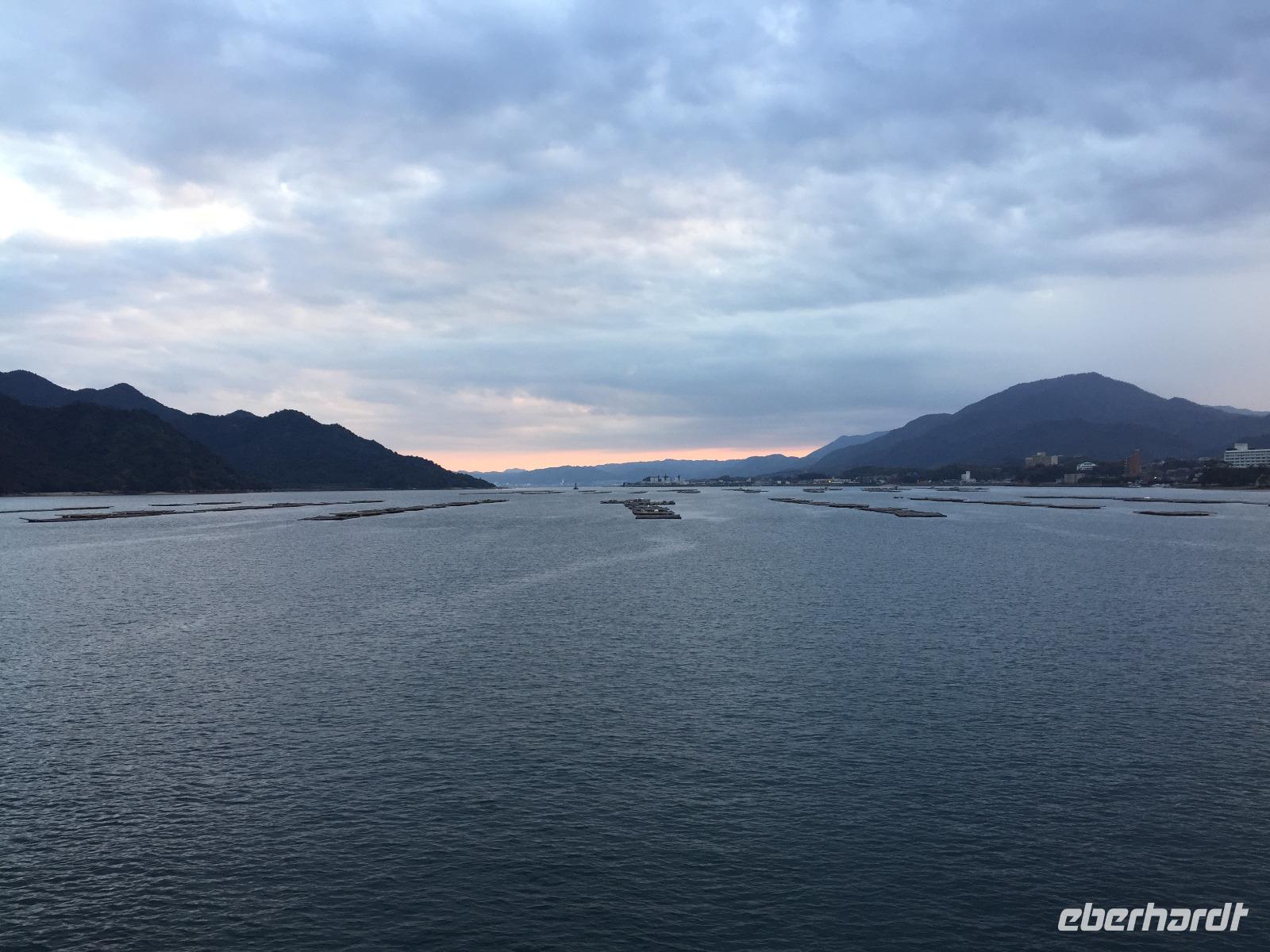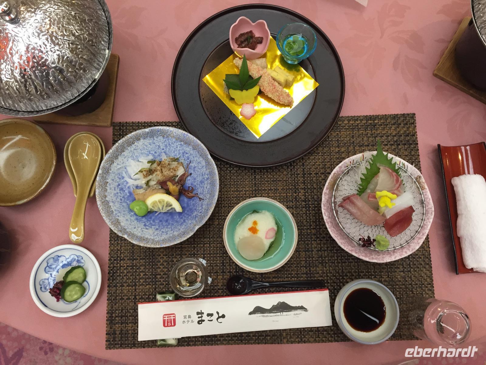 Der heutige Tag war ein Fest für Zugliebhaber, stand er doch ganz im Zeichen der Fortbewegung auf Schienen. Wir verließen am frühen Morgen die bergige Region um Takayama, wo in der Nacht neuer Schnee gefallen war und die umliegenden Hügelketten mit einem weißen Schleier bedeckte. Es war kalt, als wir um acht Uhr den Regionalzug nach Nagoya bestiegen und in knapp zweieinhalbstündiger Fahrt die Ausläufer der Japanischen Alpen hinter uns ließen. In Nagoya hatten wir eine reichliche halbe Stunde Aufenthalt, bevor es für uns weiterging. Wir nutzten die Zeit und bestaunten die ein- und ausfahrenden Hochgeschwindigkeitszüge Shinkansen, von denen wir schon viel gehört hatten und bald selbst in den Genuss des Mitfahrens kamen. Weltweit einzigartig und legendär ist die Pünktlichkeit der Züge des japanischen Eisenbahnsystems. Man konnte beinahe blind darauf vertrauen, dass sowohl Abfahrts- als auch Ankunftszeiten auf die Minute genau eingehalten wurden. Zumindest bei den Shinkansen, die darüber hinaus auf den Punkt genau an der dafür vorgesehenen Stelle am Bahnsteig hielten. Ein wunderbares System, welches die Lust am Bahnfahren wieder zum Vorschein bringt. Zumal die Wagen komfortabel ausgestattet sind und der Sitzabstand eine exzellente Beinfreiheit aufweist. Verbunden mit der enormen Geschwindigkeit und der damit einhergehenden kurzen Reisezeit ist das System fast allen sonstigen Fortbewegungsmitteln überlegen. Wenn die Strecke passt... Wir bestiegen den Shinkansen Hikari nach Himeji und genossen unsere erste Hochgeschwindigkeitsfahrt auf japanischen Boden. Anderthalb Stunden später stiegen wir in Himeji aus und besichtigten die schon vom Bahnhof aus weithin sichtbare „Burg des weißen Reihers", welche zum UNESCO-Weltkulturerbe zählt. Japans größte und schönste Burg wurde im 17. Jahrhundert zu ihrer heutigen Form ausgebaut und erstrahlt nach umfassender Restaurierung seit April 2015 wieder in ihrer ganzen Pracht. Mit uns zog es tausende Besucher zu der weißen Burg mit den geschwungenen Dächern, die ein wenig an einen landenden Silberreiher erinnert und so zu ihrem Namen kam. Am frühen Nachmittag bestiegen wir den Shinkansen nach Hiroshima, wo wir umstiegen und den Regionalzug nach Miyajima nahmen. Mit der Fähre ging es in knapp fünfzehnminütiger Fahrt zur gleichnamigen Insel, die dem Gebiet um Hiroshima vorgelagert ist. Auf der Insel angekommen, liefen wir zu unserer heutigen Unterkunft, dem Makoto Ryokan, einer traditionellen japanischen „Herberge". Nach einem herzlichem Empfang und kurzer Zimmerverteilung trafen wir uns alle in der Lobby, um ein besonderes Gruppenfoto zu schießen. Wir trugen alle den typischen Yukata, die baumwollene, leichtere und preiswertere Version des Kimono, welche einem Bademantel vergleichbar ist und einen angenehmen Tragekomfort bietet. Derartig gewandet nahmen wir auch unser Abendessen zu uns, welches aus einem vielgängigen Kaiseki-Mahl bestand. Ein buntes Potpourri hochwertig zubereiteter Speisen, welche dem europäischen Gaumen einen großen Raum für geschmackliche Entdeckungen bot. Nach dem Abendessen konnte man noch den hauseigenen Onsen besuchen oder einen Spaziergang zum Torii am Itsukushima-Schrein unternehmen, der des Nachts angestrahlt wird und ein wunderschönes Motiv bildet. Zur Nachtruhe betteten wir uns auf einen Futon, der während unseres Abendessens auf den Tatami-Matten ausgelegt wurde. Nicht jedermanns Sache, aber unabdingbar in einem Ryokan. Genauso wie die Toiletten-Pantoffel, die separat zu tragen waren, wenn man die besagte Örtlichkeit aufsuchen musste.