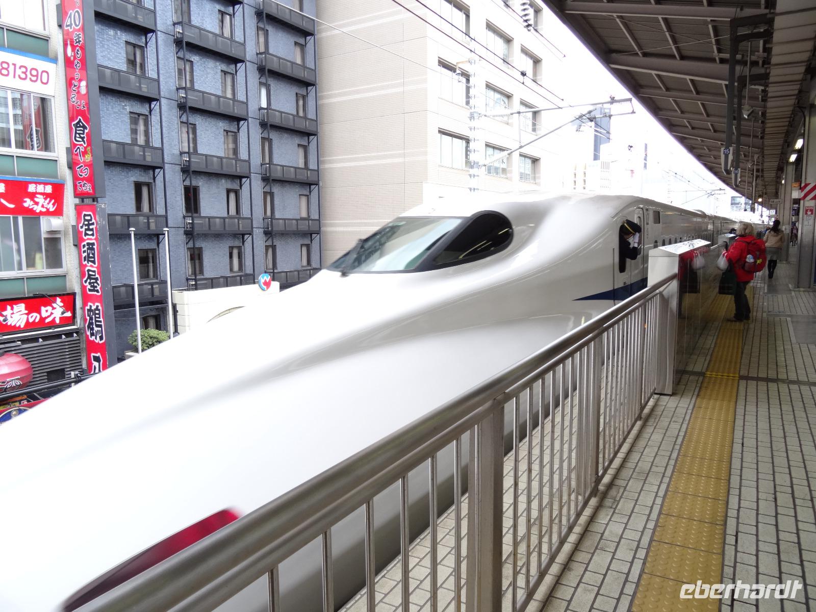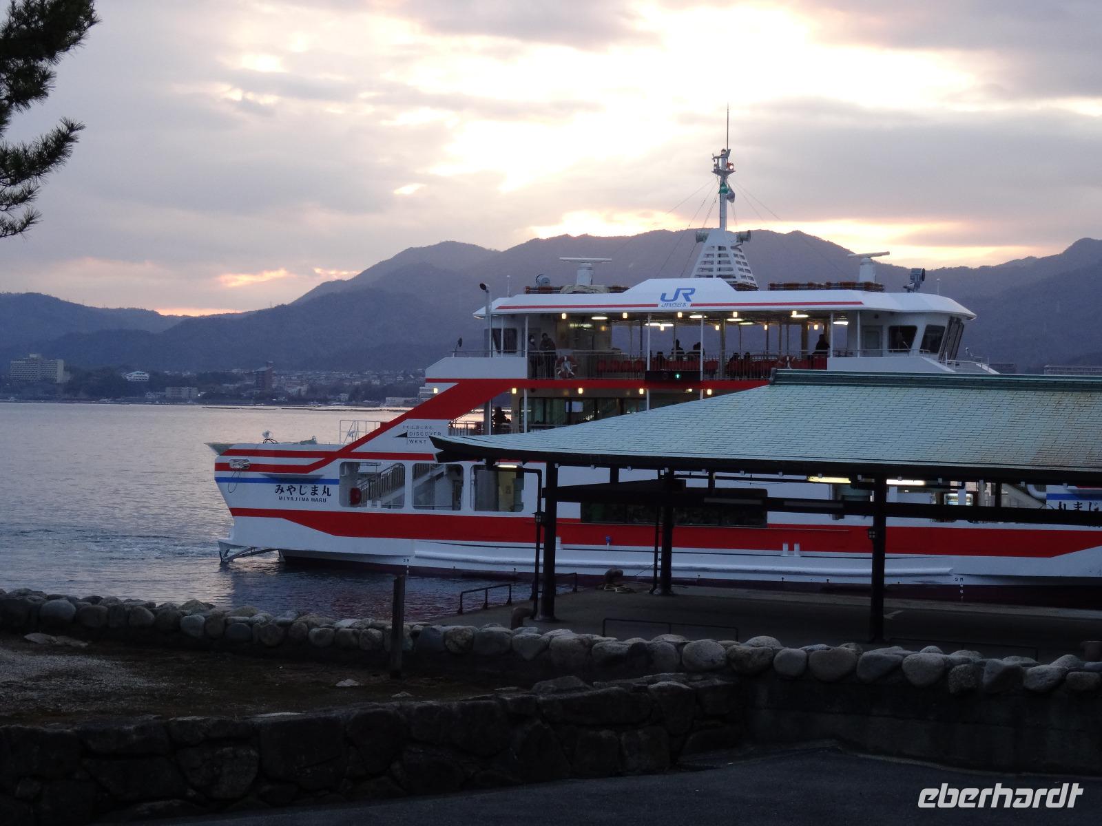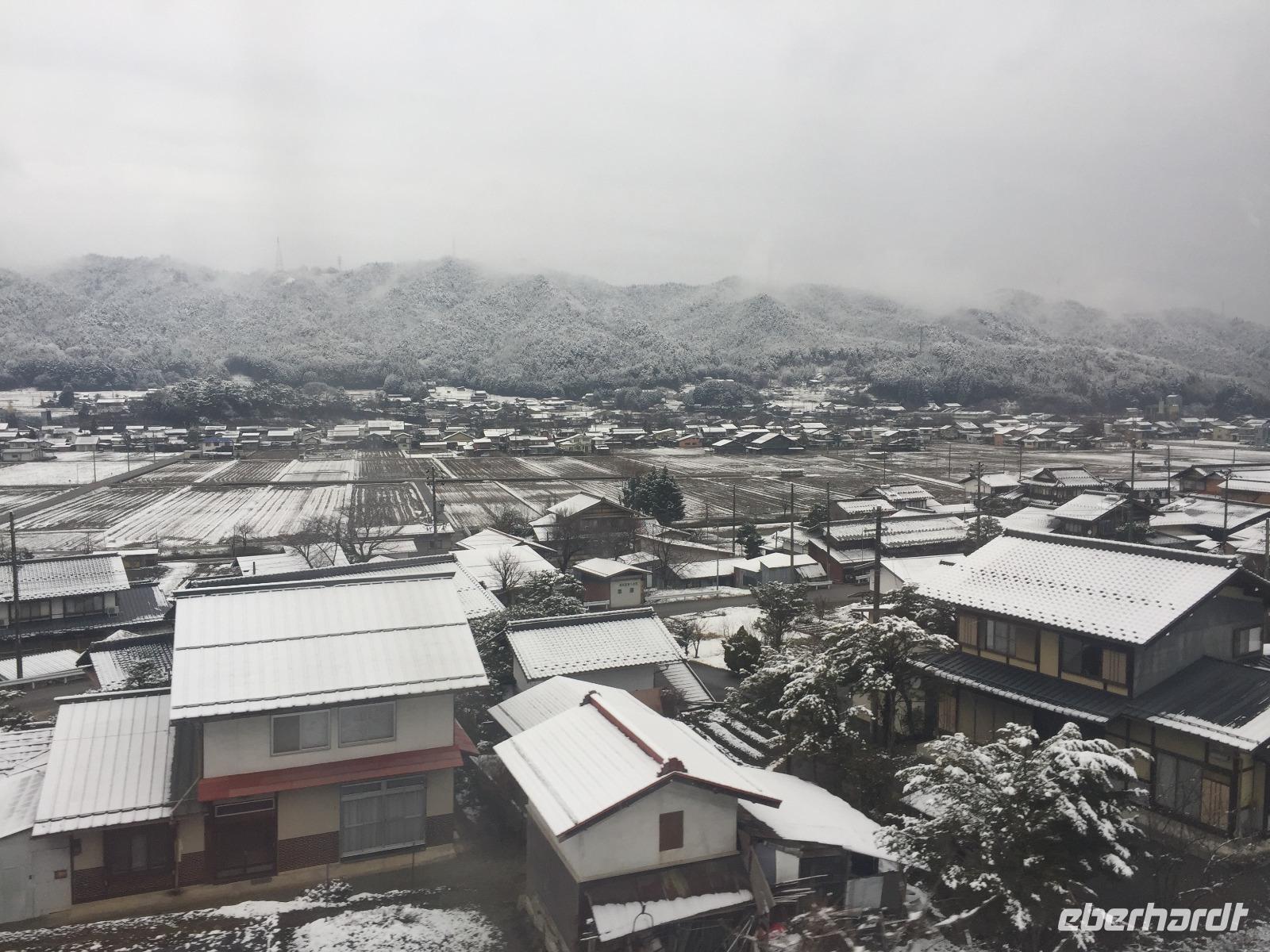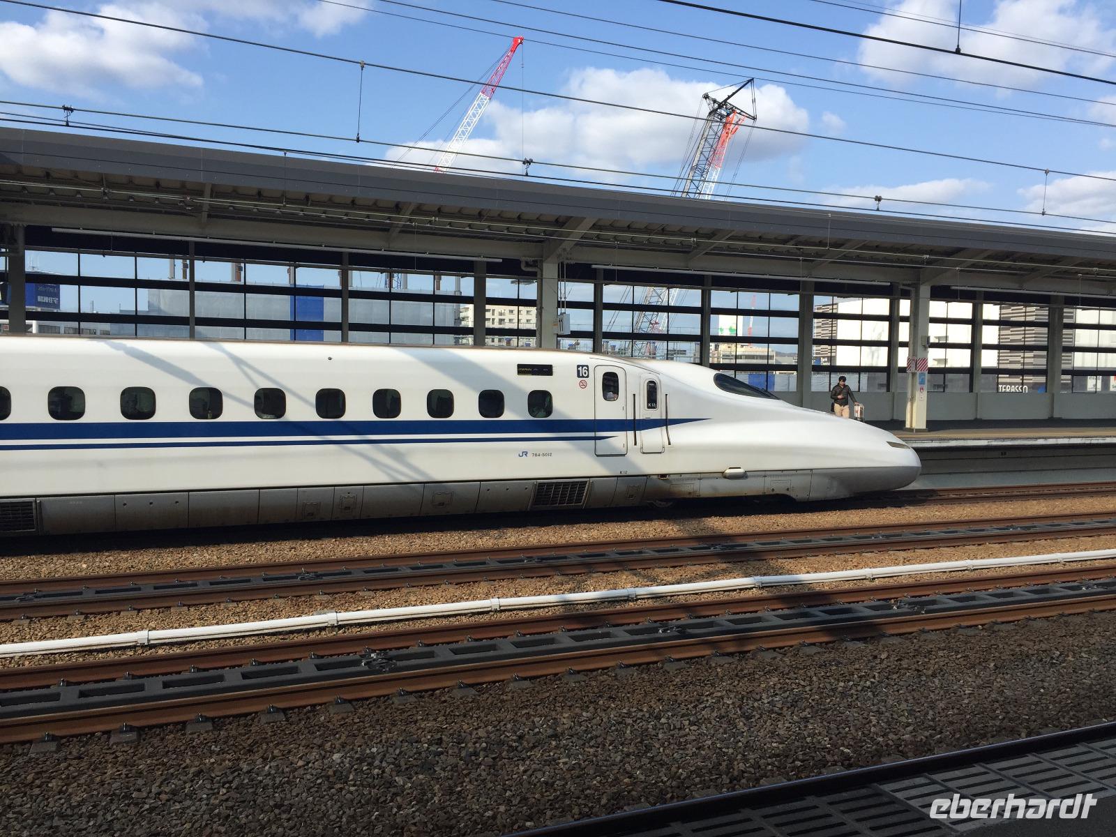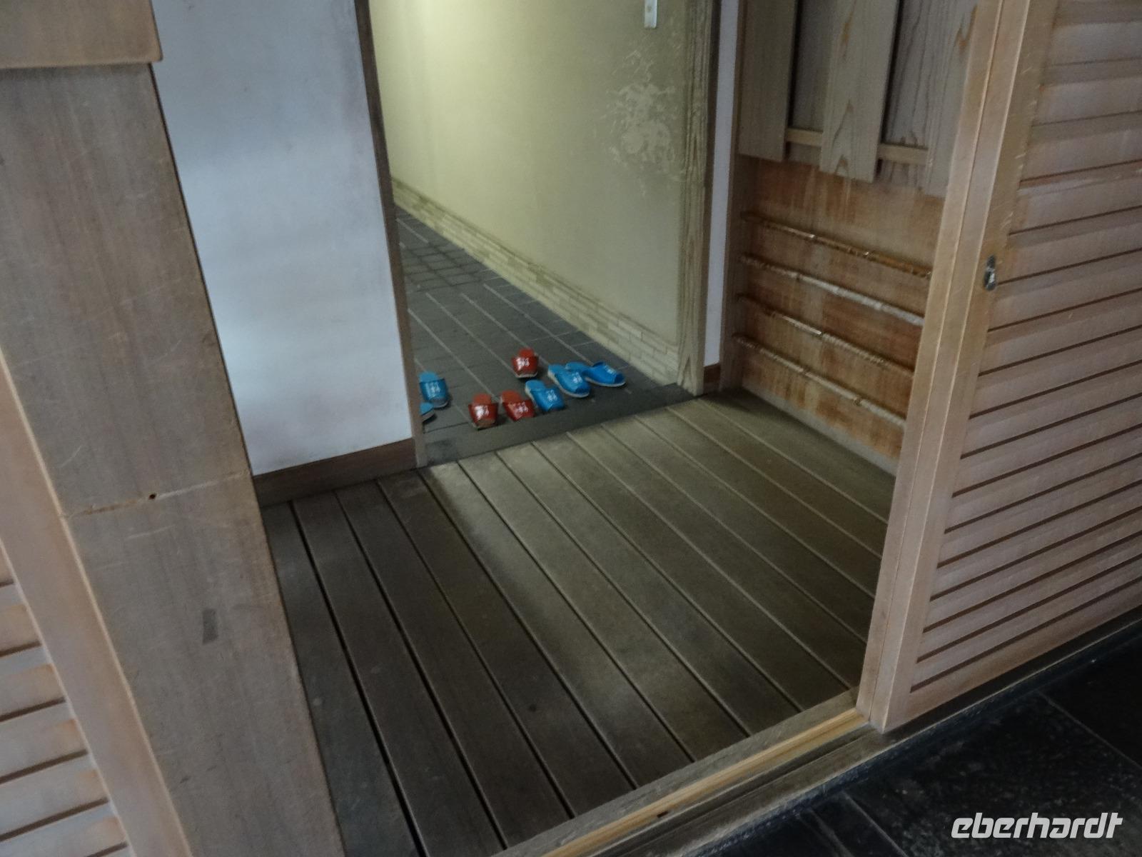 Der heutige Tag war ein Fest für Zugliebhaber, stand er doch ganz im Zeichen der Fortbewegung auf Schienen. Wir verließen am frühen Morgen die bergige Region um Takayama, wo in der Nacht neuer Schnee gefallen war und die umliegenden Hügelketten mit einem weißen Schleier bedeckte. Es war kalt, als wir um acht Uhr den Regionalzug nach Nagoya bestiegen und in knapp zweieinhalbstündiger Fahrt die Ausläufer der Japanischen Alpen hinter uns ließen. In Nagoya hatten wir eine reichliche halbe Stunde Aufenthalt, bevor es für uns weiterging. Wir nutzten die Zeit und bestaunten die ein- und ausfahrenden Hochgeschwindigkeitszüge Shinkansen, von denen wir schon viel gehört hatten und bald selbst in den Genuss des Mitfahrens kamen. Weltweit einzigartig und legendär ist die Pünktlichkeit der Züge des japanischen Eisenbahnsystems. Man konnte beinahe blind darauf vertrauen, dass sowohl Abfahrts- als auch Ankunftszeiten auf die Minute genau eingehalten wurden. Zumindest bei den Shinkansen, die darüber hinaus auf den Punkt genau an der dafür vorgesehenen Stelle am Bahnsteig hielten. Ein wunderbares System, welches die Lust am Bahnfahren wieder zum Vorschein bringt. Zumal die Wagen komfortabel ausgestattet sind und der Sitzabstand eine exzellente Beinfreiheit aufweist. Verbunden mit der enormen Geschwindigkeit und der damit einhergehenden kurzen Reisezeit ist das System fast allen sonstigen Fortbewegungsmitteln überlegen. Wenn die Strecke passt... Wir bestiegen den Shinkansen Hikari nach Himeji und genossen unsere erste Hochgeschwindigkeitsfahrt auf japanischen Boden. Anderthalb Stunden später stiegen wir in Himeji aus und besichtigten die schon vom Bahnhof aus weithin sichtbare „Burg des weißen Reihers", welche zum UNESCO-Weltkulturerbe zählt. Japans größte und schönste Burg wurde im 17. Jahrhundert zu ihrer heutigen Form ausgebaut und erstrahlt nach umfassender Restaurierung seit April 2015 wieder in ihrer ganzen Pracht. Mit uns zog es tausende Besucher zu der weißen Burg mit den geschwungenen Dächern, die ein wenig an einen landenden Silberreiher erinnert und so zu ihrem Namen kam. Am frühen Nachmittag bestiegen wir den Shinkansen nach Hiroshima, wo wir umstiegen und den Regionalzug nach Miyajima nahmen. Mit der Fähre ging es in knapp fünfzehnminütiger Fahrt zur gleichnamigen Insel, die dem Gebiet um Hiroshima vorgelagert ist. Auf der Insel angekommen, liefen wir zu unserer heutigen Unterkunft, dem Makoto Ryokan, einer traditionellen japanischen „Herberge". Nach einem herzlichem Empfang und kurzer Zimmerverteilung trafen wir uns alle in der Lobby, um ein besonderes Gruppenfoto zu schießen. Wir trugen alle den typischen Yukata, die baumwollene, leichtere und preiswertere Version des Kimono, welche einem Bademantel vergleichbar ist und einen angenehmen Tragekomfort bietet. Derartig gewandet nahmen wir auch unser Abendessen zu uns, welches aus einem vielgängigen Kaiseki-Mahl bestand. Ein buntes Potpourri hochwertig zubereiteter Speisen, welche dem europäischen Gaumen einen großen Raum für geschmackliche Entdeckungen bot. Nach dem Abendessen konnte man noch den hauseigenen Onsen besuchen oder einen Spaziergang zum Torii am Itsukushima-Schrein unternehmen, der des Nachts angestrahlt wird und ein wunderschönes Motiv bildet. Zur Nachtruhe betteten wir uns auf einen Futon, der während unseres Abendessens auf den Tatami-Matten ausgelegt wurde. Nicht jedermanns Sache, aber unabdingbar in einem Ryokan. Genauso wie die Toiletten-Pantoffel, die separat zu tragen waren, wenn man die besagte Örtlichkeit aufsuchen musste.