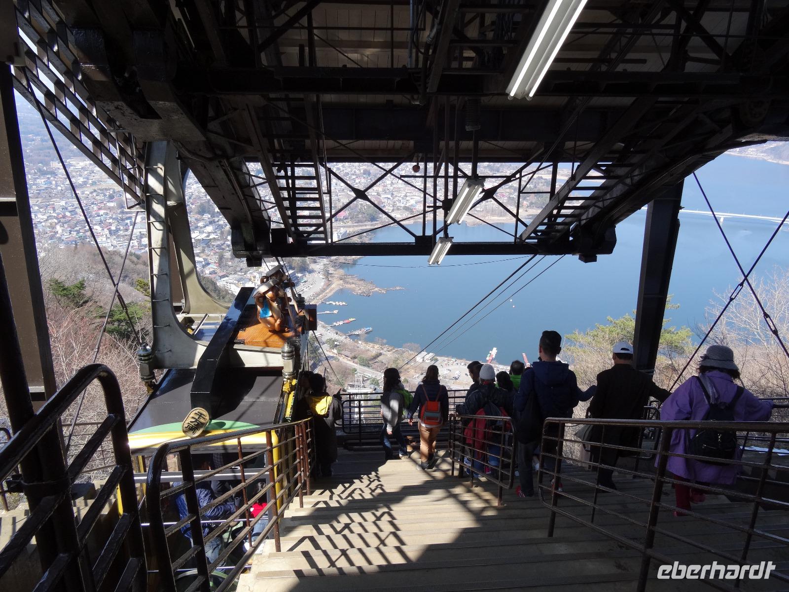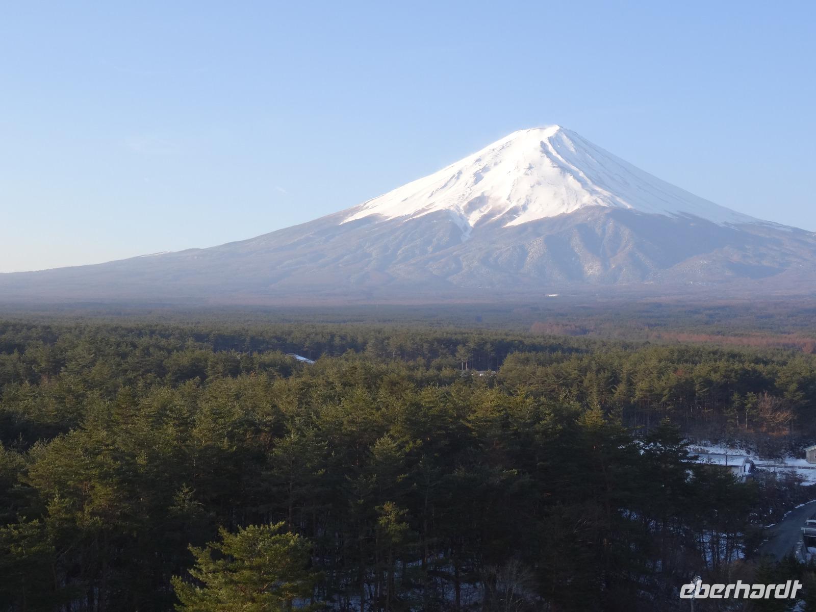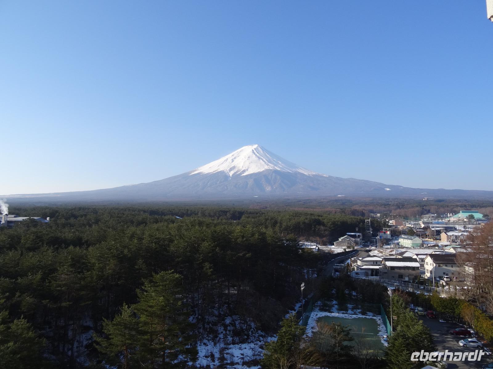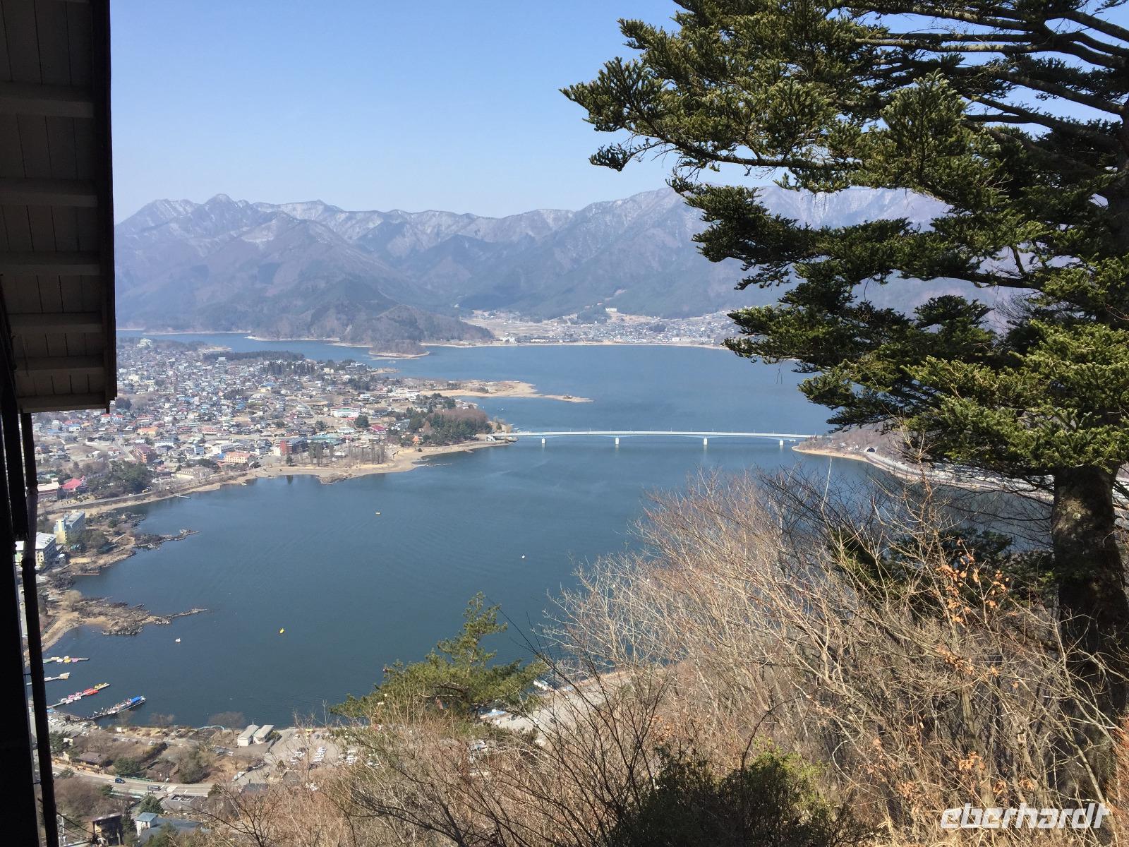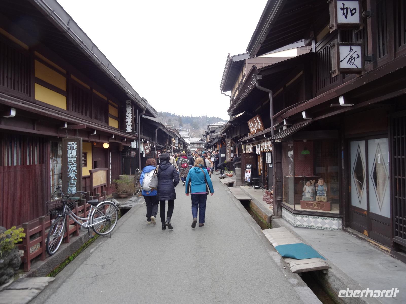 Unsere Wünsche vom Vortag wurden erhört, als wir an diesem Morgen ans Fenster traten, um einen Blick auf den Fuji zu werfen. Da war er, in all seiner Pracht und frei unseren Blicken zugänglich. Welch herrlicher Anblick! Unsere Angst, ihn nicht zu Gesicht zu bekommen, war dahin. Wir genossen noch eine Weile den Ausblick auf den 3776 Meter hohen Vulkankegel, bevor wir uns dem Frühstücksbüffet zuwanden. Es standen neben Toast und Croissant eine große Auswahl verschiedener japanischer Speisen zur Auswahl, welche für uns zum Frühstück eher ungewohnt waren. Wann essen wir in heimatlichen Gefilden schon mal Makrele oder gebratenen Lachs, garniert mit verschiedenen Gemüsen, Reis, Salaten und einer Miso-Suppe zum Frühstück? Wohl eher selten. Wer experimentierfreudig war, könnte aus dem Vollen schöpfen. Alle Anderen wurden auch satt. Wir verstauten unsere Koffer im Bus und fuhren die wenigen Kilometer zum Kawaguchi-See, dem größten von fünf Seen, die sich wie eine Kette um den höchsten Berg Japans gelegt haben. See und Berg boten eine atemberaubende Kulisse für schöne Erinnerungsfotos, weswegen auch allenthalben die Kameras klickten. Wir hatten tolles Wetter und nutzten dieses, um die wunderschöne Umgebung noch etwas weiter zu erkunden. Mit einer Seilbahn, der Kawaguchiko-Ropeway, ging es in wenigen Minuten einige hundert Meter den Mt. Tenjo hinauf. Entweder genoss man von hier oben den Blick auf den Berg und den malerisch gelegenen See, oder man nutzte die Gelegenheit zu einer kleinen Wanderung im Hochwald. Irgendwann mussten wir uns aber auf den Weg zu unserem knapp 300 Kilometer entfernten nächsten Etappenziel nach Takayama aufmachen, so dass wir am Mittag die Region um den Fuji-San verließen. Unser Weg führte uns durch die Japanischen Alpen, gesäumt von immer noch schneebedeckten Bergen, kleinen Dörfern und unbestellten Ackerflächen. Am frühen Nachmittag erreichten wir die Achtundachtzigtausend Einwohner Gemeinde Takayama, die insbesondere für ihre gut erhaltene Altstadt bekannt ist. Nach dem Zimmerbezug konnte man einen kurzen Bummel in die Altstadt unternehmen oder den hoteleigenen Onsen zur Entspannung nutzen. Zum Abendessen wurden wir mit einem Bus abgeholt und zu einem Restaurant am Rande von Takayama gefahren, welches sinngemäß übersetzt den Namen "Ort des japanischen Essens" trug und im klassischen japanischen Ambiente ebensolche Speisen offerierte. Wir saßen zum ersten Mal an flachen Tischen auf ganz flachen Stühlen und es verlangte einiges Geschick, eine Position für seine Füße zu finden, die sowohl bequem als auch rücksichtsvoll seinem Gegenüber war. Wieder wurde uns ein bunter Querschnitt durch die japanische Küche serviert, wieder sehr schön angerichtet und schmackhaft zubereitet, mit einem Schälchen Matcha-Tee zum Abschluss. Den Abend ließen wir dann bei einem kalten Bier, alternativ auch bei einem heißen Bad im Onsen ausklingen.