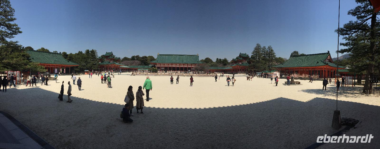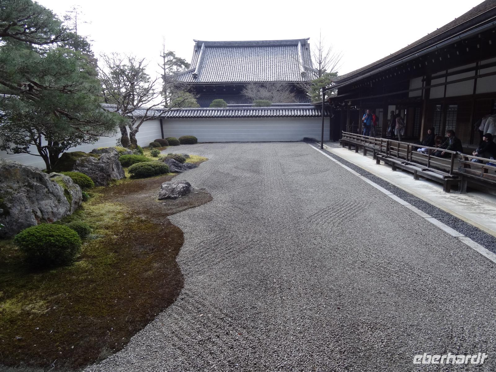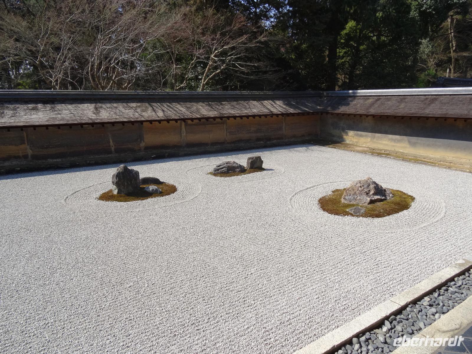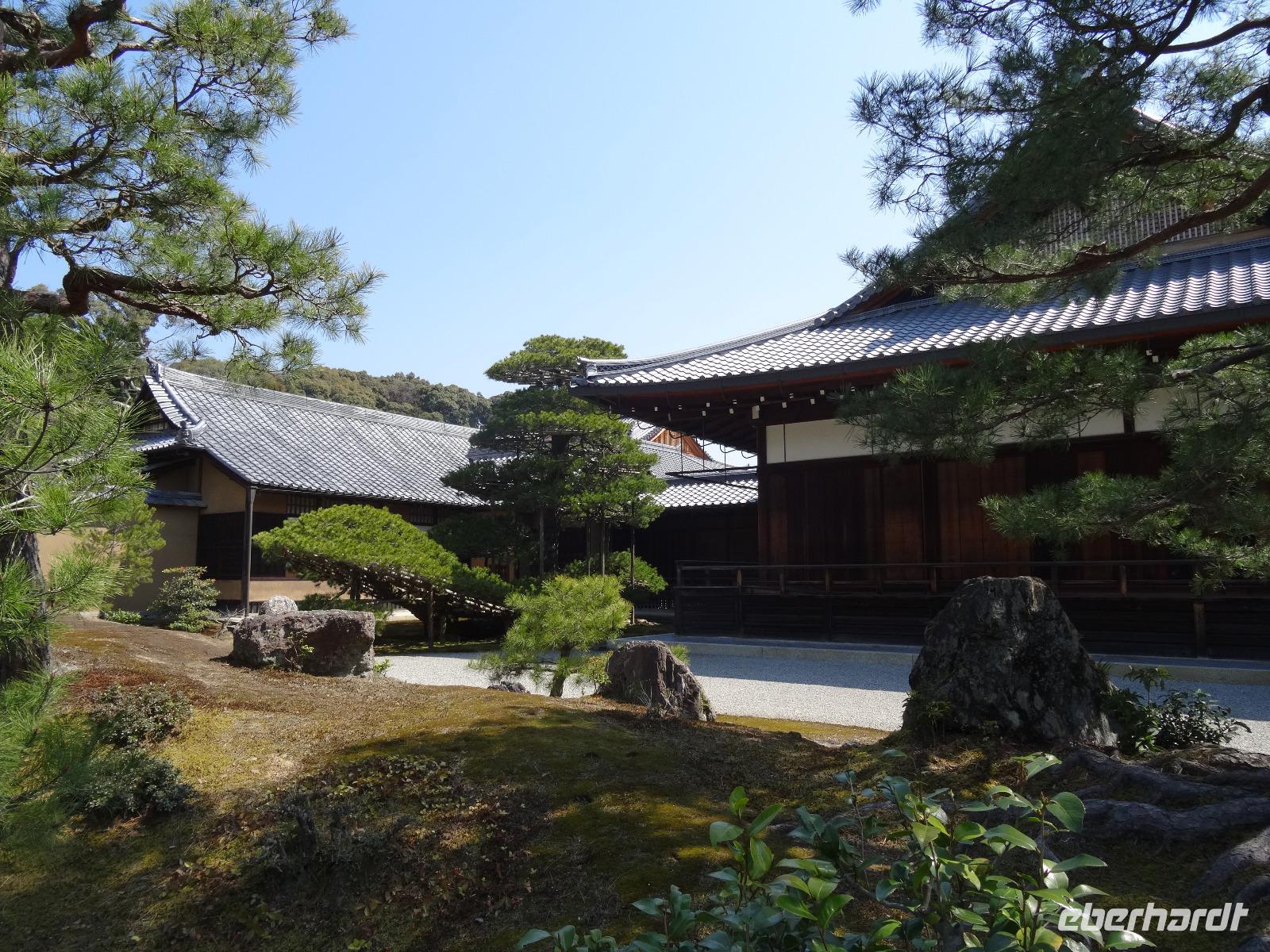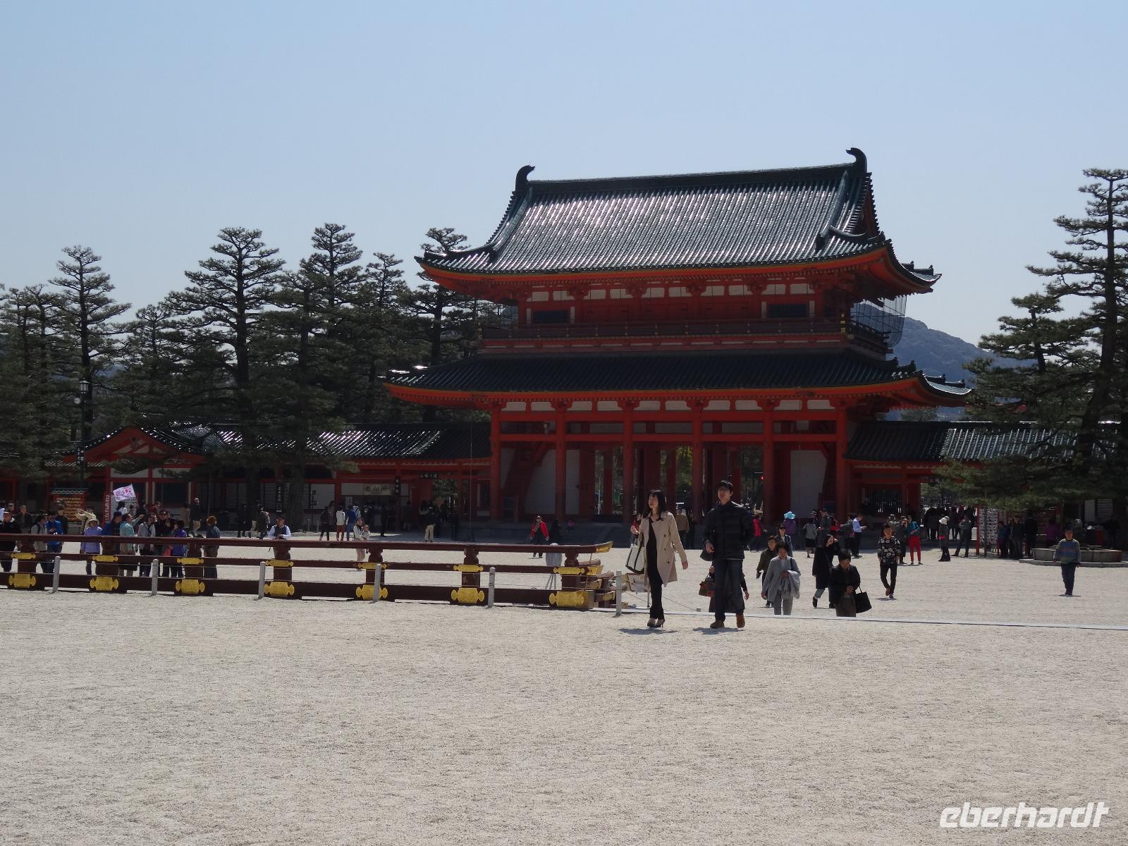 Ein sonniger und angenehm warmer Tag erwartete uns nach der erholsamen ersten Nacht in Kyoto. Die ehemalige Kaiserresidenz hat auch heute noch größte geschichtliche Bedeutung und ist mit über 2000 Tempeln, Schreinen und Gartenanlagen das kulturelle Zentrum Japans. Mehr als ein Dutzend Tempel und Schreine wurden von der UNESCO zum Weltkulturerbe ernannt. Einer davon ist der Ryoan-ji Schrein im Nordwesten der Stadt, der mit seinem Zen-Garten unser erstes Tagesziel war. Die 30 mal 10 Meter große Fläche des Zen-Gartens, bestehend aus gerechtem Kies und fünf steinernen, bemoosten Inseln, ist die wohl berühmteste Anlage dieser Art in Japan. Wenn man genug Zeit mitbringt und sich nicht der spirituellen Wirkung entzieht, kann man hier innere Ruhe und Frieden finden. Sofern es nicht die vieltausendfache Besucherschaft geben würde, die ein solches Ansinnen bereits kurz nach Öffnung der Anlage zunichte machte. Beim Ausgang tranken wir noch einen Tee, welcher dem Geschmack und der Konsistenz nach eher an eine Brühe erinnerte, aber gesund und kalorienfrei sein sollte. Wir bestiegen wieder unseren Bus und fuhren ein kurzes Stück zum Kinkaku-ji Tempel, der eigentlich Rokuon-ji Tempel heißt, aufgrund der berühmten, blattgoldenen Reliquienhalle aber unter diesem Namen (Kinkaku - Goldener Pavillon) Geltung erlangte. Eine schier unendliche Zahl an Besuchern schob sich mit uns durch die Anlage, die wir nach einer knappen Stunde wieder verließen. Nächstes Ziel war der Heian-Schrein, 1100 Jahre nach der Gründung Kyotos zu Ehren des ersten und letzten japanischen Kaisers erbaut, die von Kyoto aus herrschten. Durch das zweitgrößte Torii Japans gelangte man zu einer wahrhaft majestätischen Anlage, die eine etwas kleinere Version des ehemaligen Kaiserpalastes darstellt. Wir spazierten durch die angrenzende Teich- und Gartenlandschaft und genossen das landschaftlich schöne Ensemble. Zur Mittagszeit begaben wir uns zu einem Spaziergang auf den Philosophenweg, der seinen Namen dem Philosophen Nishida verdankt, der hier regelmäßig meditierend spazieren ging. Der Weg wird unter anderem von Kirschbäumen gesäumt, die allerdings zu unserer Zeit noch nicht in voller Blüte standen. Vielleicht konnten wir deshalb relativ entspannt die knapp zwei Kilometer bis zum Nanzen-ji Tempel zurücklegen, ohne tausenden Mitläufern auf die Füße und in die Hacken zu treten. Nachteile beinhalten auch manchmal Vorteile... Der Nanzen-ji Tempel beeindruckte uns vor allem wegen seines traditionellen Hojo-Stein-Gartens und dem imposanten San-Mon-Tor, von dessen Plattform man einen guten Blick auf die nähere Umgebung hatte. Von hier aus bewegten wir uns mit Taxen zu unserem letzten Programmpunkt am heutigen Tag. Im Miyagawa-cho Kaburenjo-Theater erlebten wir eine Aufführung der berühmten Kyo Odori, der alljährlich im Frühjahr stattfindenden Kirschblüten-Tänze, vorgetragen von Geikos und Maikos, in Kyoto die Bezeichnung einer Geisha bzw. der Auszubildenden. War das Schauspiel vom Rhythmus, der Darstellung und den farbenprächtigen Kimonos auch eine Augenweide, so war es gleichzeitig für europäische Ohren eine Herausforderung, im scheinbaren Gleichklang der musikalischen Laute Unterschiede zu erkennen. Gleichwohl war es ein tolles Erlebnis, welches wir sicher nicht vergessen werden. Den Abend ließen wir wieder bei einem sehr guten japanischen Essen ausklingen und freuten uns auf die Entdeckungen des morgigen, (vor)letzten Tages unserer Japanreise.
