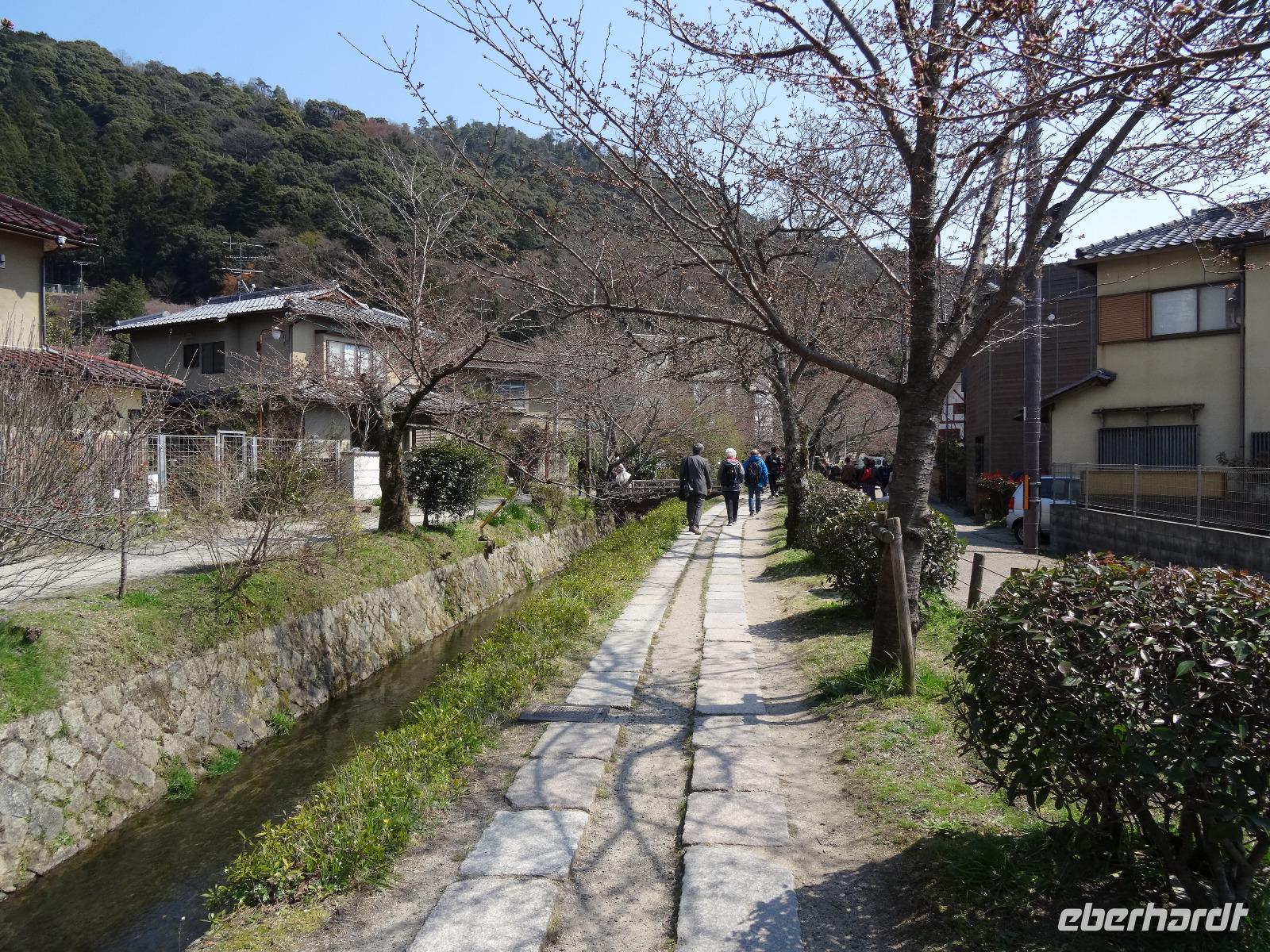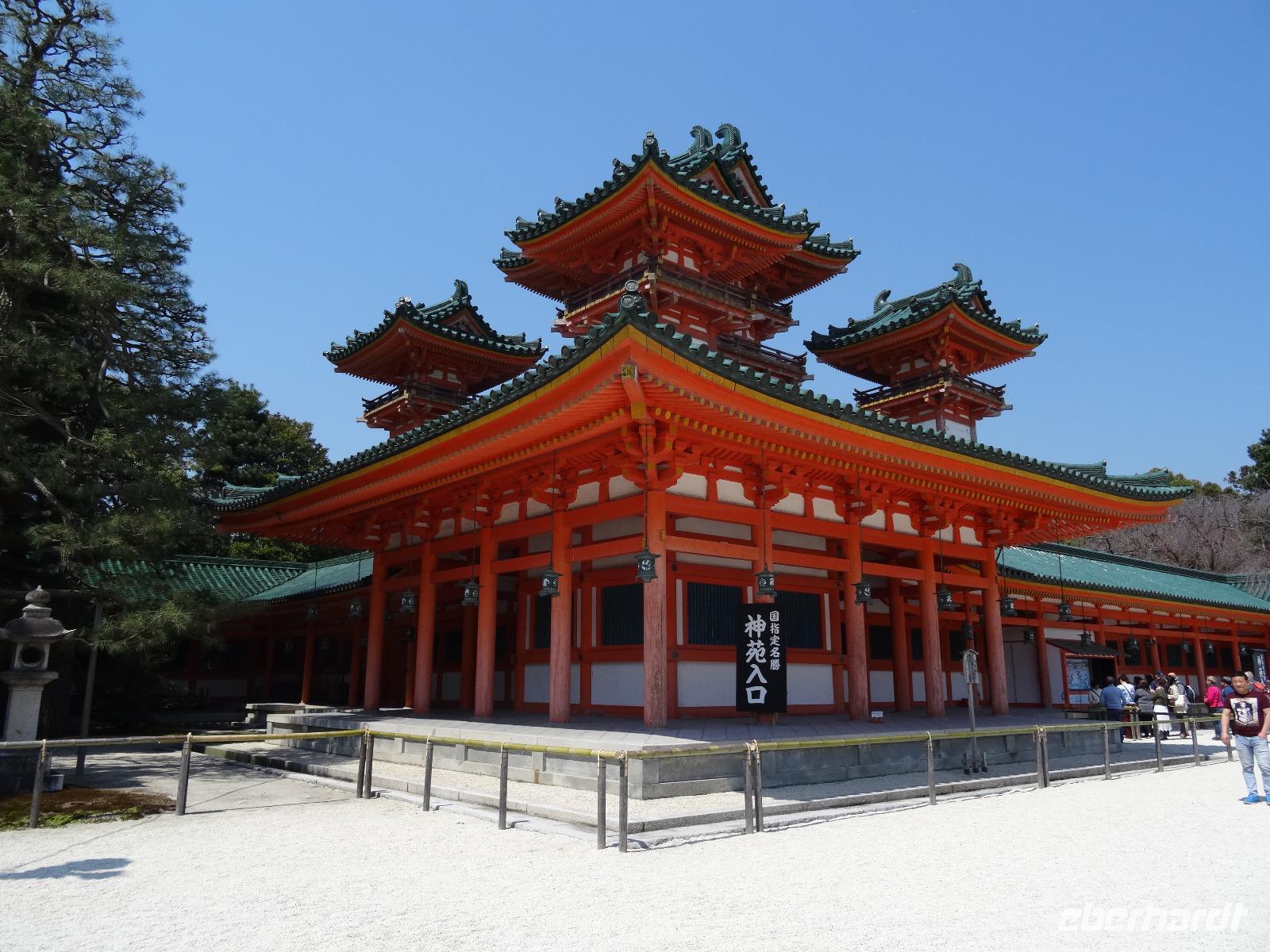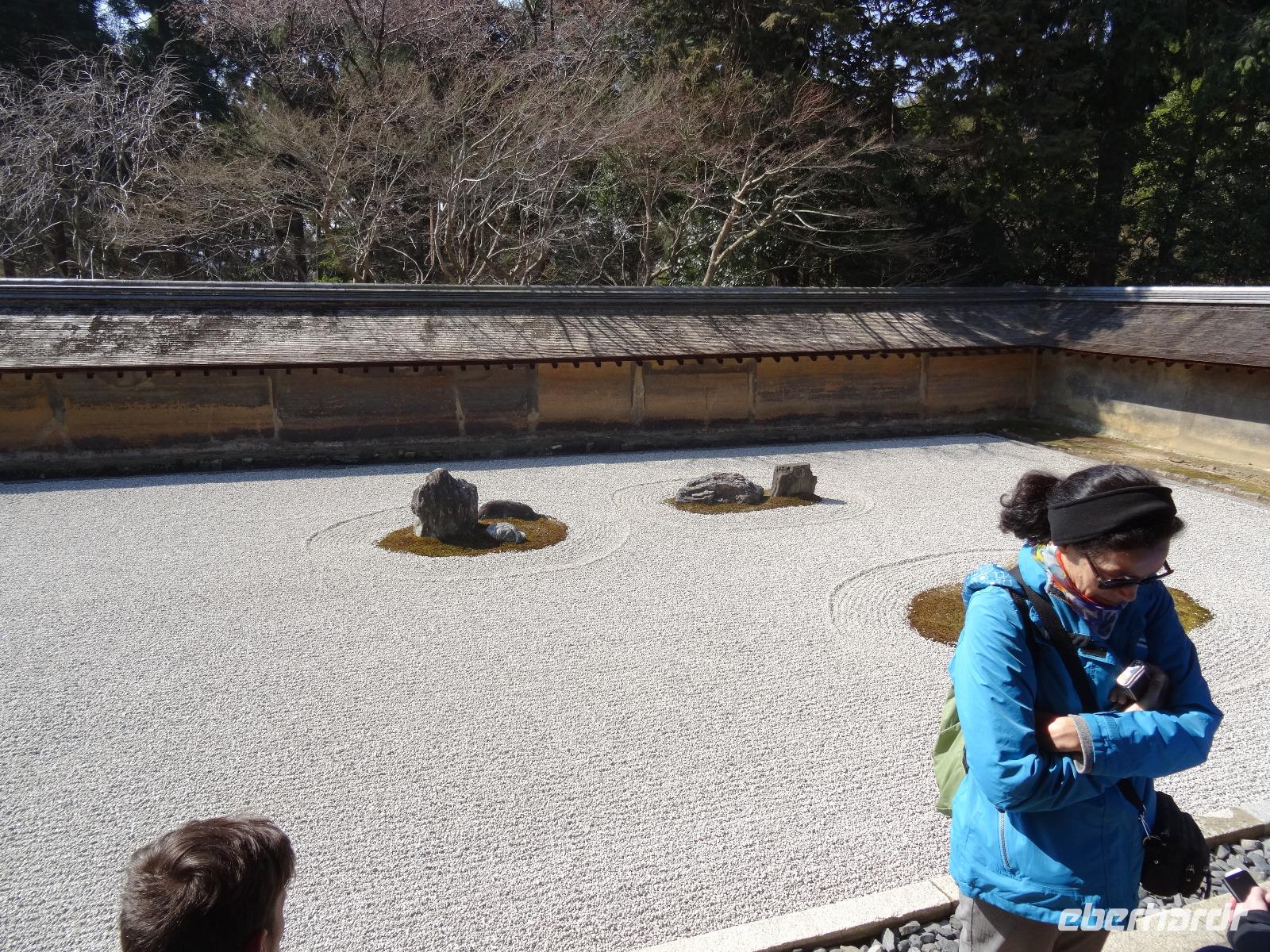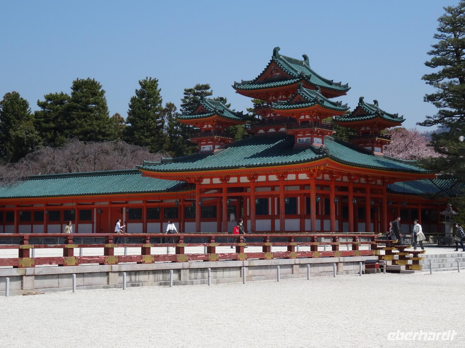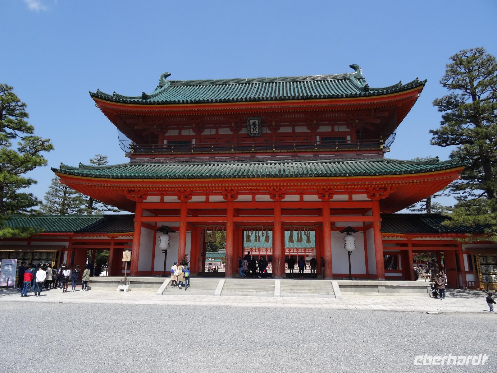Ein sonniger und angenehm warmer Tag erwartete uns nach der erholsamen ersten Nacht in Kyoto. Die ehemalige Kaiserresidenz hat auch heute noch größte geschichtliche Bedeutung und ist mit über 2000 Tempeln, Schreinen und Gartenanlagen das kulturelle Zentrum Japans. Mehr als ein Dutzend Tempel und Schreine wurden von der UNESCO zum Weltkulturerbe ernannt. Einer davon ist der Ryoan-ji Schrein im Nordwesten der Stadt, der mit seinem Zen-Garten unser erstes Tagesziel war. Die 30 mal 10 Meter große Fläche des Zen-Gartens, bestehend aus gerechtem Kies und fünf steinernen, bemoosten Inseln, ist die wohl berühmteste Anlage dieser Art in Japan. Wenn man genug Zeit mitbringt und sich nicht der spirituellen Wirkung entzieht, kann man hier innere Ruhe und Frieden finden. Sofern es nicht die vieltausendfache Besucherschaft geben würde, die ein solches Ansinnen bereits kurz nach Öffnung der Anlage zunichte machte. Beim Ausgang tranken wir noch einen Tee, welcher dem Geschmack und der Konsistenz nach eher an eine Brühe erinnerte, aber gesund und kalorienfrei sein sollte. Wir bestiegen wieder unseren Bus und fuhren ein kurzes Stück zum Kinkaku-ji Tempel, der eigentlich Rokuon-ji Tempel heißt, aufgrund der berühmten, blattgoldenen Reliquienhalle aber unter diesem Namen (Kinkaku - Goldener Pavillon) Geltung erlangte. Eine schier unendliche Zahl an Besuchern schob sich mit uns durch die Anlage, die wir nach einer knappen Stunde wieder verließen. Nächstes Ziel war der Heian-Schrein, 1100 Jahre nach der Gründung Kyotos zu Ehren des ersten und letzten japanischen Kaisers erbaut, die von Kyoto aus herrschten. Durch das zweitgrößte Torii Japans gelangte man zu einer wahrhaft majestätischen Anlage, die eine etwas kleinere Version des ehemaligen Kaiserpalastes darstellt. Wir spazierten durch die angrenzende Teich- und Gartenlandschaft und genossen das landschaftlich schöne Ensemble. Zur Mittagszeit begaben wir uns zu einem Spaziergang auf den Philosophenweg, der seinen Namen dem Philosophen Nishida verdankt, der hier regelmäßig meditierend spazieren ging. Der Weg wird unter anderem von Kirschbäumen gesäumt, die allerdings zu unserer Zeit noch nicht in voller Blüte standen. Vielleicht konnten wir deshalb relativ entspannt die knapp zwei Kilometer bis zum Nanzen-ji Tempel zurücklegen, ohne tausenden Mitläufern auf die Füße und in die Hacken zu treten. Nachteile beinhalten auch manchmal Vorteile... Der Nanzen-ji Tempel beeindruckte uns vor allem wegen seines traditionellen Hojo-Stein-Gartens und dem imposanten San-Mon-Tor, von dessen Plattform man einen guten Blick auf die nähere Umgebung hatte. Von hier aus bewegten wir uns mit Taxen zu unserem letzten Programmpunkt am heutigen Tag. Im Miyagawa-cho Kaburenjo-Theater erlebten wir eine Aufführung der berühmten Kyo Odori, der alljährlich im Frühjahr stattfindenden Kirschblüten-Tänze, vorgetragen von Geikos und Maikos, in Kyoto die Bezeichnung einer Geisha bzw. der Auszubildenden. War das Schauspiel vom Rhythmus, der Darstellung und den farbenprächtigen Kimonos auch eine Augenweide, so war es gleichzeitig für europäische Ohren eine Herausforderung, im scheinbaren Gleichklang der musikalischen Laute Unterschiede zu erkennen. Gleichwohl war es ein tolles Erlebnis, welches wir sicher nicht vergessen werden. Den Abend ließen wir wieder bei einem sehr guten japanischen Essen ausklingen und freuten uns auf die Entdeckungen des morgigen, (vor)letzten Tages unserer Japanreise.