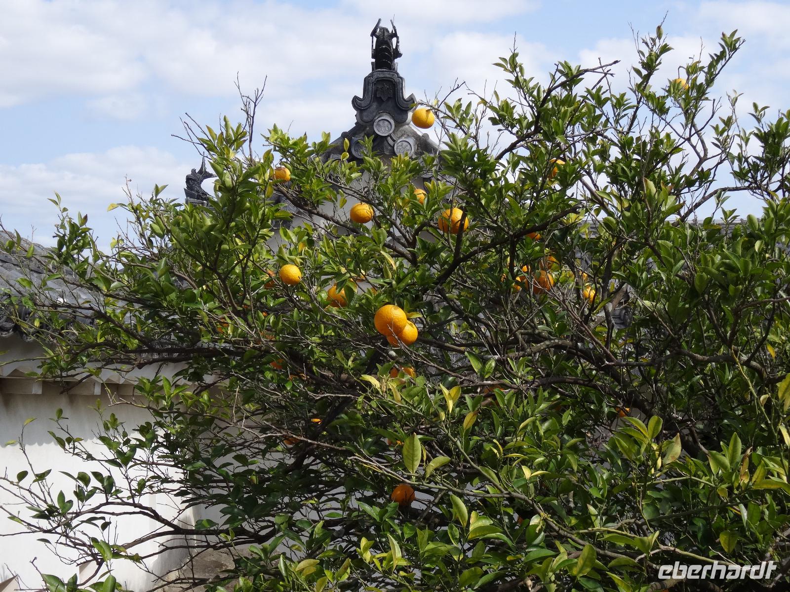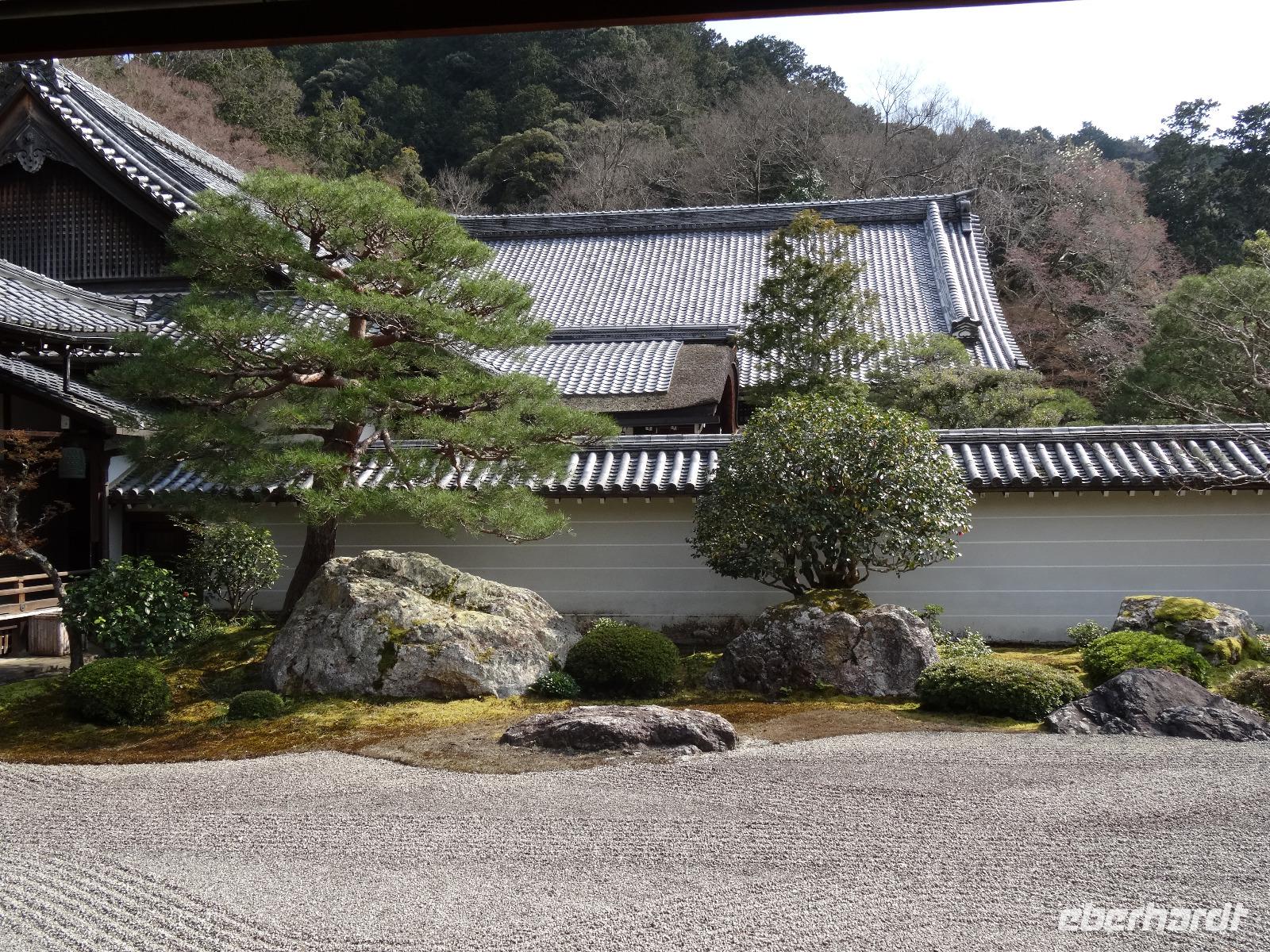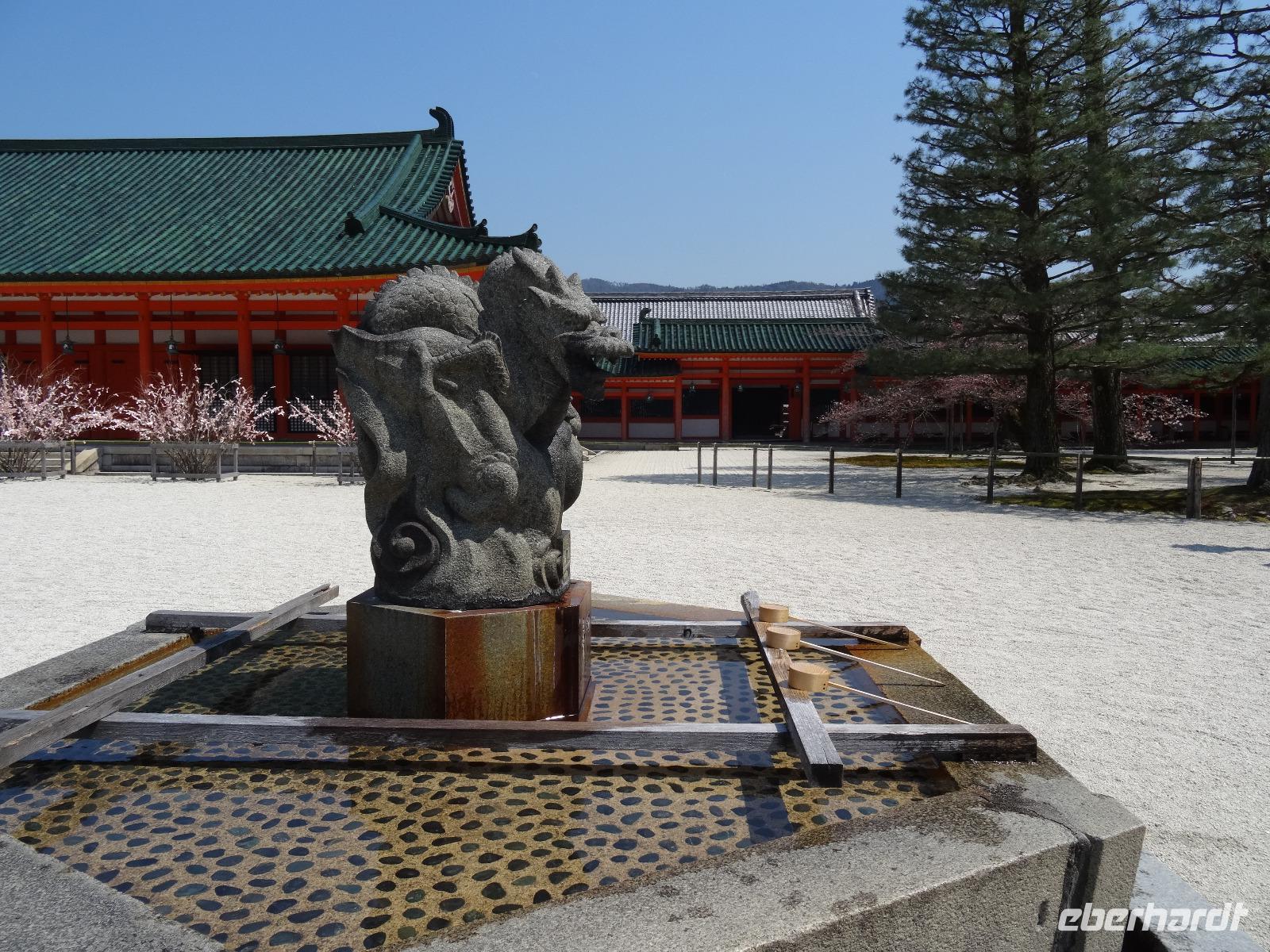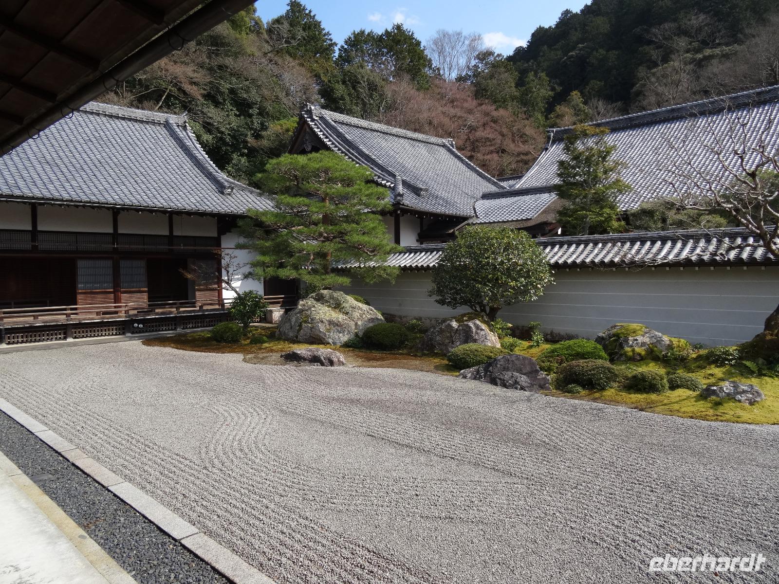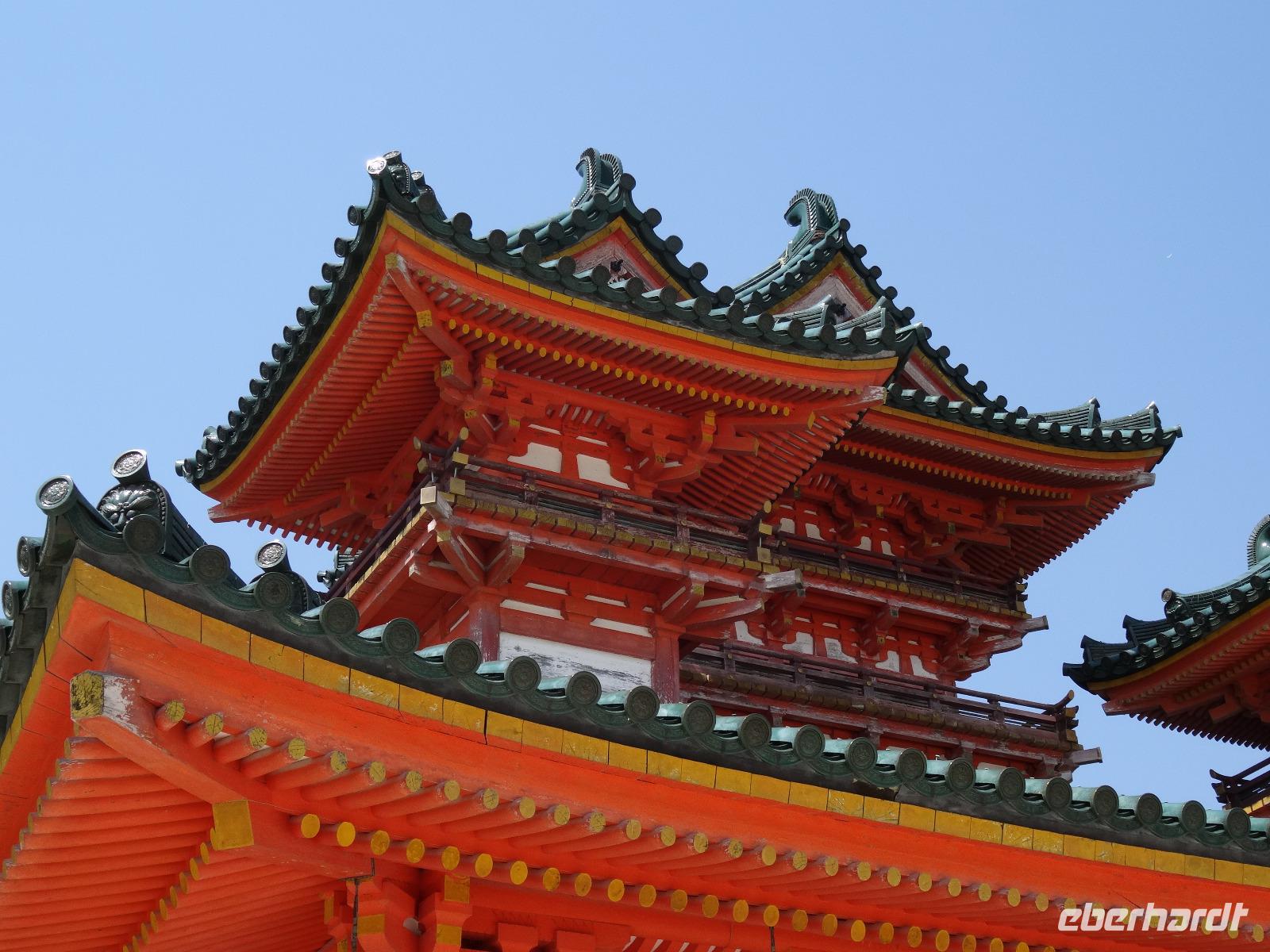 Ein sonniger und angenehm warmer Tag erwartete uns nach der erholsamen ersten Nacht in Kyoto. Die ehemalige Kaiserresidenz hat auch heute noch größte geschichtliche Bedeutung und ist mit über 2000 Tempeln, Schreinen und Gartenanlagen das kulturelle Zentrum Japans. Mehr als ein Dutzend Tempel und Schreine wurden von der UNESCO zum Weltkulturerbe ernannt. Einer davon ist der Ryoan-ji Schrein im Nordwesten der Stadt, der mit seinem Zen-Garten unser erstes Tagesziel war. Die 30 mal 10 Meter große Fläche des Zen-Gartens, bestehend aus gerechtem Kies und fünf steinernen, bemoosten Inseln, ist die wohl berühmteste Anlage dieser Art in Japan. Wenn man genug Zeit mitbringt und sich nicht der spirituellen Wirkung entzieht, kann man hier innere Ruhe und Frieden finden. Sofern es nicht die vieltausendfache Besucherschaft geben würde, die ein solches Ansinnen bereits kurz nach Öffnung der Anlage zunichte machte. Beim Ausgang tranken wir noch einen Tee, welcher dem Geschmack und der Konsistenz nach eher an eine Brühe erinnerte, aber gesund und kalorienfrei sein sollte. Wir bestiegen wieder unseren Bus und fuhren ein kurzes Stück zum Kinkaku-ji Tempel, der eigentlich Rokuon-ji Tempel heißt, aufgrund der berühmten, blattgoldenen Reliquienhalle aber unter diesem Namen (Kinkaku - Goldener Pavillon) Geltung erlangte. Eine schier unendliche Zahl an Besuchern schob sich mit uns durch die Anlage, die wir nach einer knappen Stunde wieder verließen. Nächstes Ziel war der Heian-Schrein, 1100 Jahre nach der Gründung Kyotos zu Ehren des ersten und letzten japanischen Kaisers erbaut, die von Kyoto aus herrschten. Durch das zweitgrößte Torii Japans gelangte man zu einer wahrhaft majestätischen Anlage, die eine etwas kleinere Version des ehemaligen Kaiserpalastes darstellt. Wir spazierten durch die angrenzende Teich- und Gartenlandschaft und genossen das landschaftlich schöne Ensemble. Zur Mittagszeit begaben wir uns zu einem Spaziergang auf den Philosophenweg, der seinen Namen dem Philosophen Nishida verdankt, der hier regelmäßig meditierend spazieren ging. Der Weg wird unter anderem von Kirschbäumen gesäumt, die allerdings zu unserer Zeit noch nicht in voller Blüte standen. Vielleicht konnten wir deshalb relativ entspannt die knapp zwei Kilometer bis zum Nanzen-ji Tempel zurücklegen, ohne tausenden Mitläufern auf die Füße und in die Hacken zu treten. Nachteile beinhalten auch manchmal Vorteile... Der Nanzen-ji Tempel beeindruckte uns vor allem wegen seines traditionellen Hojo-Stein-Gartens und dem imposanten San-Mon-Tor, von dessen Plattform man einen guten Blick auf die nähere Umgebung hatte. Von hier aus bewegten wir uns mit Taxen zu unserem letzten Programmpunkt am heutigen Tag. Im Miyagawa-cho Kaburenjo-Theater erlebten wir eine Aufführung der berühmten Kyo Odori, der alljährlich im Frühjahr stattfindenden Kirschblüten-Tänze, vorgetragen von Geikos und Maikos, in Kyoto die Bezeichnung einer Geisha bzw. der Auszubildenden. War das Schauspiel vom Rhythmus, der Darstellung und den farbenprächtigen Kimonos auch eine Augenweide, so war es gleichzeitig für europäische Ohren eine Herausforderung, im scheinbaren Gleichklang der musikalischen Laute Unterschiede zu erkennen. Gleichwohl war es ein tolles Erlebnis, welches wir sicher nicht vergessen werden. Den Abend ließen wir wieder bei einem sehr guten japanischen Essen ausklingen und freuten uns auf die Entdeckungen des morgigen, (vor)letzten Tages unserer Japanreise.