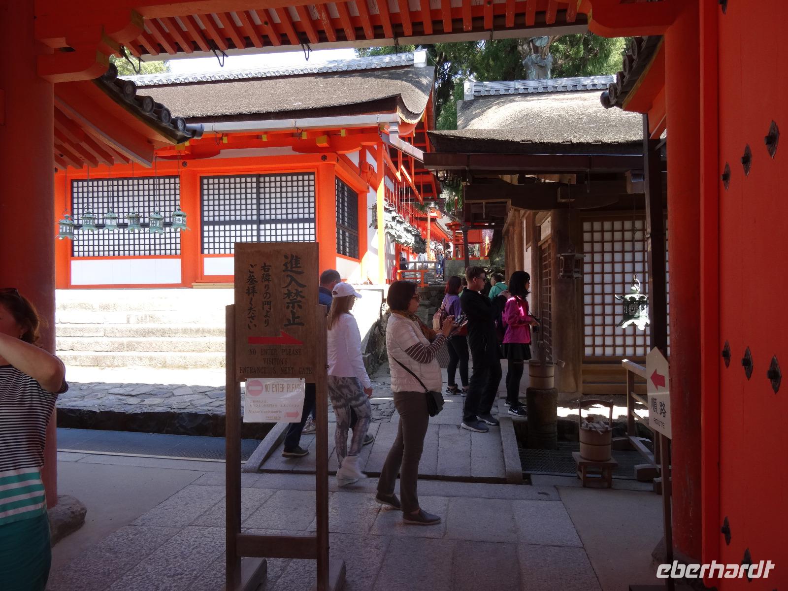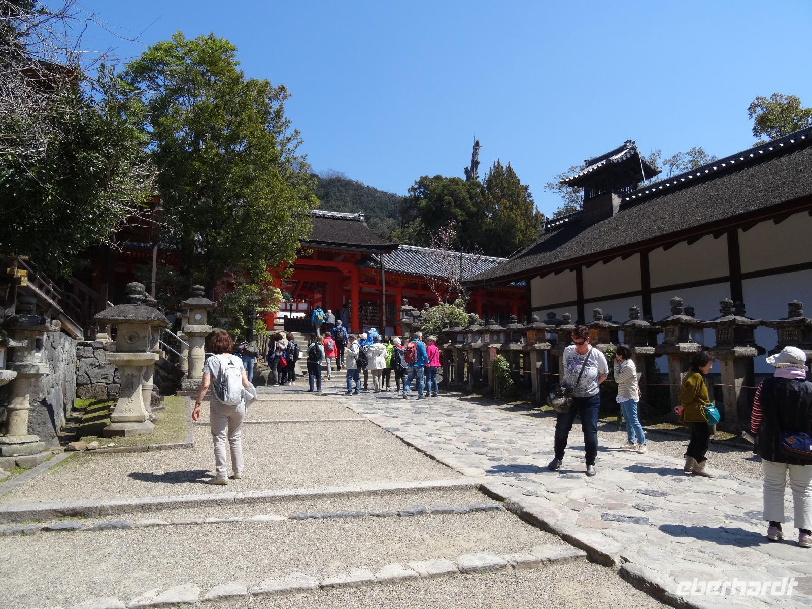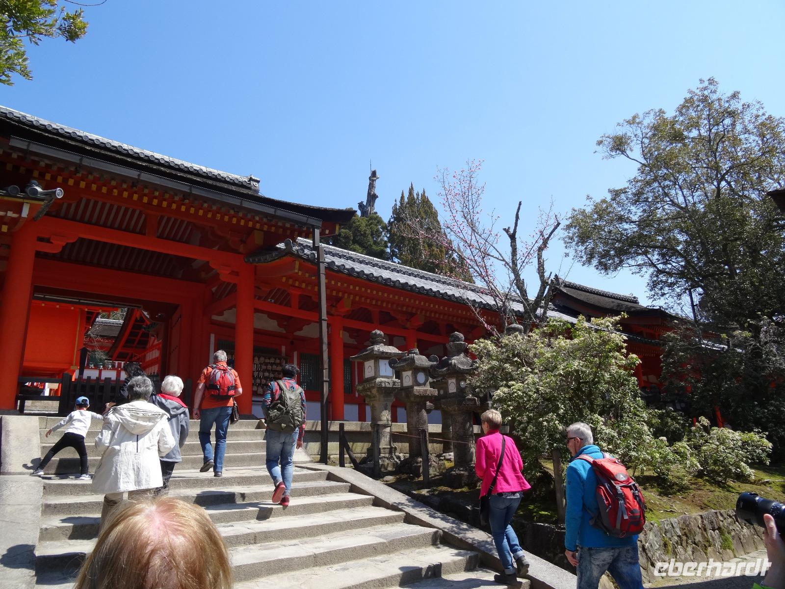 Da war er, der letzte vollständige Tag auf japanischem Boden. Glaubt man zum Beginn einer Reise noch, unendlich viel Zeit zum Entdecken, Erleben und Bestaunen zu haben, relativiert sich der Faktor Zeit mit jedem zu Ende gegangenem Tag. Und plötzlich zählt man nicht mehr in Tagen, sondern in Stunden. Aber dafür in schönen, weil sonnigen Stunden, die uns von Kyoto nach Nara führten, einer kleinen Stadt knapp 50 Kilometer südlich gelegen. In beinahe gewohnter (Fortbewegungs)Manier nahmen wir den morgendlichen Schnellzug nach Nara, wo wir 47 Minuten später an der Kintetsu-Nara-Station wieder aus dem Zug „fielen" und uns für den anschließenden Fußmarsch zum Todaiji-Tempel wappneten. Auch heute war wieder viel Bewegung angesagt, was bei sonnigen 18 Grad aber eher ein Geschenk denn eine Mühe war. Vorbei am buddhistischen Kofukuji-Tempel mit der Five-Story-Pagode gelangten wir zum Himuro-Jinja-Schrein, der uns insbesondere seiner Kirschblüten wegen zum Halten und Fotografieren animierte. Wir hatten ja auf unserer bisherigen Reise noch nicht viele Kirschblüten zu Gesicht bekommen, so dass wir jetzt wie ausgehungert fotografisch über die wenigen Bäume herfielen. Nachdem diese gefühlt leerfotografiert waren, ließen wir von ihnen ab und wandten uns wieder unserem eigentlichen Ziel, der Todaiji-Tempelanlage, zu. Wir erreichten diese gegen 10:30 Uhr mit unserer Ankunft am Nandaimon-Tor, dem großen Südtor aus dem Jahre 1199. Das Alter des Tores war unter anderem auch an den beiden achteinhalb Meter hohen Wächterstatuen ersichtlich, die zu beiden Seiten in die Höhe ragten. Nur wenig Farbe verdeckte die Jahrhunderte, die unverkennbar ihre Spuren hinterlassen hatten. Wir durchschritten das Tor und standen vor dem weltweit größten, nur aus Holz gebauten Gebäude, welches imposant vor uns in die Höhe ragte. Doch nicht nur die hölzernen Gebäudemaße beeindruckten, auch das Innere wartete mit einem Superlativ auf. In ihr befindet sich die fünfzehn Meter hohe, weltweit größte Statue eines bronzenen Buddha (Daibutsu), die zehntausende Handwerker aus 450 Tonnen Kupfer herstellten. Nach einem Rundgang verließen wir die Halle des Großen Buddhas wieder und stärkten uns bei der anschließenden Mittagspause. Der weitere Weg führte uns hernach zum Großen Glockenturm, welcher die zweitgrößte Glocke Japans beherbergte. Die Glocke war mit 3,9 Meter Höhe und 2,8 Meter Durchmesser wahrlich gigantisch! Durch den Nara-Park mit seinen mehr als 1000 steinernen Laternen gelangten wir zum Kasuga-Taisha-Schrein, einem Shinto-Schrein, welcher wahrscheinlich in den Jahren zwischen 710 und 760 erbaut wurde. Er zählt zu den wenigen Schreinen, die zu besonderen Anlässen ein Anrecht auf einen Abgesandten des Tenno haben. Nach kurzer Verweildauer kehrten wir am frühen Nachmittag zum Bahnhof zurück, um mit dem Zug zurück nach Kyoto zu fahren. Vom Bahnhof in Kyoto aus nahmen wir Taxen, die uns zum Fukujuen Honten brachten, wo wir an einer japanischen Teezeremonie teilnahmen und einen Einblick in die beinahe zeremonielle Zubereitung erhielten. Den Abschluss des Tages bildete ein wunderbares Abendessen, welches wir in guter Stimmung bei Sake, Wein und anderen kalten Getränken zu uns nahmen. Mit etwas Wehmut, aber auch Vorfreude auf die Heimat, gingen wir spät am Abend zu Bett, nicht ohne noch vorher die „Reisebereitschaft" hergestellt zu haben.