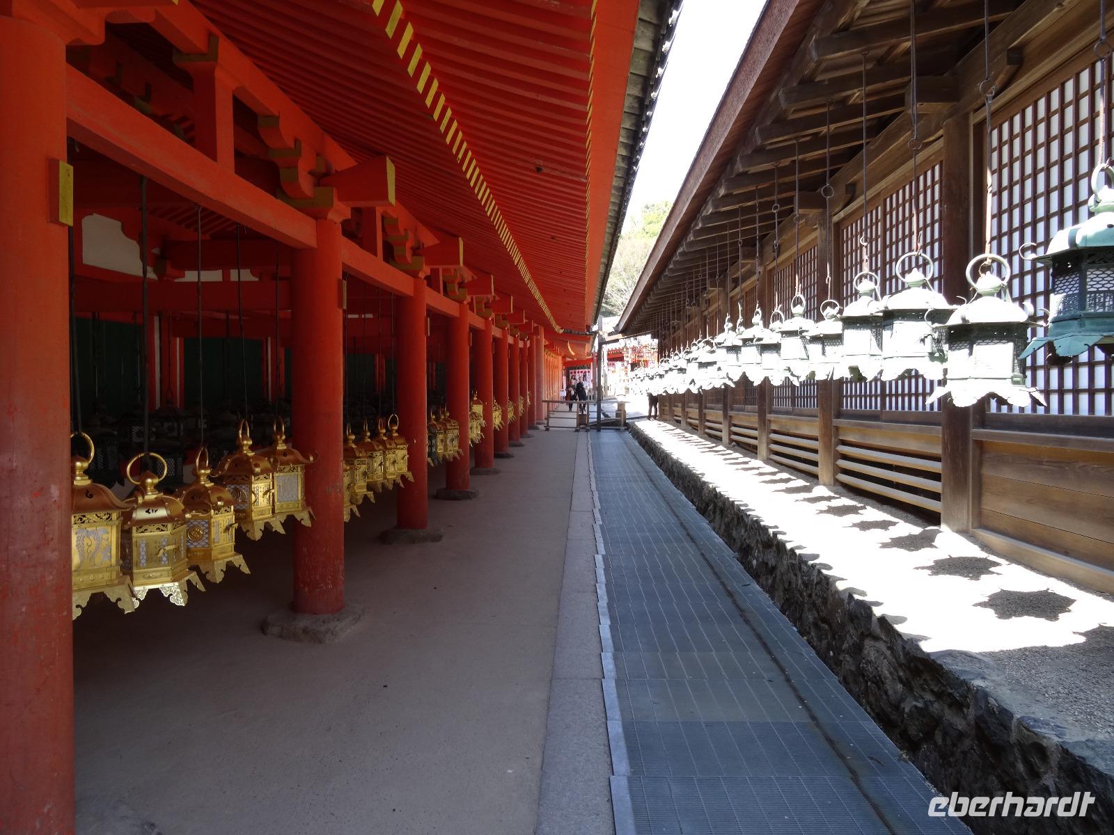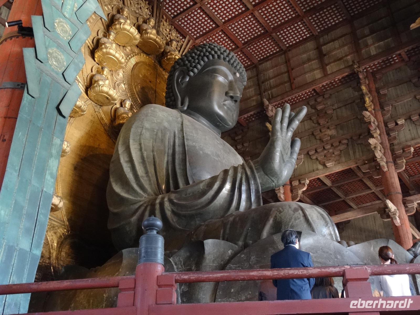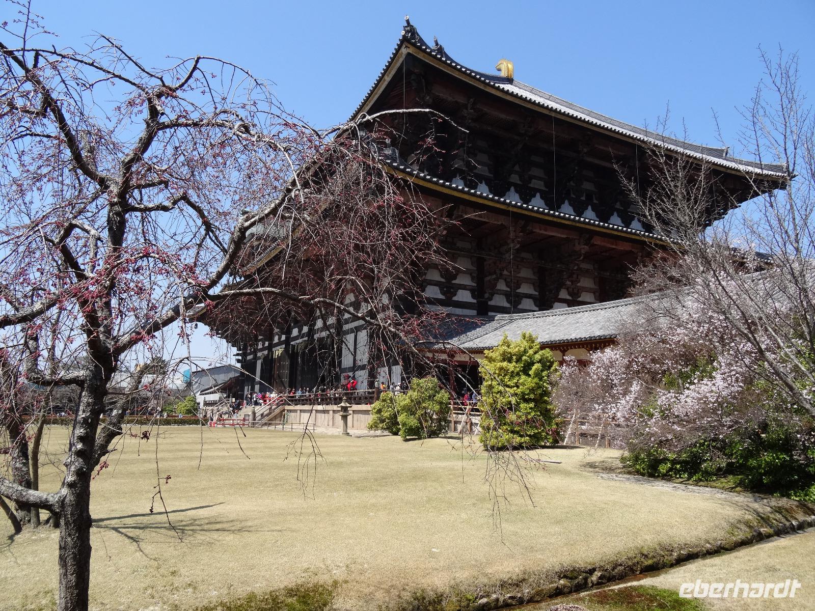 Da war er, der letzte vollständige Tag auf japanischem Boden. Glaubt man zum Beginn einer Reise noch, unendlich viel Zeit zum Entdecken, Erleben und Bestaunen zu haben, relativiert sich der Faktor Zeit mit jedem zu Ende gegangenem Tag. Und plötzlich zählt man nicht mehr in Tagen, sondern in Stunden. Aber dafür in schönen, weil sonnigen Stunden, die uns von Kyoto nach Nara führten, einer kleinen Stadt knapp 50 Kilometer südlich gelegen. In beinahe gewohnter (Fortbewegungs)Manier nahmen wir den morgendlichen Schnellzug nach Nara, wo wir 47 Minuten später an der Kintetsu-Nara-Station wieder aus dem Zug „fielen" und uns für den anschließenden Fußmarsch zum Todaiji-Tempel wappneten. Auch heute war wieder viel Bewegung angesagt, was bei sonnigen 18 Grad aber eher ein Geschenk denn eine Mühe war. Vorbei am buddhistischen Kofukuji-Tempel mit der Five-Story-Pagode gelangten wir zum Himuro-Jinja-Schrein, der uns insbesondere seiner Kirschblüten wegen zum Halten und Fotografieren animierte. Wir hatten ja auf unserer bisherigen Reise noch nicht viele Kirschblüten zu Gesicht bekommen, so dass wir jetzt wie ausgehungert fotografisch über die wenigen Bäume herfielen. Nachdem diese gefühlt leerfotografiert waren, ließen wir von ihnen ab und wandten uns wieder unserem eigentlichen Ziel, der Todaiji-Tempelanlage, zu. Wir erreichten diese gegen 10:30 Uhr mit unserer Ankunft am Nandaimon-Tor, dem großen Südtor aus dem Jahre 1199. Das Alter des Tores war unter anderem auch an den beiden achteinhalb Meter hohen Wächterstatuen ersichtlich, die zu beiden Seiten in die Höhe ragten. Nur wenig Farbe verdeckte die Jahrhunderte, die unverkennbar ihre Spuren hinterlassen hatten. Wir durchschritten das Tor und standen vor dem weltweit größten, nur aus Holz gebauten Gebäude, welches imposant vor uns in die Höhe ragte. Doch nicht nur die hölzernen Gebäudemaße beeindruckten, auch das Innere wartete mit einem Superlativ auf. In ihr befindet sich die fünfzehn Meter hohe, weltweit größte Statue eines bronzenen Buddha (Daibutsu), die zehntausende Handwerker aus 450 Tonnen Kupfer herstellten. Nach einem Rundgang verließen wir die Halle des Großen Buddhas wieder und stärkten uns bei der anschließenden Mittagspause. Der weitere Weg führte uns hernach zum Großen Glockenturm, welcher die zweitgrößte Glocke Japans beherbergte. Die Glocke war mit 3,9 Meter Höhe und 2,8 Meter Durchmesser wahrlich gigantisch! Durch den Nara-Park mit seinen mehr als 1000 steinernen Laternen gelangten wir zum Kasuga-Taisha-Schrein, einem Shinto-Schrein, welcher wahrscheinlich in den Jahren zwischen 710 und 760 erbaut wurde. Er zählt zu den wenigen Schreinen, die zu besonderen Anlässen ein Anrecht auf einen Abgesandten des Tenno haben. Nach kurzer Verweildauer kehrten wir am frühen Nachmittag zum Bahnhof zurück, um mit dem Zug zurück nach Kyoto zu fahren. Vom Bahnhof in Kyoto aus nahmen wir Taxen, die uns zum Fukujuen Honten brachten, wo wir an einer japanischen Teezeremonie teilnahmen und einen Einblick in die beinahe zeremonielle Zubereitung erhielten. Den Abschluss des Tages bildete ein wunderbares Abendessen, welches wir in guter Stimmung bei Sake, Wein und anderen kalten Getränken zu uns nahmen. Mit etwas Wehmut, aber auch Vorfreude auf die Heimat, gingen wir spät am Abend zu Bett, nicht ohne noch vorher die „Reisebereitschaft" hergestellt zu haben.