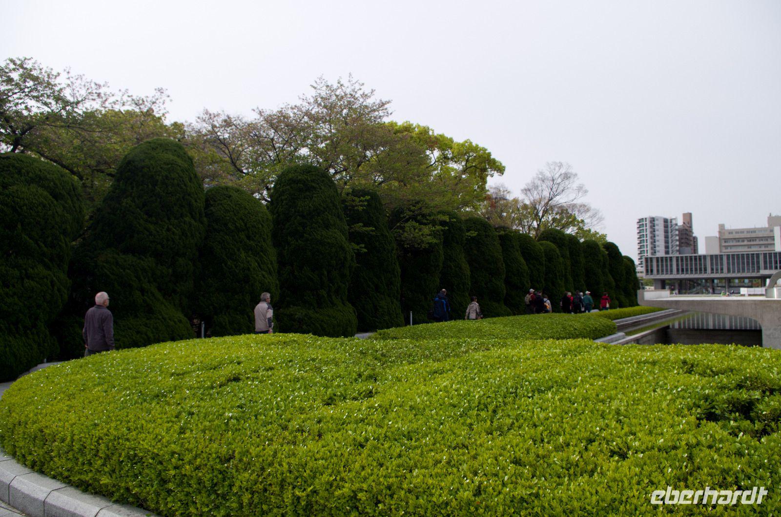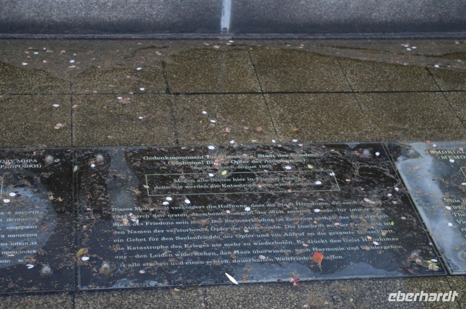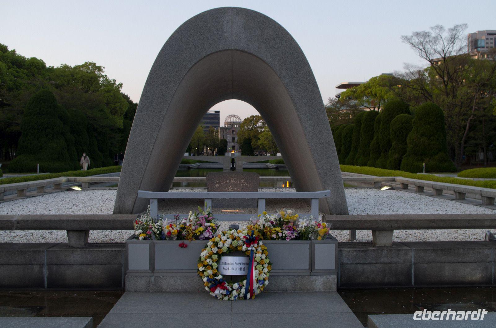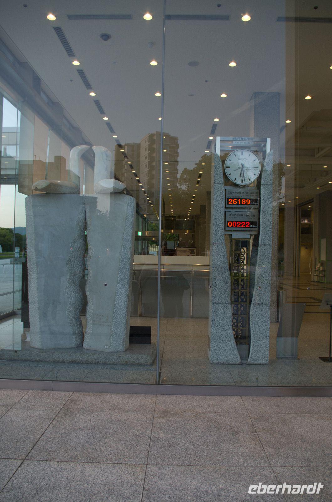 Die Wetteraussichten des heutigen Tages sehen am Morgen noch nicht so gut aus, nachts hat es stark geregnet. Aber wir sind ja eine Glücksgruppe, das Wetter wird sicherlich noch besser werden im Laufe des Tages! Gegen 06.45 Uhr geben wir unsere Koffer an der Rezeption ab und genießen anschließend ein leckeres Frühstücksbuffet im Restaurant Bijoux. Wenig später checken wir aus und laufen gemeinsam nur mit unserem Handgepäck beladen zum rund fünf Gehminuten entfernten Bahnhof von Takayama. Um 08.00 Uhr fahren wir mit dem Regionalexpress HIDA 4 von Takayama nach Nagoya. Wir haben reservierte Sitzplätze im Car 2. Im Regionalexpress gibt es zwar keinen Servicewagen, aber Toiletten sind vorhanden. Pünktlich um 10.33 Uhr erreichen wir Nagoya, von wo wir um 11.11 Uhr mit dem Shinkansen HIKARI 465 nach Himeji weiterfahren. Unsere Sitzplätze sind im Car 16 reserviert. Shinkansen sind Hochgeschwindigkeitszüge mit einer Höchstgeschwindigkeit bis zu 300 Kilometern pro Stunde. Im Zug kommt aller 30 bis 60 Minuten ein Servierwagen zum Erwerb unter anderem von Kleinigkeiten wie Kaffee, Snacks oder Getränken vorbei. Es sind mehrere Toiletten an Bord vorhanden. Pünktlich um 12.42 Uhr erreichen wir Himeji. Unser nicht benötigtes Handgepäck schließen wir in die im Bahnhof vorhandenen Schließfächer ein. Die Preise liegen für ein kleines Schließfach für maximal einen Rucksack und eine kleine Tasche bei 300 YEN, für ein mittleres Schließfach für maximal zwei Rucksäcke und eine kleine Tasche bei 500 YEN. Mehrere Gäste teilen sich daher die Schließfächer. Die Schließfächer nehmen nur 100-YEN-Münzen an, die 500-YEN-Münzen können aber direkt an einem Automaten bei den Schließfächern getauscht werden. Dann spazieren wir rund 20 bis 30 Minuten gemeinsam zur im 16./17. Jahrhundert errichteten Burg Himeji-jo. Sie ist auch als "Burg der Weißen Reiher" bekannt, da ihre weiße Gestalt eine Anspielung auf die Landung eines weißen Silberreihers darstellen soll. Wir besichtigen die Burg zusammen mit Chisako, den Rückweg zum Bahnhof treten wir entweder individuell oder in der Gruppe an. Mit der Burg ist besonders die Geschichte um die Prinzessin Senhime, die Enkelin des Shoguns Ieyasu, verbunden. Eine von vielen unterschiedlichen Legenden besagt, dass Senhime im Alter von sieben Jahren mit dem feindlichen elfjährigen Monarchen Toyotomi Hideyori verheiratet wurde. Dieser Monarch wurde wenig später vernichtet, aber Senhime konnte gerettet werden. Sie verliebte sich dann angeblich auf den ersten Blick in Honda Tadatoki, welcher später Burgherr von Himeji-jo wurde. Eine im Sengoku Zeitalter der "Streitenden Reichen" sehr selten vorkommende Liebesheirat erfolgte und sie lebten der Legende nach glücklich auf der Burg Himeji. Eine schöne Geschichte ist es zwar, aber wie wahr diese ist, bleibt dem Erzähler überlassen! Wir laufen gemeinsam durch "Hishi no Mon", das größte Tor der Burg, und wir kommen am Sangoku Graben "Sangoku Bori" gleich nach dem Eingang vorbei. Besonders interessant sind wohl die runden und flachen Dachziegel "Jujimon Gawara" mit verschiedenen Mustern, welche jeweils die sechs unterschiedlichen Familienwappen der Burgherren zeigen. Wer möchte, erklimmt gemeinsam mit Chisako und der Reisebegleitung das fünfstöckige Bauwerk, den großen weißen Turm "Daitenshu". Im Inneren besitzt der Turm aber insgesamt sieben Stockwerke, bestehend aus einem Kellergeschoss und sechs oberirdischen Etagen. Im Kellergeschoss sehen wir beispielsweise eine Miniaturausgabe der Burg zur damaligen Zeit. Weitere interessante Sehenswürdigkeiten sind zum Beispiel die verschiedenen Säulen "Nishi Obashira" oder "Higashi Obashira" über alle Etagen sowie der Schrein "Osakabe" in der sechsten Etage. Auf dem Rückweg zum Bahnhof kaufen wir unter anderem einen Mittagssnack im 7 Eleven oder auch ein leckeres Eis. Um 15.30 Uhr finden wir uns bei den Schließfächern ein, entnehmen unser Handgepäck und fahren pünktlich um 16.22 Uhr mit Shinkansen SAKURA 563 auf vorreservierten Sitzplätzen im Car 8 von Himeji nach Hiroshima. Toiletten und Servicewagen sind abermals vorhanden. Pünktlich eine Stunde später erreichen wir die rund 1,1 Millionen große Metropole Hiroshima und fahren im Taxi zum 3-Sterne-Plus-Hotel "Sunroute Hiroshima". Wir benötigen fünf Taxis mit je einem "Gruppenführer", welcher das Geld verwaltet. Unsere örtliche Reiseleiterin nennt den Taxifahrern das Ziel und steigt selbst in das letzte Taxi ein. Es klappt alles wunderbar und nur wenige Minuten später erreichen wir das zentral gelegene Hotel. Der Check-In verläuft reibungslos. Chisako schlägt uns vor, noch einen Spaziergang durch den Friedenspark "Peace Memorial Park" zu unternehmen, sofern dies von uns gewünscht ist. Die Gruppe begrüßt den Vorschlag, so dass wir in unserem Zimmer nur kurz zum Auffrischen verweilen. Gegen 18.20 Uhr treffen wir uns in der Hotellobby und laufen durch den Friedenspark zum Friedensdenkmal. Der Gedenk-Kenotaph stammt vom Architekten Tage Kenzo. Auf dem Kenotaph lesen wir die deutsche Übersetzung der Inschrift "Yasuraka ni nemutte kudasai, ayamachi wa kurikaeshimasenu kara", welche "Bitte ruhet in Frieden, denn die Fehler werden nicht wiederholt werden" lautet. Wir laufen weiter und sehen die "ewige Flamme des Friedens". Das ebenfalls von Kenzo Tange entworfene Denkmal zeigt zwei sich wie ein Kelch nach oben hin öffnende zusammengelegte Hände mit dem "ewigen Feuer" in der Mitte. Seit dem 1. August 1964 ist das Feuer nicht mehr erloschen. Ein weiteres Denkmal wurde zur Erinnerung an das leukämiekranke Mädchen Sadako Sasaki gebaut, die weltweit bekannteste Überlebende "Hibakusha" der Atombombenabwürfe. Einer alten japanischen Legende nach faltete sie über 1.000 Origami-Papierkraniche, damit die Götter ihr den Wunsch erfüllten, von der Krankheit geheilt zu werden. Dieser Wunsch wurde dem zwölfjährigen Mädchen bedauerlicherweise verwehrt und sie starb 1955. Es folgt die Ruine der eh