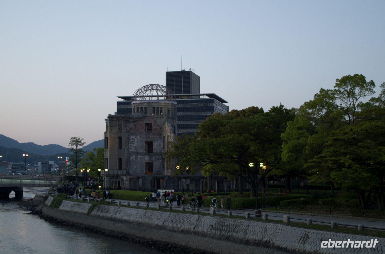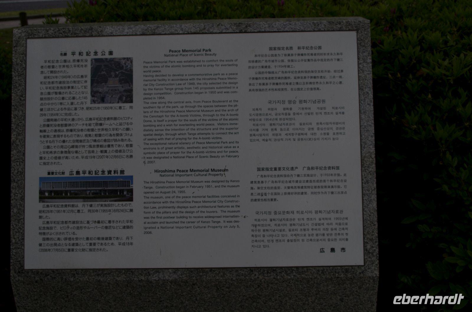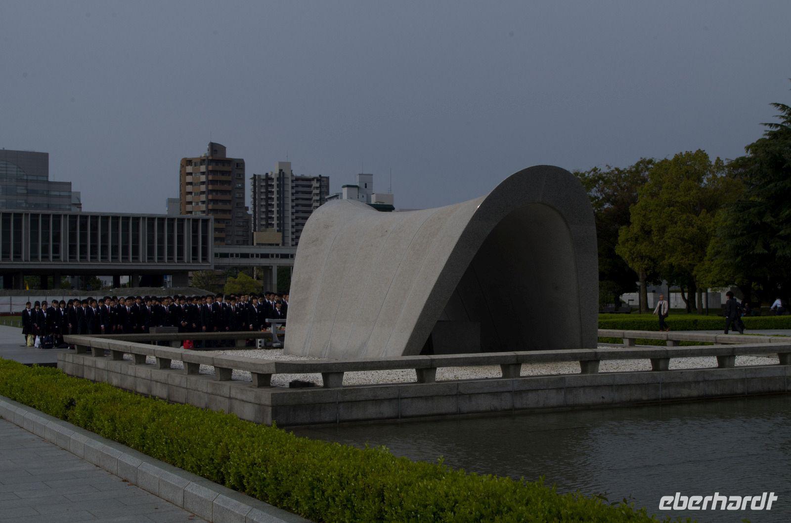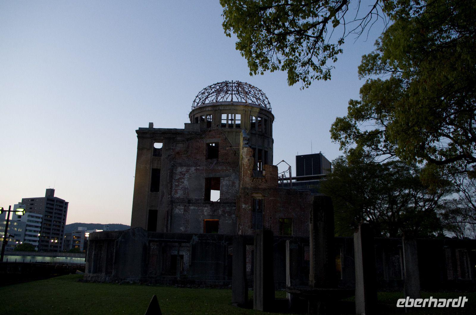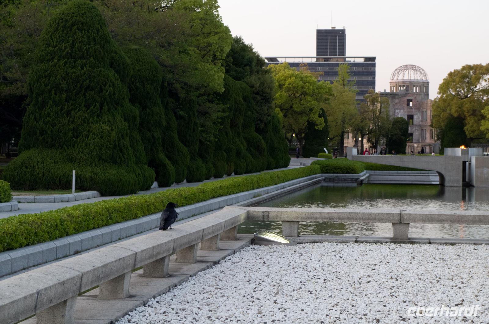 Die Wetteraussichten des heutigen Tages sehen am Morgen noch nicht so gut aus, nachts hat es stark geregnet. Aber wir sind ja eine Glücksgruppe, das Wetter wird sicherlich noch besser werden im Laufe des Tages! Gegen 06.45 Uhr geben wir unsere Koffer an der Rezeption ab und genießen anschließend ein leckeres Frühstücksbuffet im Restaurant Bijoux. Wenig später checken wir aus und laufen gemeinsam nur mit unserem Handgepäck beladen zum rund fünf Gehminuten entfernten Bahnhof von Takayama. Um 08.00 Uhr fahren wir mit dem Regionalexpress HIDA 4 von Takayama nach Nagoya. Wir haben reservierte Sitzplätze im Car 2. Im Regionalexpress gibt es zwar keinen Servicewagen, aber Toiletten sind vorhanden. Pünktlich um 10.33 Uhr erreichen wir Nagoya, von wo wir um 11.11 Uhr mit dem Shinkansen HIKARI 465 nach Himeji weiterfahren. Unsere Sitzplätze sind im Car 16 reserviert. Shinkansen sind Hochgeschwindigkeitszüge mit einer Höchstgeschwindigkeit bis zu 300 Kilometern pro Stunde. Im Zug kommt aller 30 bis 60 Minuten ein Servierwagen zum Erwerb unter anderem von Kleinigkeiten wie Kaffee, Snacks oder Getränken vorbei. Es sind mehrere Toiletten an Bord vorhanden. Pünktlich um 12.42 Uhr erreichen wir Himeji. Unser nicht benötigtes Handgepäck schließen wir in die im Bahnhof vorhandenen Schließfächer ein. Die Preise liegen für ein kleines Schließfach für maximal einen Rucksack und eine kleine Tasche bei 300 YEN, für ein mittleres Schließfach für maximal zwei Rucksäcke und eine kleine Tasche bei 500 YEN. Mehrere Gäste teilen sich daher die Schließfächer. Die Schließfächer nehmen nur 100-YEN-Münzen an, die 500-YEN-Münzen können aber direkt an einem Automaten bei den Schließfächern getauscht werden. Dann spazieren wir rund 20 bis 30 Minuten gemeinsam zur im 16./17. Jahrhundert errichteten Burg Himeji-jo. Sie ist auch als "Burg der Weißen Reiher" bekannt, da ihre weiße Gestalt eine Anspielung auf die Landung eines weißen Silberreihers darstellen soll. Wir besichtigen die Burg zusammen mit Chisako, den Rückweg zum Bahnhof treten wir entweder individuell oder in der Gruppe an. Mit der Burg ist besonders die Geschichte um die Prinzessin Senhime, die Enkelin des Shoguns Ieyasu, verbunden. Eine von vielen unterschiedlichen Legenden besagt, dass Senhime im Alter von sieben Jahren mit dem feindlichen elfjährigen Monarchen Toyotomi Hideyori verheiratet wurde. Dieser Monarch wurde wenig später vernichtet, aber Senhime konnte gerettet werden. Sie verliebte sich dann angeblich auf den ersten Blick in Honda Tadatoki, welcher später Burgherr von Himeji-jo wurde. Eine im Sengoku Zeitalter der "Streitenden Reichen" sehr selten vorkommende Liebesheirat erfolgte und sie lebten der Legende nach glücklich auf der Burg Himeji. Eine schöne Geschichte ist es zwar, aber wie wahr diese ist, bleibt dem Erzähler überlassen! Wir laufen gemeinsam durch "Hishi no Mon", das größte Tor der Burg, und wir kommen am Sangoku Graben "Sangoku Bori" gleich nach dem Eingang vorbei. Besonders interessant sind wohl die runden und flachen Dachziegel "Jujimon Gawara" mit verschiedenen Mustern, welche jeweils die sechs unterschiedlichen Familienwappen der Burgherren zeigen. Wer möchte, erklimmt gemeinsam mit Chisako und der Reisebegleitung das fünfstöckige Bauwerk, den großen weißen Turm "Daitenshu". Im Inneren besitzt der Turm aber insgesamt sieben Stockwerke, bestehend aus einem Kellergeschoss und sechs oberirdischen Etagen. Im Kellergeschoss sehen wir beispielsweise eine Miniaturausgabe der Burg zur damaligen Zeit. Weitere interessante Sehenswürdigkeiten sind zum Beispiel die verschiedenen Säulen "Nishi Obashira" oder "Higashi Obashira" über alle Etagen sowie der Schrein "Osakabe" in der sechsten Etage. Auf dem Rückweg zum Bahnhof kaufen wir unter anderem einen Mittagssnack im 7 Eleven oder auch ein leckeres Eis. Um 15.30 Uhr finden wir uns bei den Schließfächern ein, entnehmen unser Handgepäck und fahren pünktlich um 16.22 Uhr mit Shinkansen SAKURA 563 auf vorreservierten Sitzplätzen im Car 8 von Himeji nach Hiroshima. Toiletten und Servicewagen sind abermals vorhanden. Pünktlich eine Stunde später erreichen wir die rund 1,1 Millionen große Metropole Hiroshima und fahren im Taxi zum 3-Sterne-Plus-Hotel "Sunroute Hiroshima". Wir benötigen fünf Taxis mit je einem "Gruppenführer", welcher das Geld verwaltet. Unsere örtliche Reiseleiterin nennt den Taxifahrern das Ziel und steigt selbst in das letzte Taxi ein. Es klappt alles wunderbar und nur wenige Minuten später erreichen wir das zentral gelegene Hotel. Der Check-In verläuft reibungslos. Chisako schlägt uns vor, noch einen Spaziergang durch den Friedenspark "Peace Memorial Park" zu unternehmen, sofern dies von uns gewünscht ist. Die Gruppe begrüßt den Vorschlag, so dass wir in unserem Zimmer nur kurz zum Auffrischen verweilen. Gegen 18.20 Uhr treffen wir uns in der Hotellobby und laufen durch den Friedenspark zum Friedensdenkmal. Der Gedenk-Kenotaph stammt vom Architekten Tage Kenzo. Auf dem Kenotaph lesen wir die deutsche Übersetzung der Inschrift "Yasuraka ni nemutte kudasai, ayamachi wa kurikaeshimasenu kara", welche "Bitte ruhet in Frieden, denn die Fehler werden nicht wiederholt werden" lautet. Wir laufen weiter und sehen die "ewige Flamme des Friedens". Das ebenfalls von Kenzo Tange entworfene Denkmal zeigt zwei sich wie ein Kelch nach oben hin öffnende zusammengelegte Hände mit dem "ewigen Feuer" in der Mitte. Seit dem 1. August 1964 ist das Feuer nicht mehr erloschen. Ein weiteres Denkmal wurde zur Erinnerung an das leukämiekranke Mädchen Sadako Sasaki gebaut, die weltweit bekannteste Überlebende "Hibakusha" der Atombombenabwürfe. Einer alten japanischen Legende nach faltete sie über 1.000 Origami-Papierkraniche, damit die Götter ihr den Wunsch erfüllten, von der Krankheit geheilt zu werden. Dieser Wunsch wurde dem zwölfjährigen Mädchen bedauerlicherweise verwehrt und sie starb 1955. Es folgt die Ruine der eh