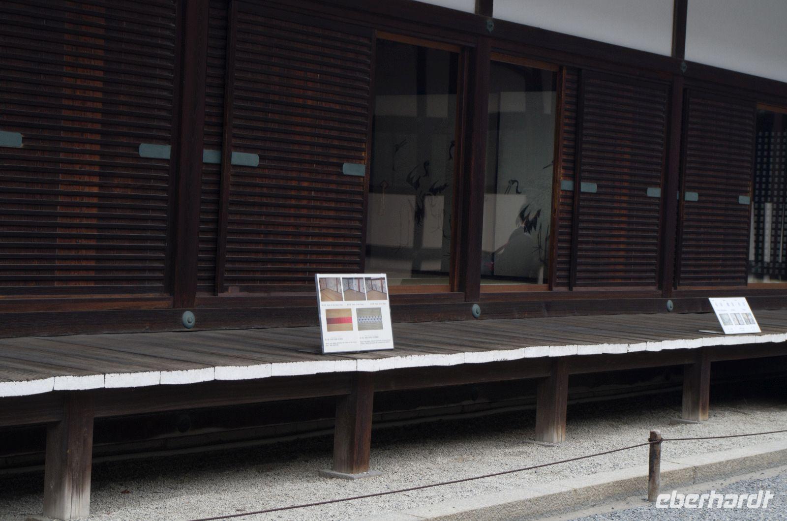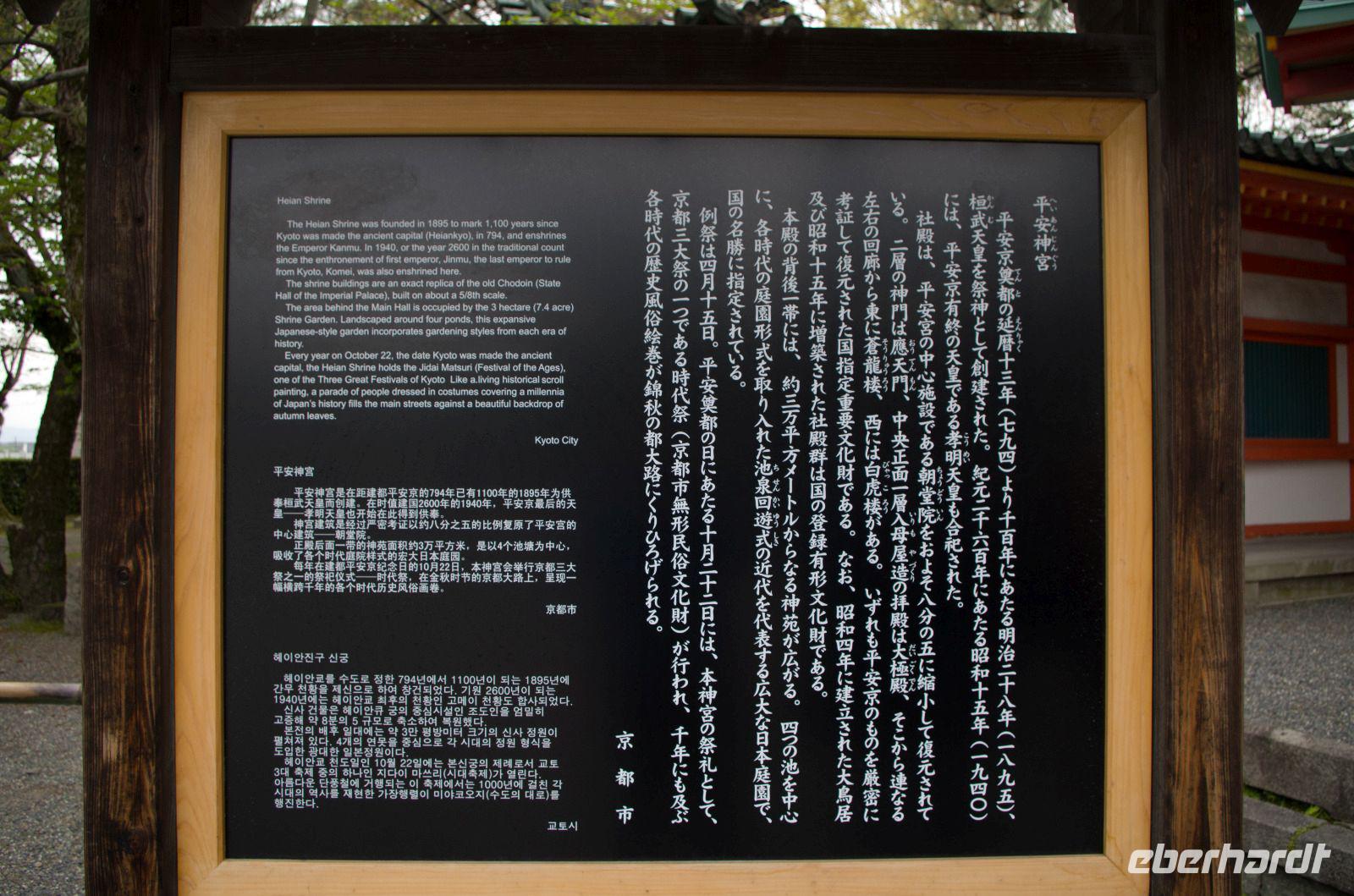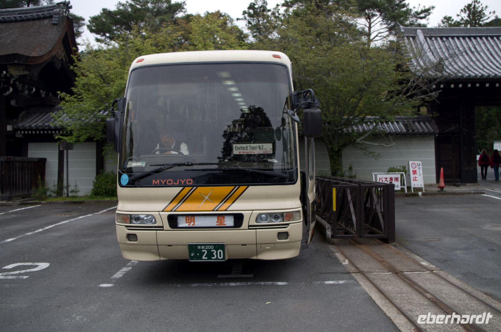 Ein sonniger Tag beginnt und ab 06.45 Uhr treffen sich die Gäste zum leckeren Frühstücksbuffet. Wir lernen heute wieder Japanisch. "Kirei" bedeutet übersetzt "schön" oder "hübsch". Zur gewohnten Uhrzeit um 08.00 Uhr beginnt unsere halbtägige Stadtrundfahrt in Kyoto. Bis 13.00 Uhr steht uns der Reisebus zur Verfügung, das Nachmittagsprogramm erfolgt mit öffentlichen Verkehrsmitteln und zu Fuß. Kyoto ist die ehemalige Kaiser- und Hauptstadt Japans von 794 bis 1868, welche seit 1994 zum UNESCO-Weltkulturerbe gehört. Am Vormittag besuchen wir zuerst um 08.30 Uhr den für seinen traditionellen Garten berühmten Tempel Nanzen-ji und spazieren anschließend kurz den Philosophenweg entlang. Der Philosophenweg "Tetsugaku no Michi" ist ein auf den Philosophen Kitaro Nishida zurückzuführender zwei Kilometer langer Weg im Stadtbezirk Sakyo-ku. Der Philosoph soll diesen Weg regelmäßig zum Meditieren genommen haben. Nächster Programmpunkt ist um 09.50 Uhr die Besichtigung des Schreins "Heian-jingu", eine Nachbildung im 2/3-Maßstab des Kaiserpalastes "Heian-kyo". Rund eine halbe Stunde später fahren wir zum ehemaligen Kaiserpalast "Kyoto Imperial Palace". Wir schauen uns die unterschiedlichen Gebäude an und erfahren spannende Hintergrundinformationen von Chisako. Interessant ist sicher, dass ein japanischer Kaiser immer die drei göttliche Dinge Schwert, Juwel und Spiegel besitzen muss. Das Schwert symbolisiert Kraft, der Juwel den göttlichen Geist und der Spiegel die Weisheit des Geistes. Die Besichtigung des Kaiserpalastes steht nicht in unserem Programm, sie ist eine Empfehlung unser Reiseleiterin. Danke Chisako für die wirklich tolle Idee! Um 12.00 Uhr besuchen wir den Tempel Ryona-ji mit dem berühmten Zen-Garten. Nun heißt es wieder Schuhe ausziehen und Tempelsocken anziehen. Danach werden wir zum als Goldenen Pavillon bekannten Tempel Kinkaku-ji gefahren. Hier verabschieden wir uns vom Busfahrer, unser weiteres Tagesprogramm erfolgt zu Fuß und mit öffentlichen Verkehrsmitteln. Gegen 13.15 Uhr bestaunen wir dieses goldene Heiligtum. Während sich hier wirklich viele Touristen versammeln, haben wir bei allen anderen Besichtigungspunkten immer Glück gehabt, die Sehenswürdigkeiten in Ruhe zu betrachten. In der näheren Umgebung befinden sich Souvenirläden und kleine Restaurants. Zum Mittag gönnen wir uns unter anderem eine leckere Nudelsuppe. Uns stehen verschiedene Nudelsorten zur Auswahl. Zum Beispiel sind "Somen" dünne Fadennudeln aus Weizen, "Udon" sehr dicke, weiße Weizennudeln oder "Soba" dünne Buchweizennudeln. Um 14.45 Uhr finden wir uns auf dem Parkplatz zusammen und laufen zur Bushaltestelle. Gegen 15.00 Uhr fahren wir mit dem öffentlichen Bus von Kinkakuji-Michi zum Kamihatecho Kyoto Zoukeigeidai-mae Bus Stopp, welchen wir rund 30 Minuten später erreichen. Um 16.30 Uhr schauen und hören wir uns eine interessante Theaterveranstaltung der Maikos und Geikos "Miyako Odori" im Kyoto Art Theater "Shunjuza" an. Die Vorführung stimmungsvoller traditioneller Kirschblüten-Tänze dauert rund eine Stunde. Fotografieren und Filmen sind nicht erlaubt. Auch wenn die Musik sehr melodramatisch und eher gewöhnungsbedürftig ist, sind die Gäste besonders von Bühnenbild und Kostümen begeistert. Um 17.30 Uhr fahren wir mit dem öffentlichen Bus von Kamihatecho Kyoto Zoukeigeidai-mae zum Shijo-Karawamachi Bus Stopp, welchen wir gegen 18.10 Uhr erreichen. Wir laufen gemeinsam zum Restaurant, wo uns heute ein leckeres Kyoto-Cuisine-Buffet-Abendessen geboten wird. Neben allerhand kalten und warmen Speisen ist besonders der leckere Kuchen zum Nachtisch zu empfehlen. Nach dem Essen spazieren wir zur Kyoto Station und fahren um 20.04 Uhr rund 16 Minuten mit der Metro Karasuma Line von Shijo zur Kokusaikaikan Station. Wieder ein gelungener, aber auch langer Tag neigt sich dem Ende. Wir wünschen eine gute Nacht und ziehen uns auf die Zimmer zurück. Heute sind wir rund 19 Kilometer im Reisebus unterwegs gewesen sowie haben wir am gesamten Tag 13,0 Kilometer und 18.869 Schritte zu Fuß zurückgelegt.