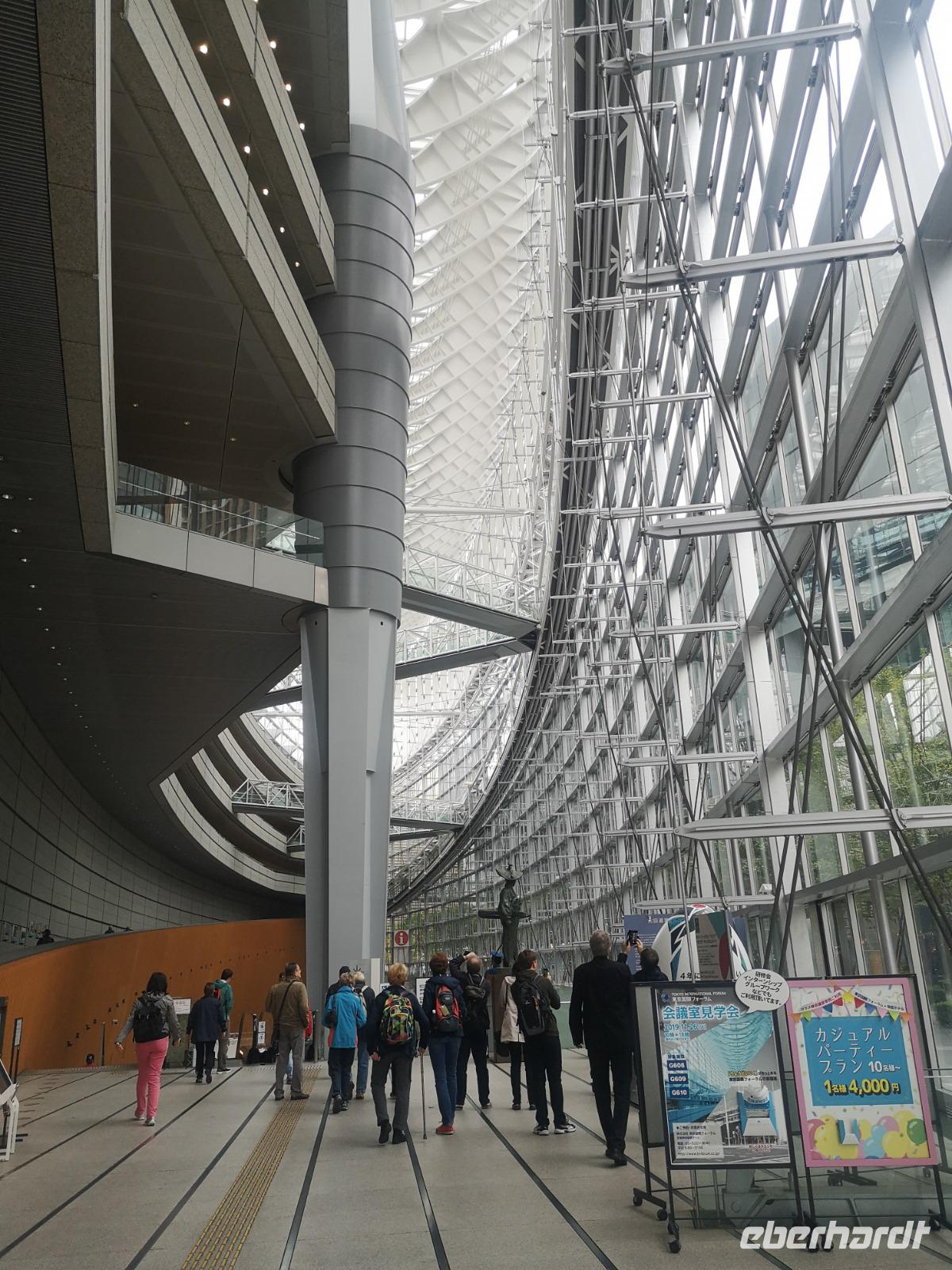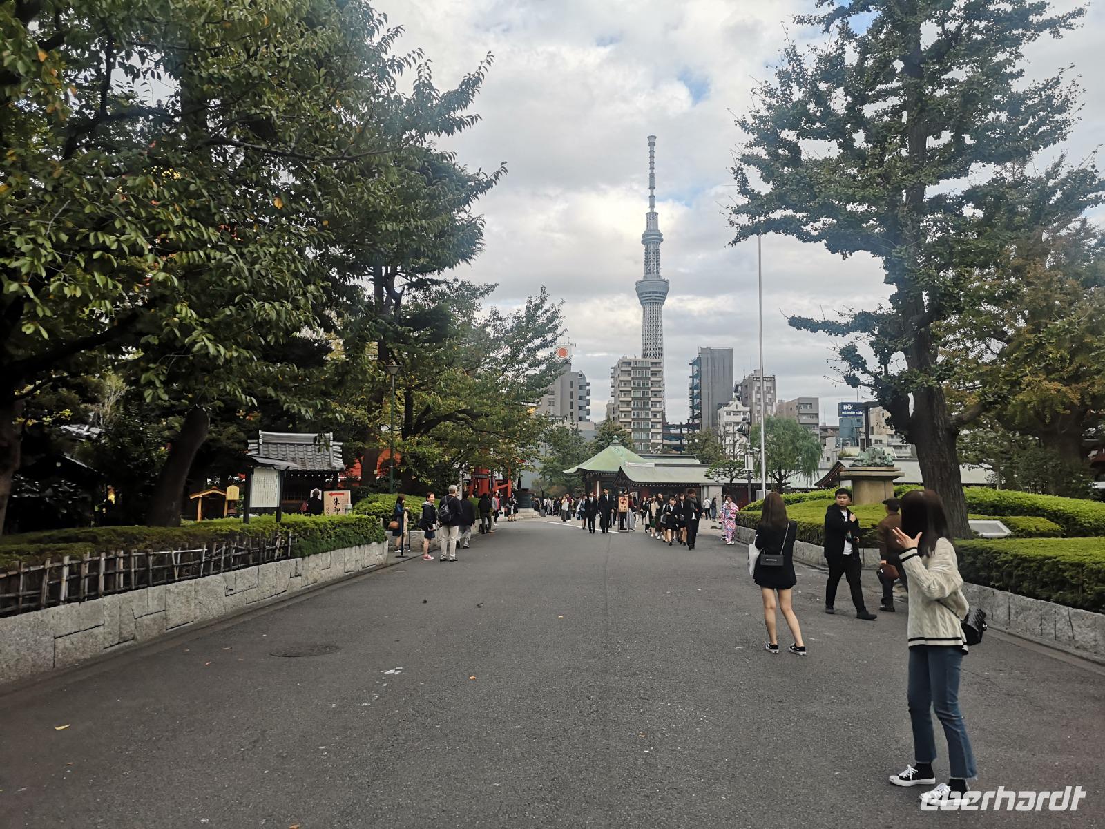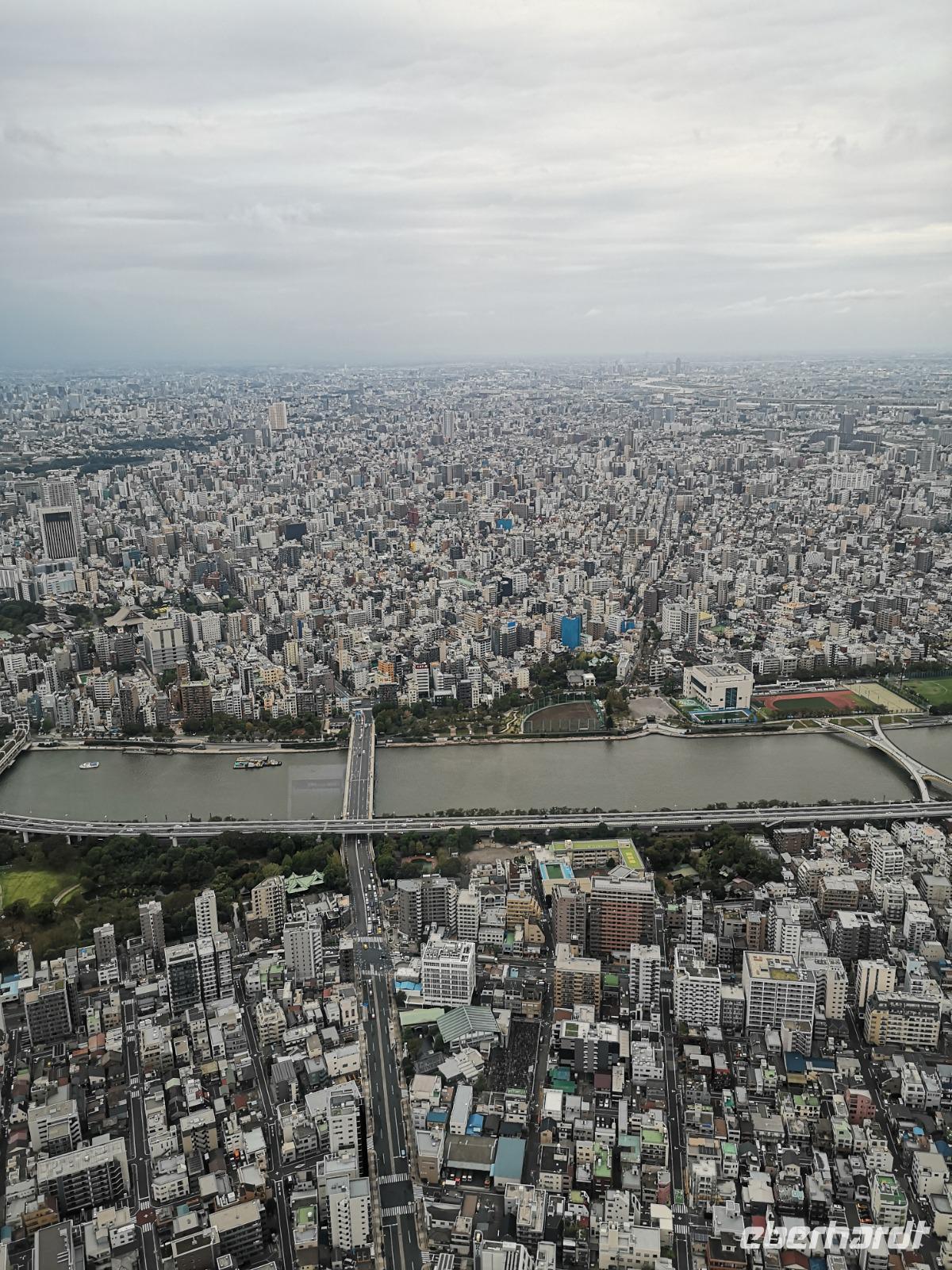 Von München und Frankfurt fliegen wir gemeinsan gen Osten und erreichen nach etwa 11 Stunden Flug den Flughafen Tokyo Haneda, wo sich unsere Reisegruppe versammelt und wir auf unsere Reiseleiterin Isa Treffen. Gemeinsam steigen wir in den Bus, der uns in kurzer Zeit in den Stadtteil Asakusa und zu unserem Hotel in Tokyo bringt. Vom Taifun Hagibi ist in der Tokyoer Innenstadt nichts mehr zu erkennen als wir am frühen Nachmittag unser Hotel erreichen. Wir cheken in unsere Zimmer ein und treffen uns bereits kurz danach vor unserem Hotel um uns einen ersten Überblick über Tokyo von oben zu verschaffen. Mit der U-Bahn fahren wir eine Station von Asakusa zum Sky Tree und mit dem Fahrstuhl geht es zur ersten Aussichtsplatform auf 350 Metern Höhe. Das Wetter ist ein wenig trüb, aber wir können dennoch die Außmaße von Japans Hauptstadt bewundern. Isa erklärt uns, dass auf den ca. 2.200 km2 der Präfektur Tokyo fast 14 Millionen Menschen leben und es fällt nicht schwer sich dies beim Anblick des Häusermeeres vorzustellen.