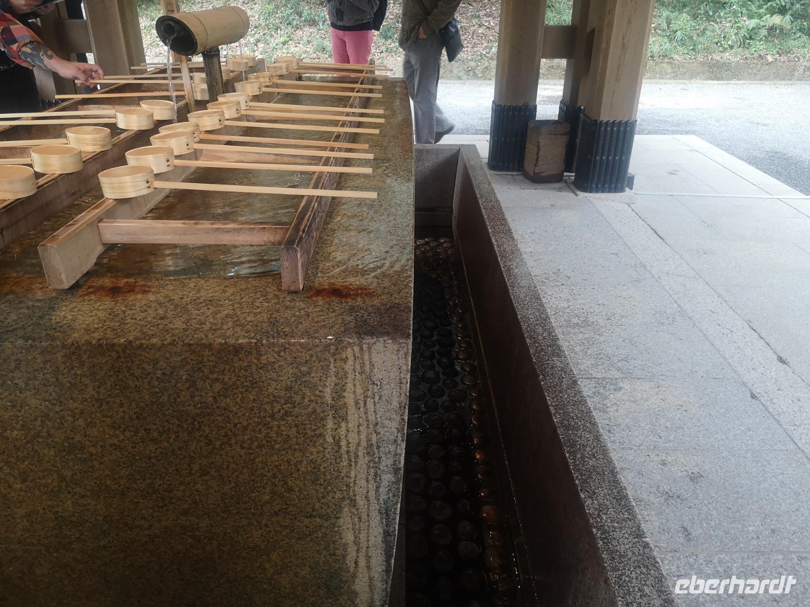 Nach einer ersten Nacht in Tokyo starten wir am Morgen mit dem Bus zum Meji Schrein, der dem Kaiser Meji gewidmet ist, dem Gott dieses Schreines, gewidmet ist. Vorbei am großen Torii führt uns Isa auf das Schrein-Gelände und zum Temizuya, einem kleinen Pavillion indem uns Isa die rituelle Waschzeremonie vorführt, die man vor Betreten des Schreines absolviert. Isa erklärt uns mehr über den Shintoismus und den Status der Religion in Japan. Vorbei an Gebetstafeln erreichen wir die Haupthalle und lernen, wie die Shintoisten zu Ihren Göttern beten.