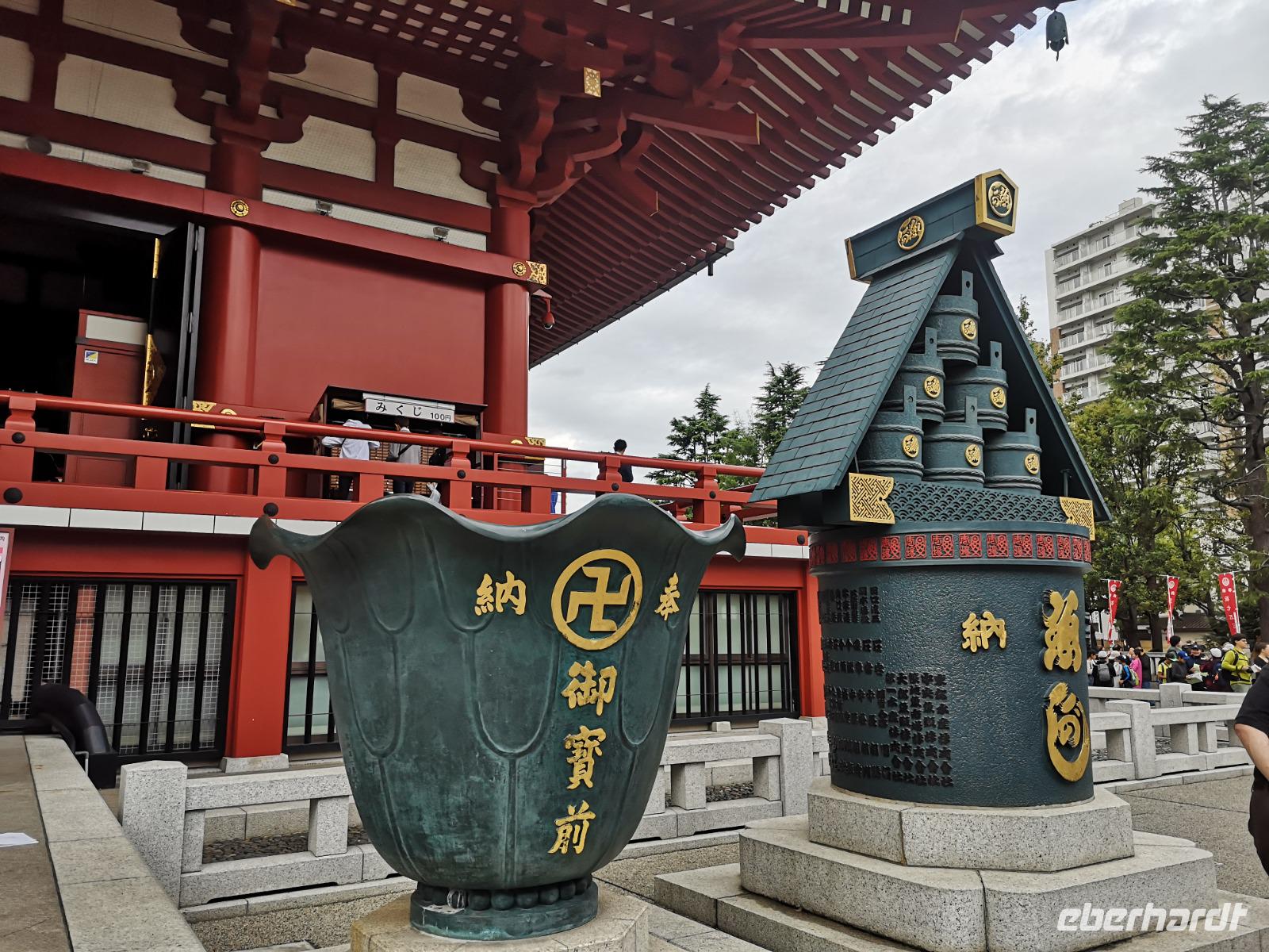 Unweit unseres Hotels befindet sich der Senso-ji Tempel, dessen beeindrucktendes Donnertor den Weg zu einer kleinen Einkaufsstraße bewacht. Wir legen hier unsere Mittagspause ein, nutzen die Zeit um erste Souviniere zu besorgen oder ein japanisches Mittagessen zu genießen. Schließlich treffen wir uns erneut am Tempeleingang und lassen uns von Isa mehr über den Budhismus, Japans zweitgrößter Religion, erklären.