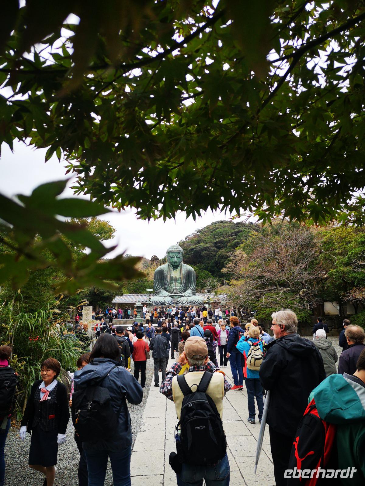 Wir laufen vom Hasedara-Tempel weiter durch Kamakura zum Großen Buddha. Die fast 12 Meter hohe Statue wurde einst innerhalb der Haupthalle des Kotokuin Tempels beherbergt, nachdem diese aber durch Stürme und Tsunami mehrfach zerstört wurde, hat man sich Ende des 15. Jahrhunderts entschieden, den Buddha im Freien stehen zu lassen und die Halle nicht erneut zu errichten. Dennoch bietet die Statue bis heute ein beeindruckendes Bild und ein einzigartiges Fotomotiv, dass auf keiner Japanreise fehlen darf!