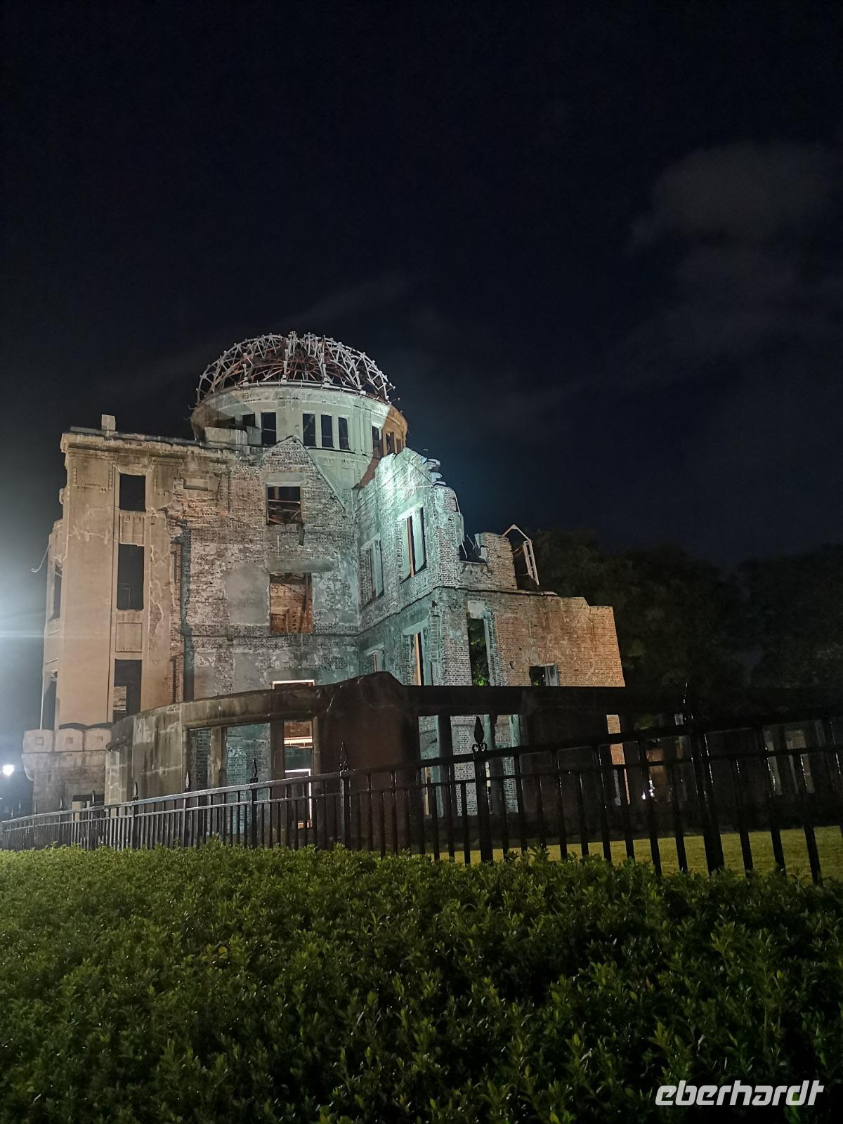Nachdem Abendessen machen wir einen Abstecher zum Friedenspark von Hiroshima um den beleuchteten Atombombendom zu besuchen. Die abendliche Stille sorgt für eine fast unheimliche Athmosphäre und macht deutlich, dass diese alte Ruine nicht nur Zeitzeuge, sondern auch Mahnmal ist.