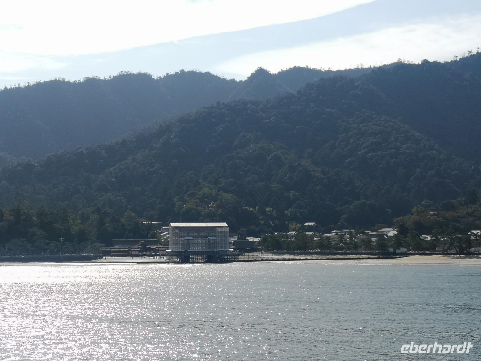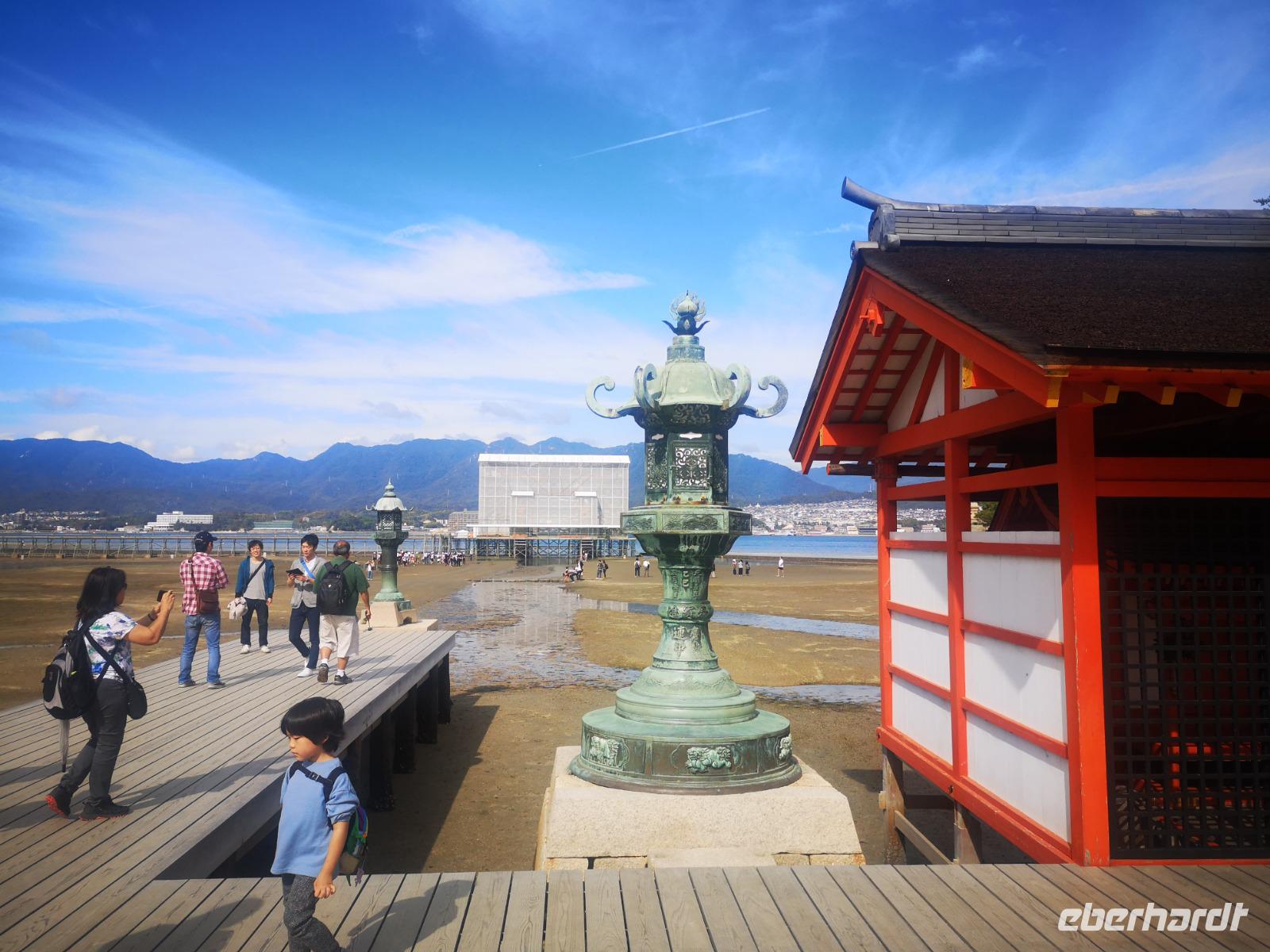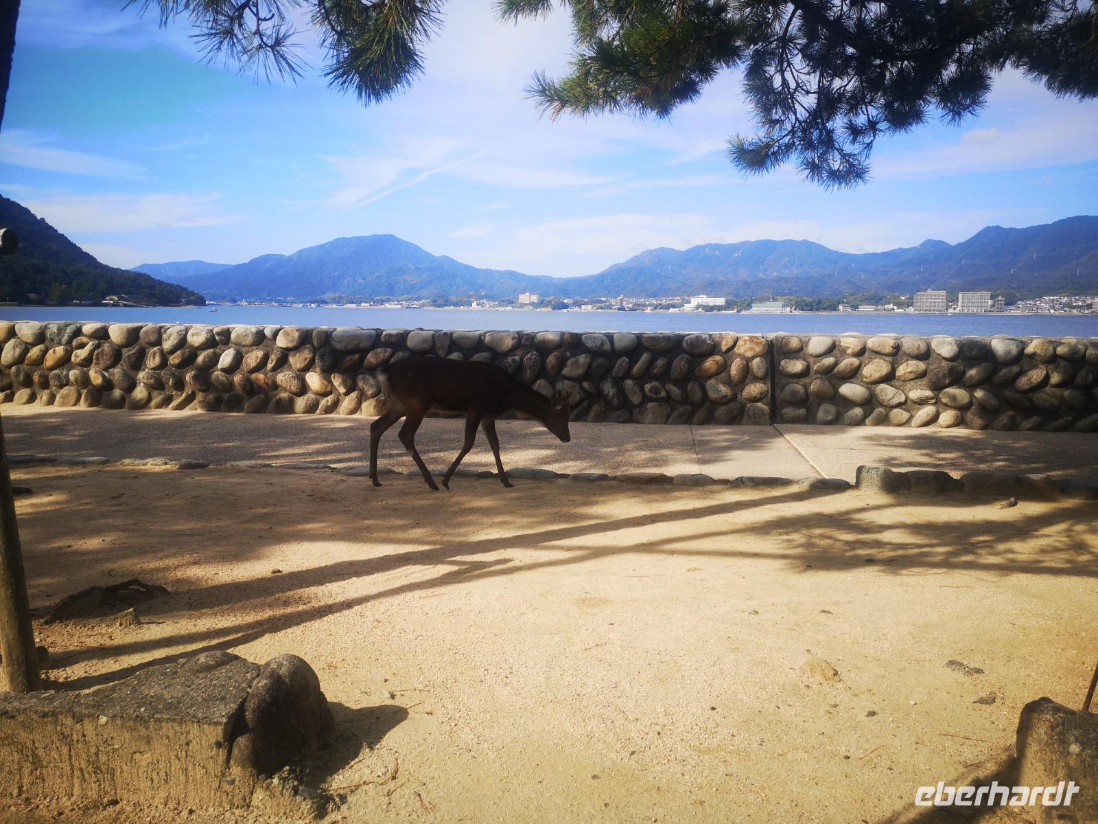 Mit Zug und Fähre gelangen wir an diesem Morgen auf die Insel Miyajima. Das berühmte rote Torii, welches hier im Wasser vor den Ufern der Insel steht, wird während unseres Besuches gerade restauriert und so können wir nur durch die Fassade die Silhouette des Torii erraten. Wir besuchen den Itsukushima-Schrein, zu dem dieses Tor gehört und können dennoch einige schöne Blicke auf die Insel und die restlichen Gebäude der Schreinanlage erhaschen. Unsere ständigen Begleiter sind die zahmen Rehe, die auf dieser Insel leben und von jeglichen Knabbereien angezogen werden. Nach unserer Schreinbesichtigung bummeln wir eigenständig zum Fährterminal zurück und erwerben ein paar gegrillte Austern oder einen der bunten Reislöffel, für die die Insel bekannt ist.