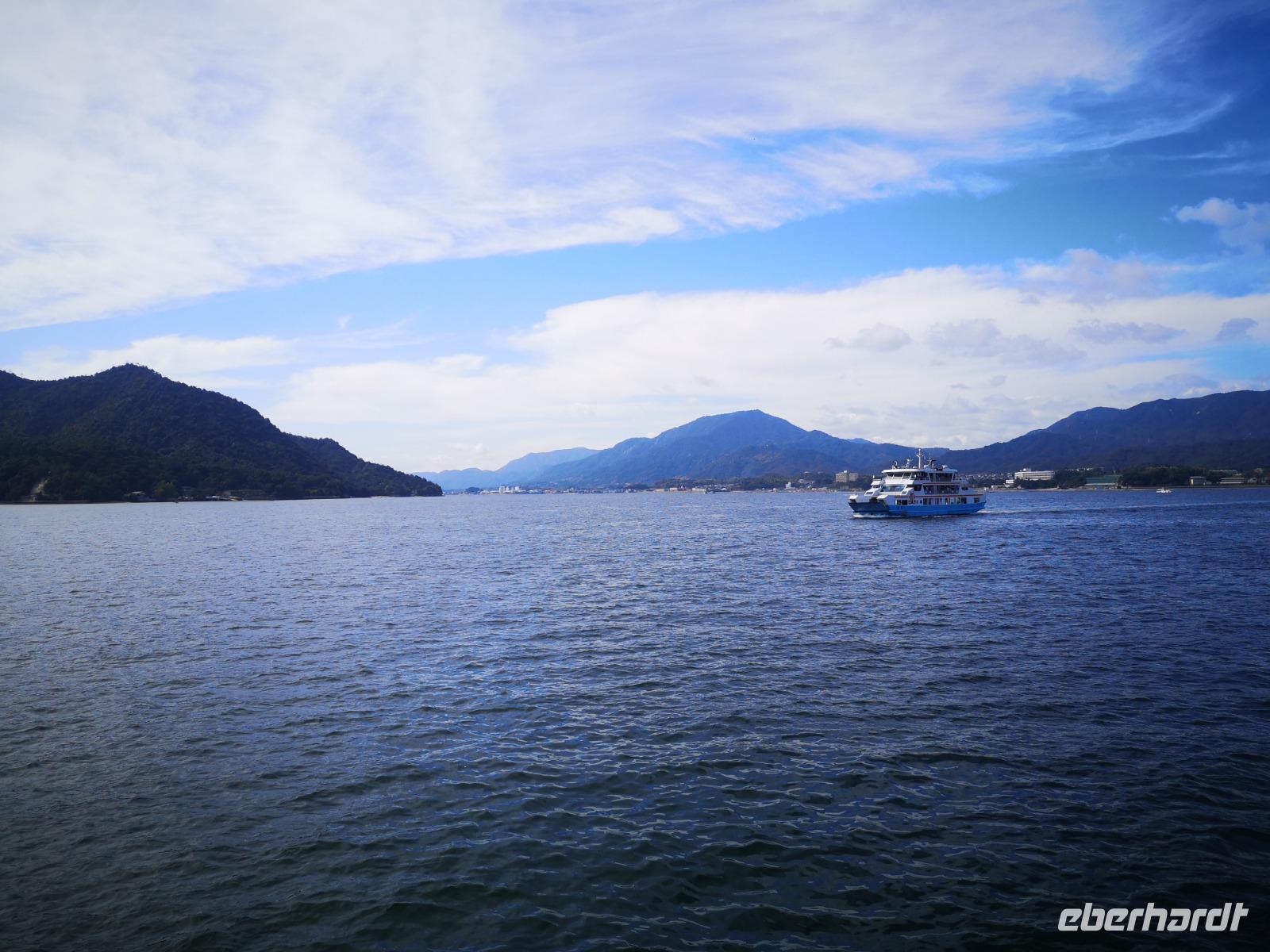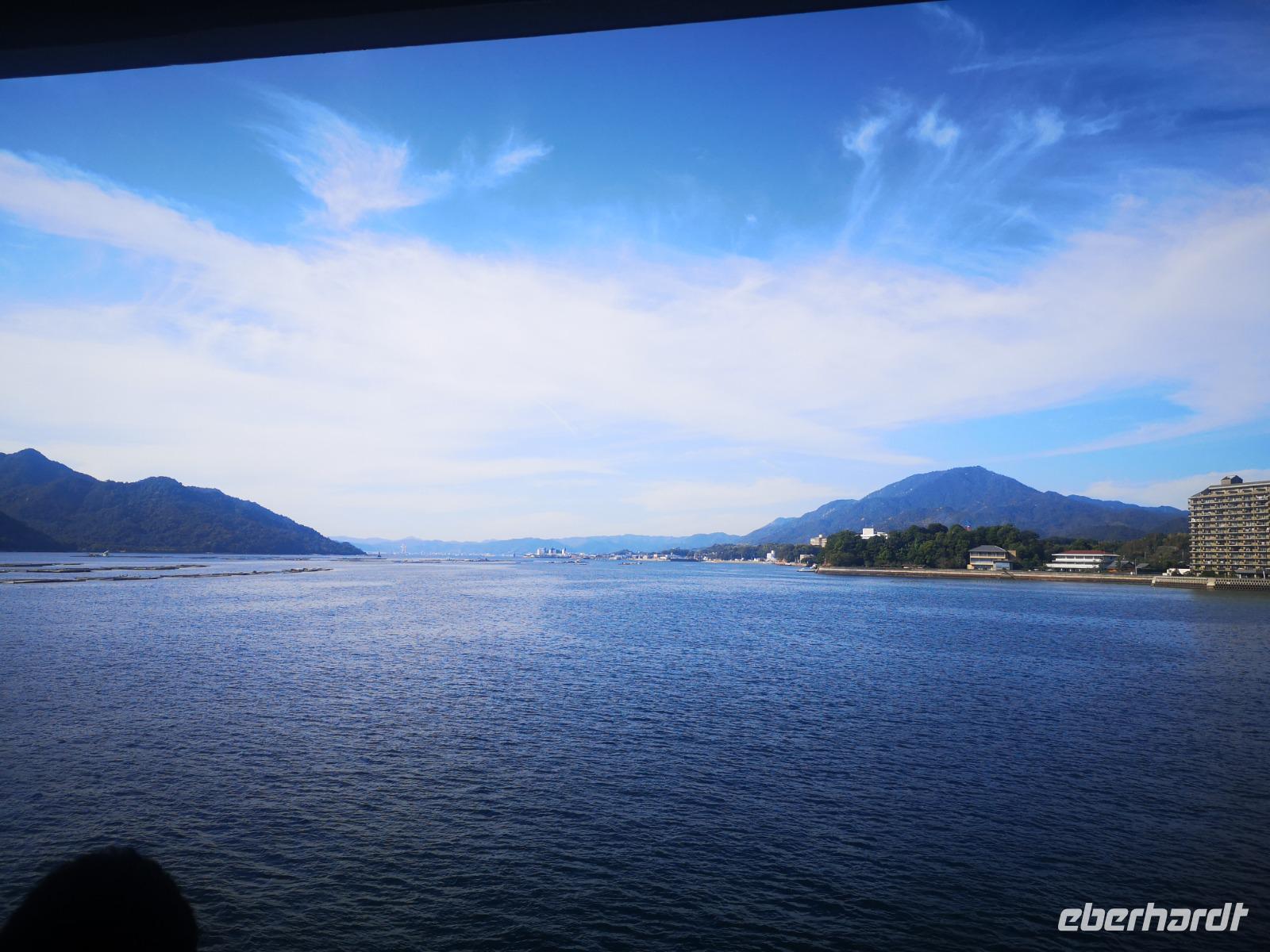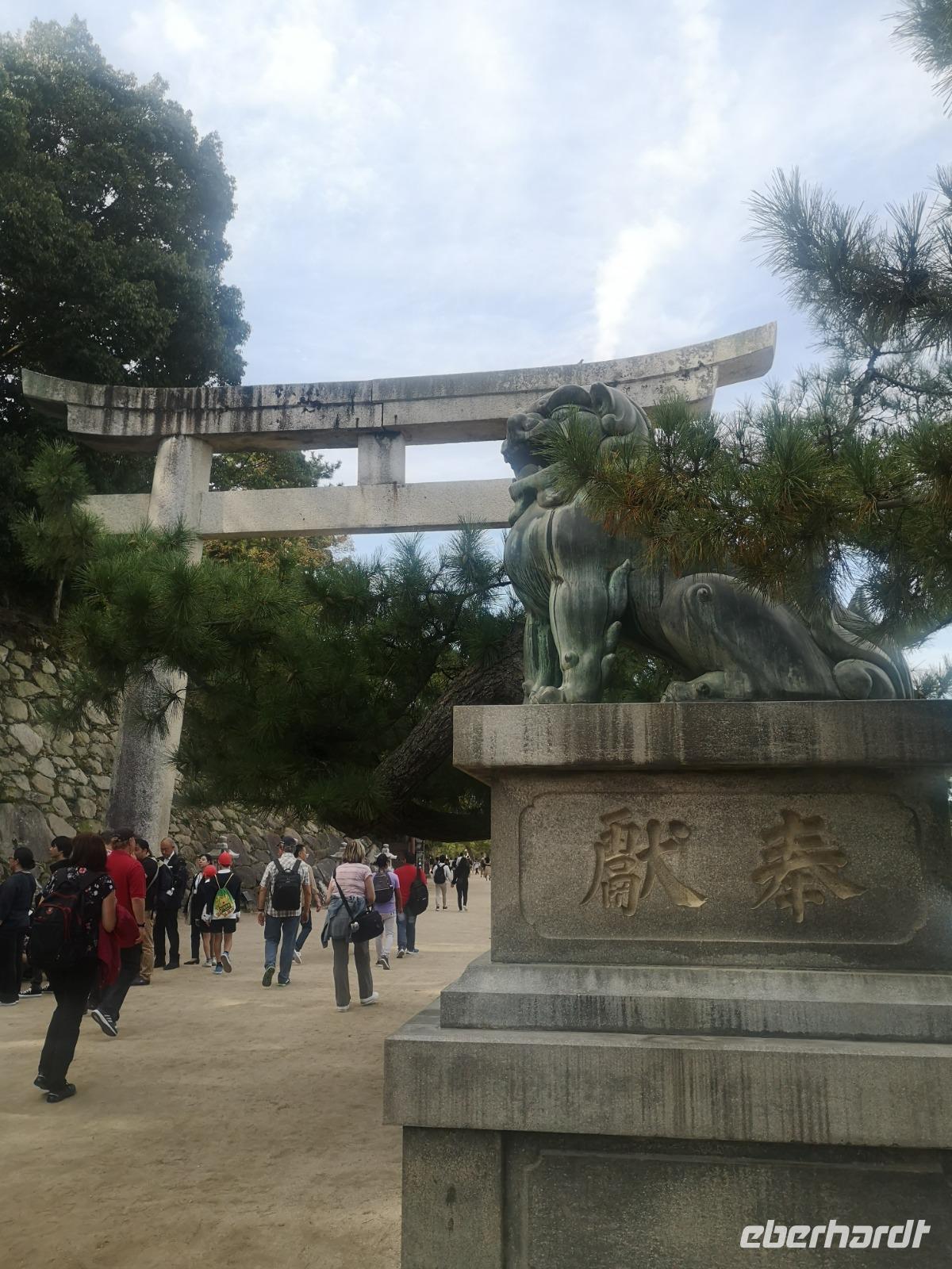 Mit Zug und Fähre gelangen wir an diesem Morgen auf die Insel Miyajima. Das berühmte rote Torii, welches hier im Wasser vor den Ufern der Insel steht, wird während unseres Besuches gerade restauriert und so können wir nur durch die Fassade die Silhouette des Torii erraten. Wir besuchen den Itsukushima-Schrein, zu dem dieses Tor gehört und können dennoch einige schöne Blicke auf die Insel und die restlichen Gebäude der Schreinanlage erhaschen. Unsere ständigen Begleiter sind die zahmen Rehe, die auf dieser Insel leben und von jeglichen Knabbereien angezogen werden. Nach unserer Schreinbesichtigung bummeln wir eigenständig zum Fährterminal zurück und erwerben ein paar gegrillte Austern oder einen der bunten Reislöffel, für die die Insel bekannt ist.