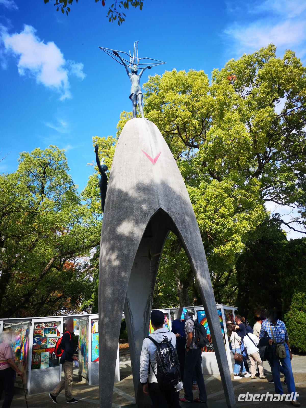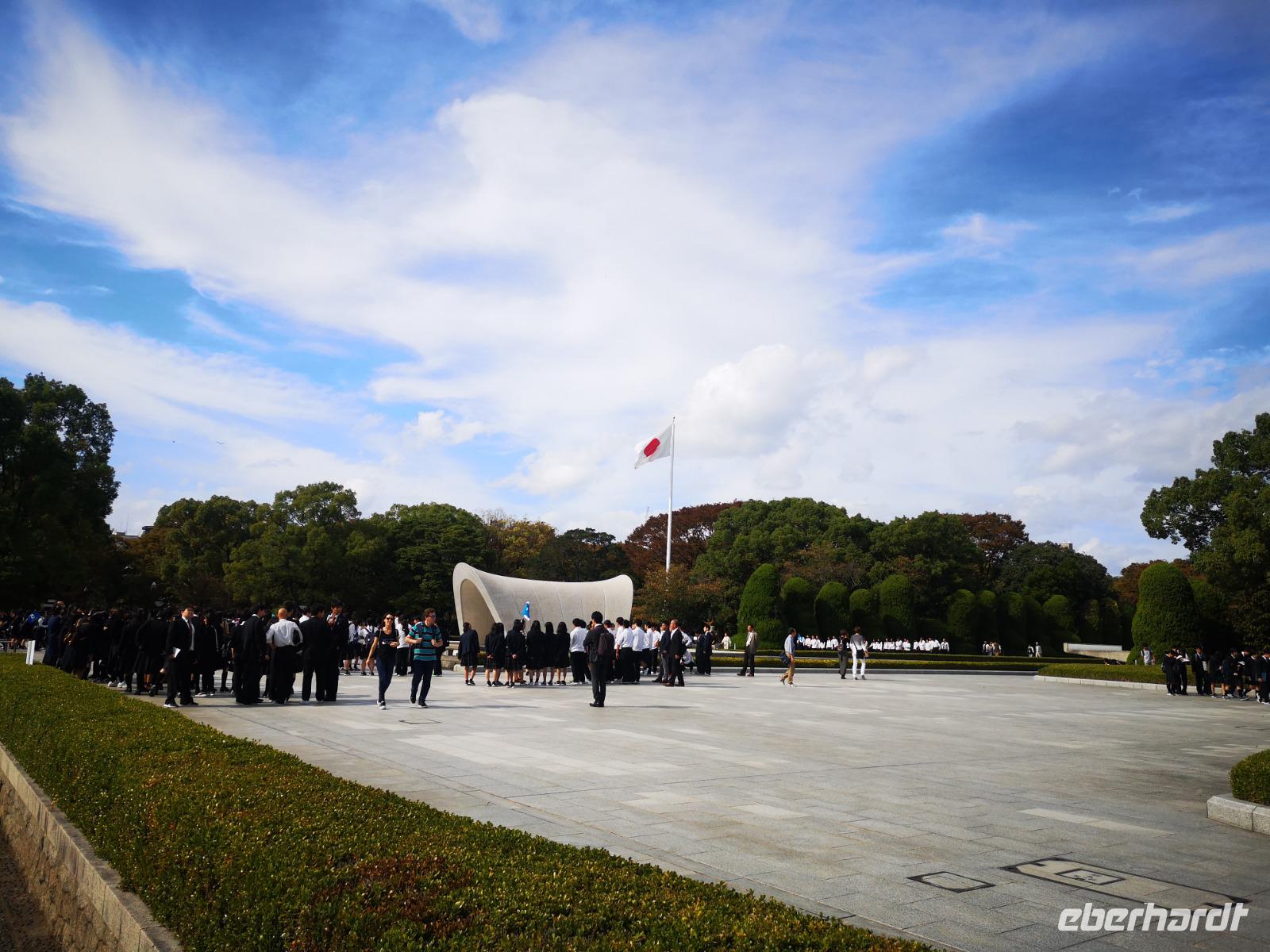 Mit der Fähre und der Straßenbahn geht es zurück nach Hiroshima und zum Friedenspark. Unser Rundgang beginnt am Atombomdendom, der nun im Licht des Tages ein ganz anderes Bild bietet als am gestrigen Abend. Unsere Reiseleiterin Isa führt uns in der Geschichte zurück, gibt uns einige Einblicke die nicht in jedem Geschichtsbuch zu finden sind. Einige von uns läuten die Friendensglocke, dessen Echo auch während unser weiteren Besichtigungen immerwieder durch den Park schallt. Wir passieren das Denkmal von Sadaka Sasaki, einem jungen Mädchen, dass im Alter von 12 Jahren den Langzeitfolgen der Strahlung erlag. Vor Ihrem Tot soll Sie versucht haben, 1000 Kraniche zu falten um so ihr Überleben zu sichern - leider blieb sie erfolglos. Bis heute legen Schulklassen und Besucher aus aller Welt Kraniche an Ihrem Denkmal nieder - als Zeichen für den Frieden und gegen Atomwaffen. Auch wir legen unsere Kraniche ab, bevor wir vorbei am Friedensdenk,al und der ewigen Flamme das Friedensmuseum erreichen. Die Ausstellung zeigt die Auswirkungen der Atombombe, die am 06. August 1945 auf Hiroshima fiel in Filmen, Fotos und zahlreichen Ausstellungsstücken. Im Museum ist es ruhig, die Besucher, Touristen und Schüler schweigen während um sie diese schreckliche Katastrophe förmlich auflebt.