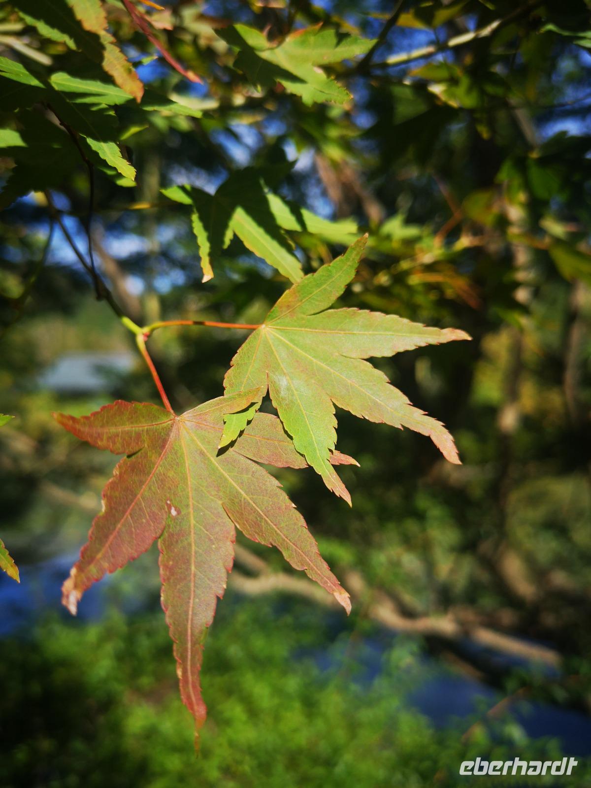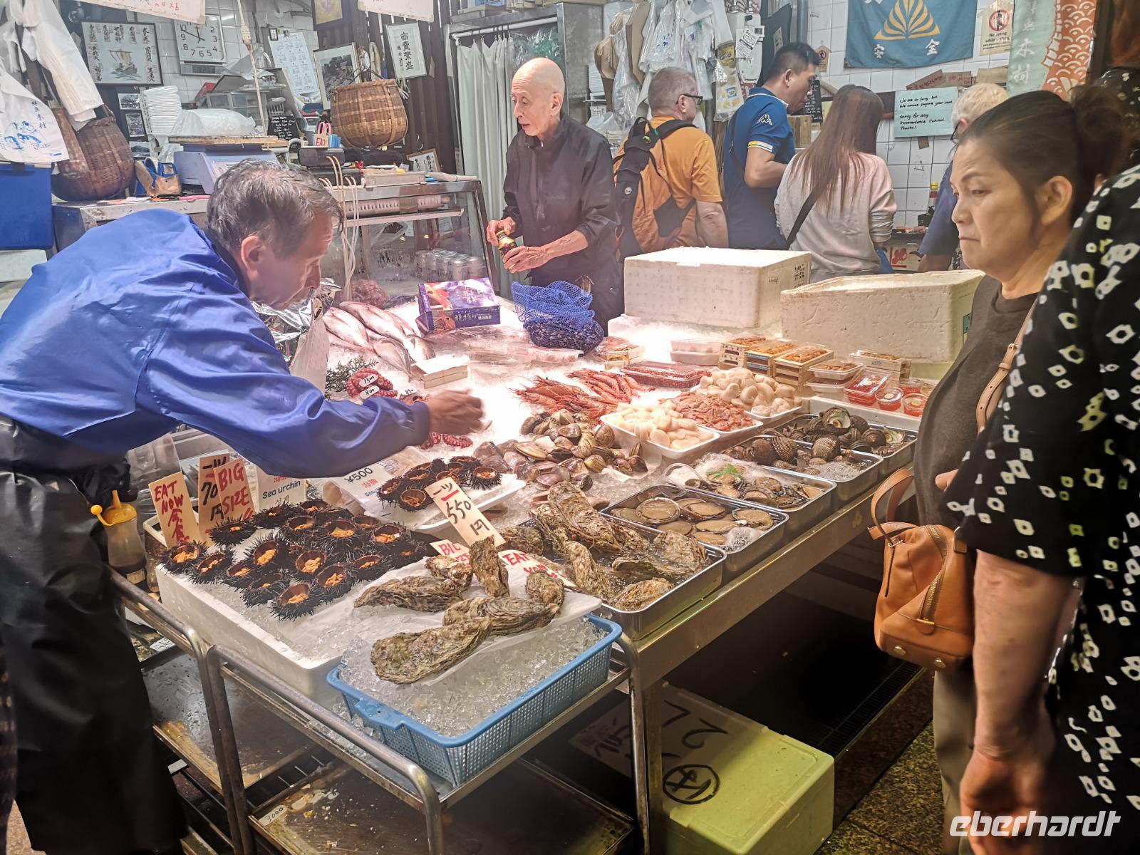 Von hier aus geht es weiter zum Kinkakuji-Tempel, der für seinen goldenen Pavillion bekannt ist. Leider sind wir nun bei weitem nichtmehr allein und müssen uns mit den Massen durch die Anlage drängeln, um das perfekte Foto des goldenen Pavillions zu erhaschen! Bevor es weiter in Richtung Heian-Schrein geht legen wir einen Stopp am Nishiki Markt ein - dieser wird bis heute auch von Einheimischen zum Einkaufen besucht. In der überdachten Passage reihen sich Obst- und Gemüsestände and Tofu-Geschäfte, Fischhändler und Sake-Verkäufer. Wir nutzen die Chance, das ein odere andere Streetfood zu probieren, wie Seeigel-Kaviar und Gyoza, bevor uns unser Bus schließlich zum Heian-Schrein bringt. Dieser ist eine Nachbildung des Kaiserpalastes aus der Heian Zeit, in der Kyoto die Hauptstadt Japans war. Besonders das große rote Torii und die rote Schrein-Halle beeindrucken am heutigen Tag. Wir entschließen uns, auch durch den Garten des Schreines zu spazieren, in dem bereits die ersten Bäume in rot und gelb erstrahlen. Da uns an diesem Nachmittag noch etwas Zeit bleibt führt uns Isa noch zu einem weiteren Tempel, der nicht auf dem Programm steht, aber für seine herbstliche Laubfärbung bekannt ist. Im Norden Kyotos liegt der Eikando Zenrinji Tempel. Im Inneren darf leider fast gar nicht fotografiert werden, und so bleiben die Fotoaparate in der Tasche als wir durch die Hallen und Gänge spazieren. Von der Pagode bietet sich ein weitreichender Blick über Kyoto und überall können wir bereits rote Ahornbäume entdecken. Ein Priester in elegantem violettem Gewand hält sein Gebet in der Haupthalle und einige von uns verweilen um seinem leisen Gesang zu lauschen.