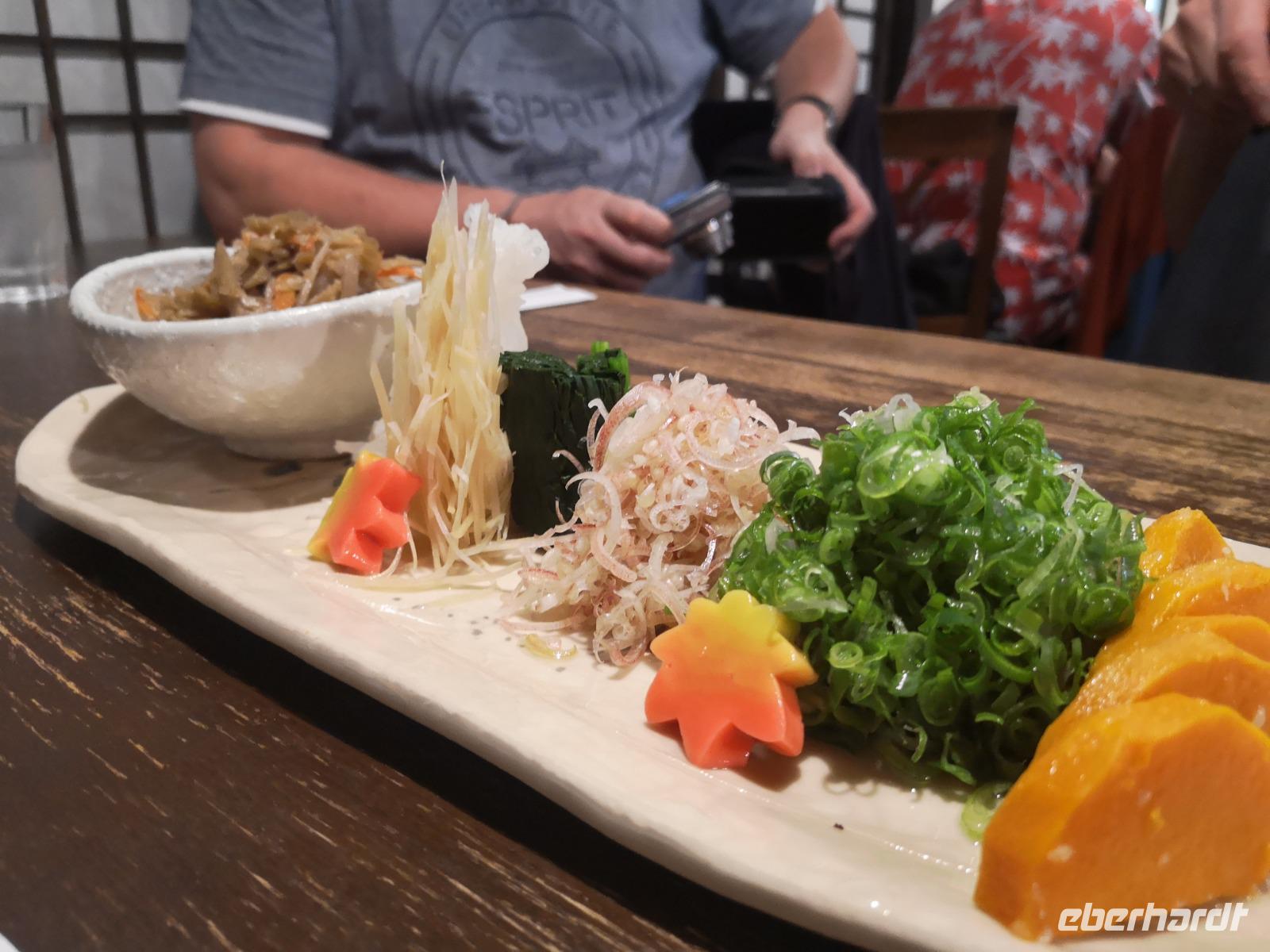 Am Abend fahren wir mit Taxis durch Kyoto um unser Lokal für das Abendessen zu erreichen. Heute stehen Udon-Nudeln auf dem Speiseplan. Die Suppe kann nach Geschmack mit Schalotten und Rettich verfeinert werden, dazu wird uns Tempura gereicht.
