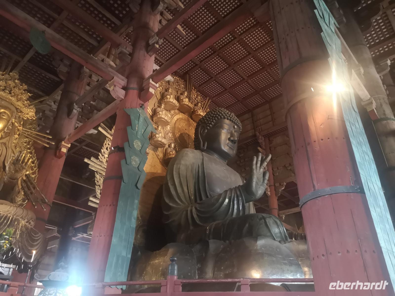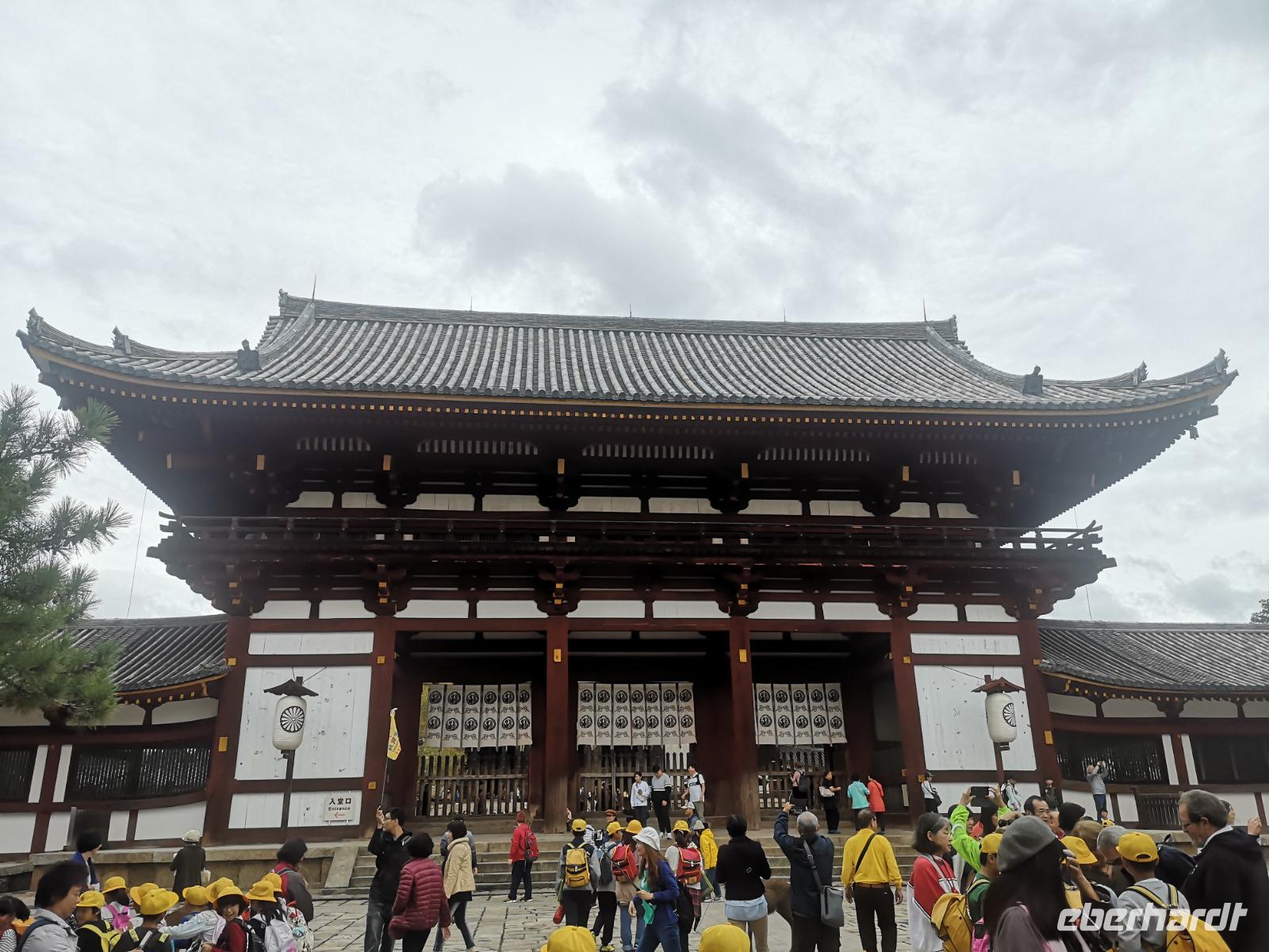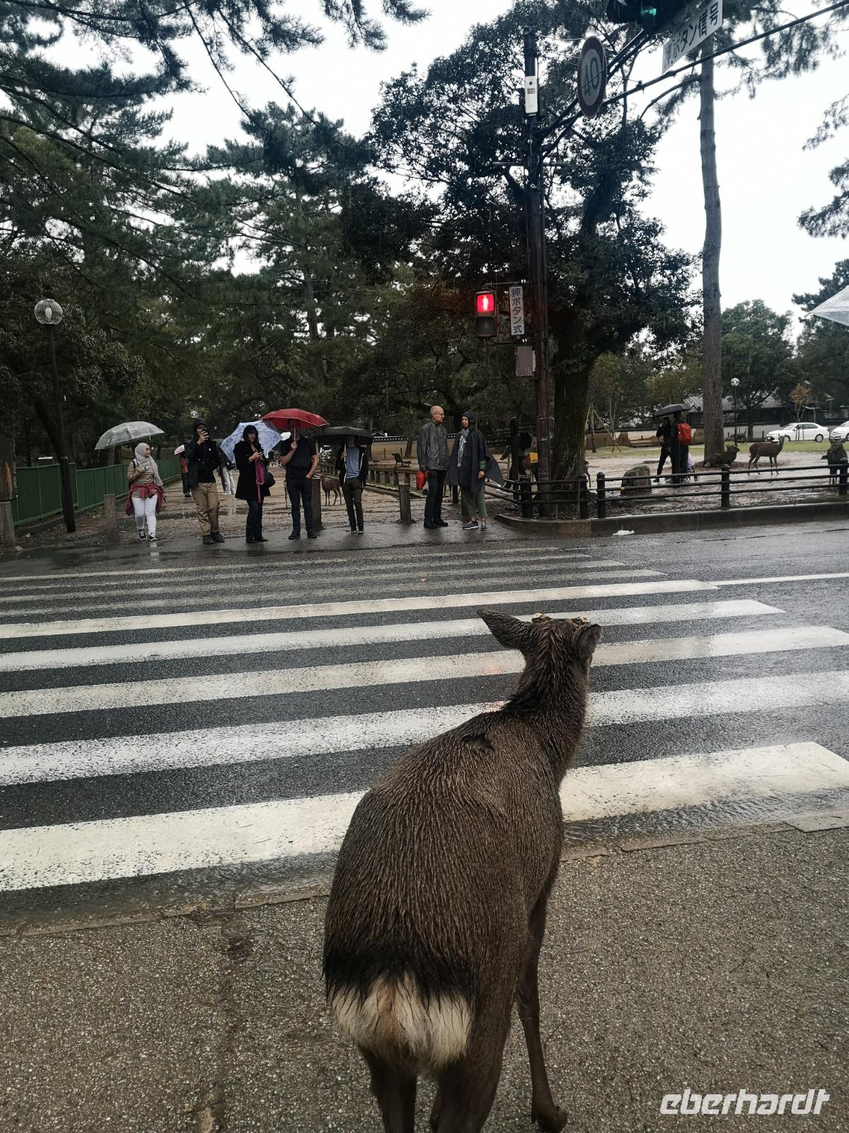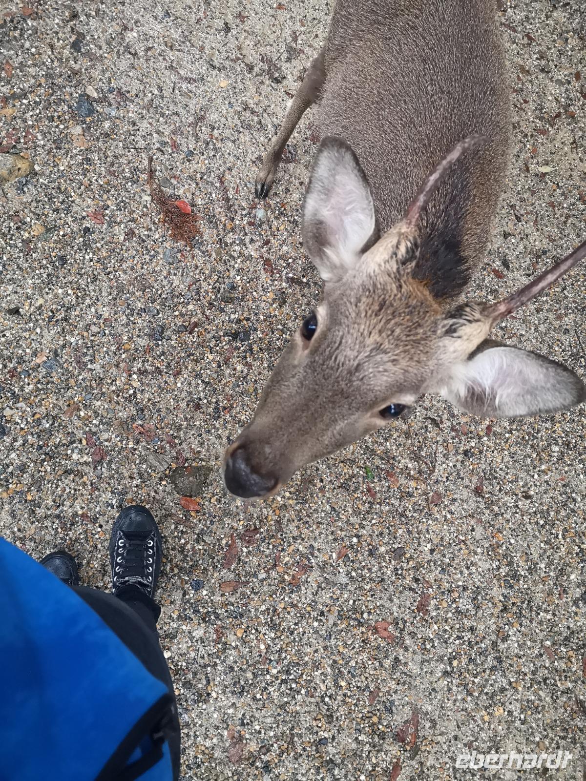 Mit der Bahn geht es für uns heute in die Stadt Nara, die als Wiege der japanischen Kultur angesehen wird. Heutzutage ist Nara allerdings für zwei Dinge bekannt: Seinen Großen Buddha und seine gefräßigen Rehe. Diese begenen uns bereits kurz nach dem Bahnhof - überall werden an Ständen kleine Kekse verkauft, mit denen die Tiere gefüttert werden können. Gleichzeitig warnen Schilder davor, dass es sich dennoch um wilde Tiere handelt, die durchaus schubsen und beißen können, wenn ihnen die Aufmerksamkeit zu viel wird.