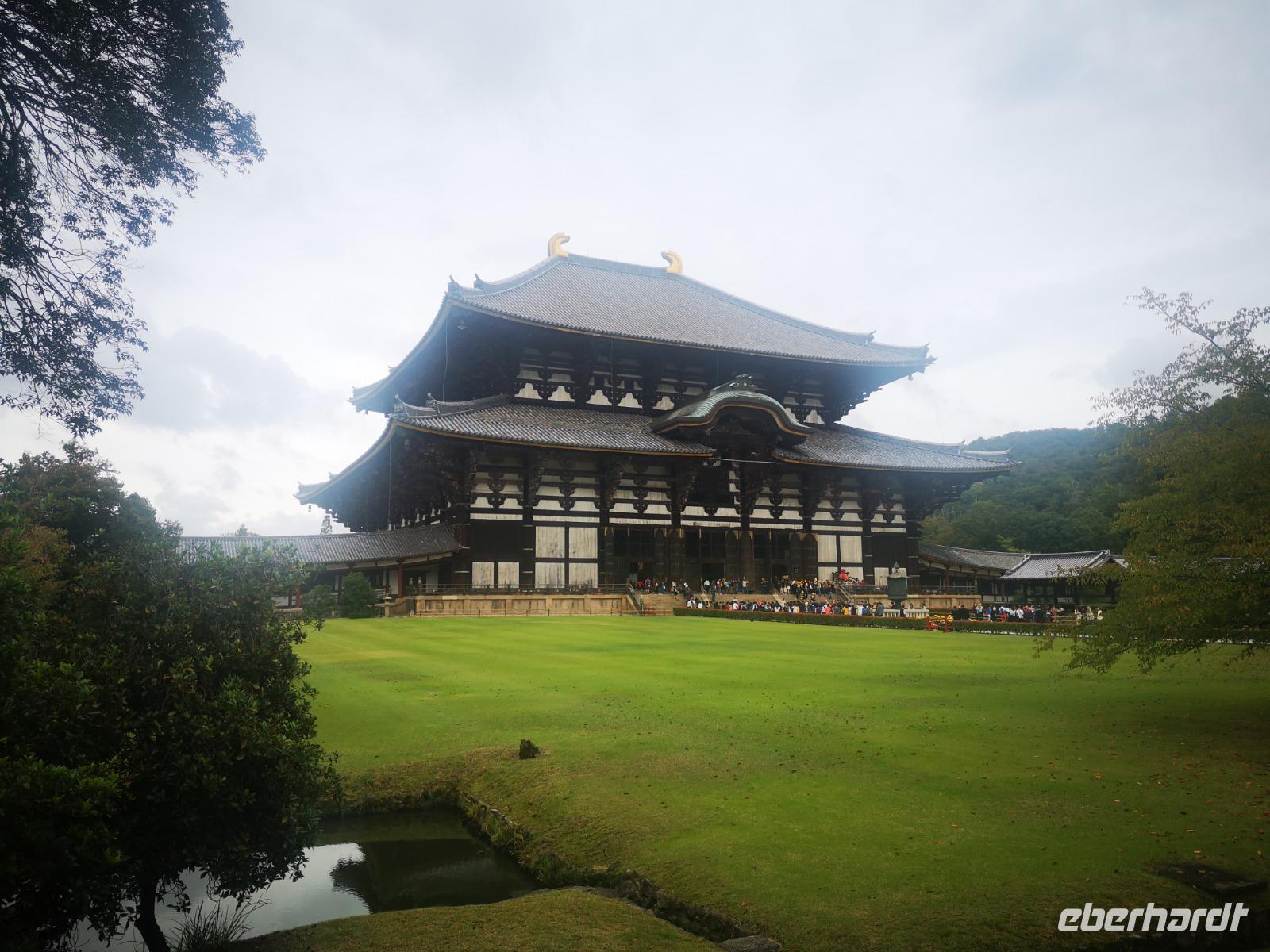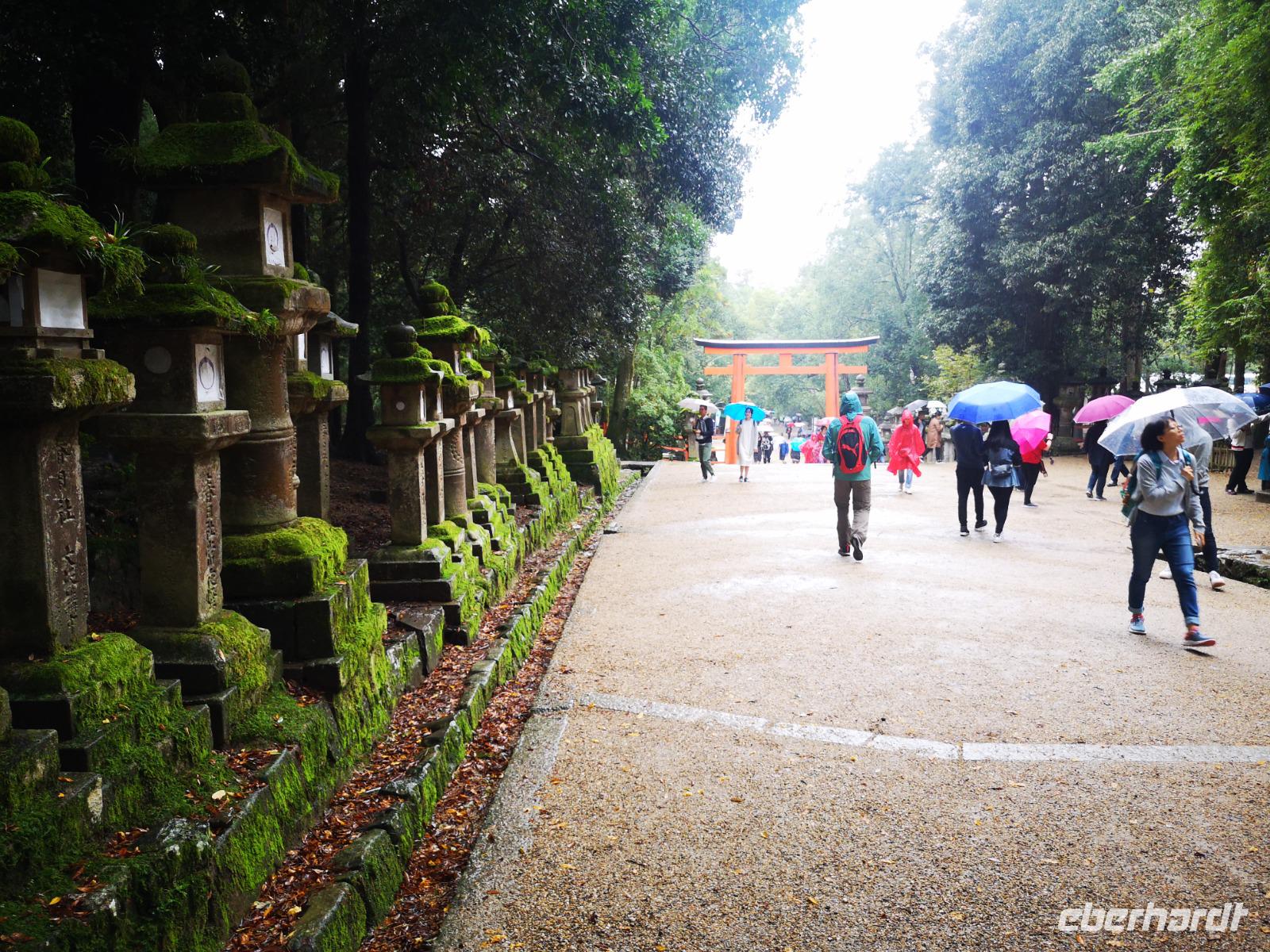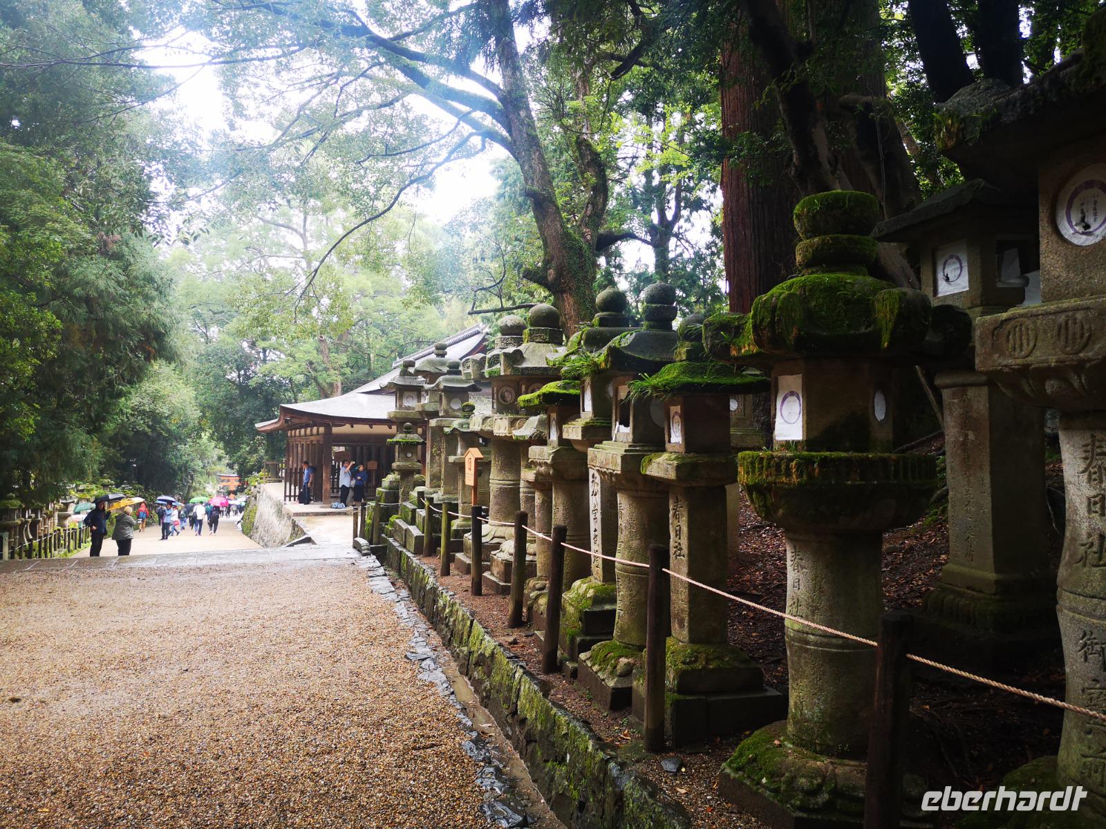 Vorbei an den frechen Rehen, geht es zum Todaji-Tempel in dem die größte Buddhastatue zu Hause ist. Mit 16-Metern Höhe thront sie in einer gewaltigen Tempelhalle und ist sogar noch älter als ihr kleineres Gegenstück in Kamakura. Leider beginnt es mit Regnen, als wir den Tempel verlassen und uns durch den schönen Nara-Park auf den Weg zum Kasuga Taisha Schrein machen. Die bemosten Laternen, die den Weg zum Schrein säumen, wirken bei diesem schlechten Wetter zwar besonders athmosphärisch, aber leider können wir dem Regen nicht viel mehr abgewinnen. Wir begeben uns individuell auf den Weg zurück zum Bahnhof von Nara, kaufen unterwegs die letzten Souviniere und kehren in den kleinen Restaurants für ein schnelles Mittagessen ein.
