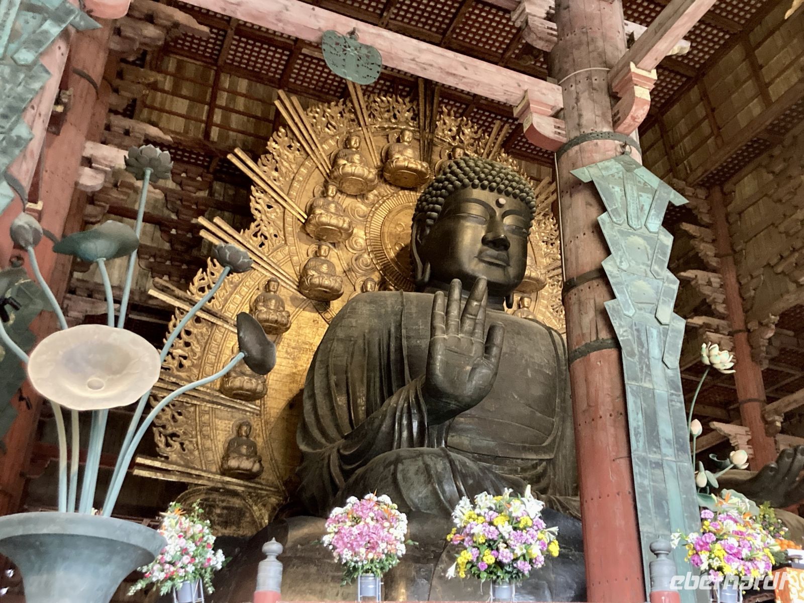 Unseren letzten Tag der Reise verbringen wir in Nara. Mit der U-Bahn machten wir uns auf nach Nara, das circa 1 Stunde von Kyoto entfernt liegt. Die Kleinstadt wird als Wiege der japanischen Kultur bezeichnet und ist Japans erstes UNESCO-Weltkulturerbe. Der Todaiji Tempel, den wir heute auch besichtigen, beherbergt die größte bronzene Buddhastatue der Welt. Mit 16,2 Metern und 452 Tonnen ist diese Statue in dem größten Holzgebäude der Welt untergebracht. Der Todaiji-Tempel mit der beeindruckenden bronzefarbenen Buddhastatue ist wirklich ein faszinierendes architektonisches Meisterwerk.