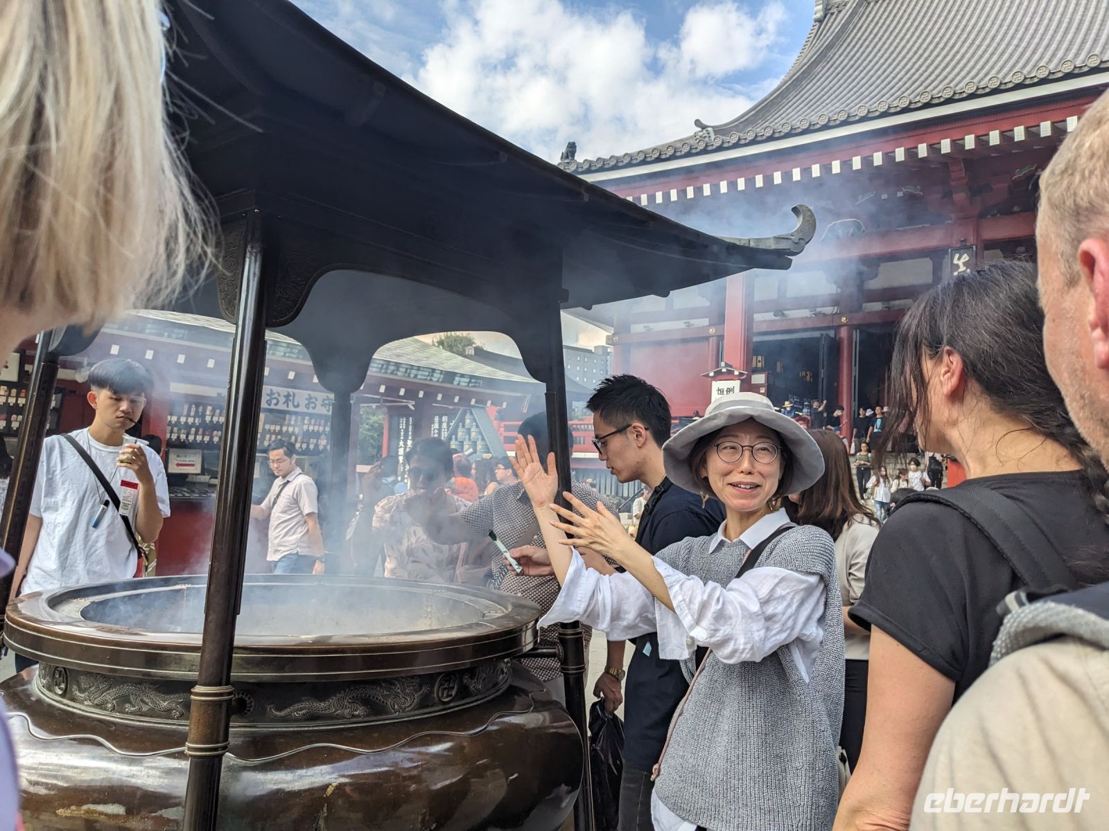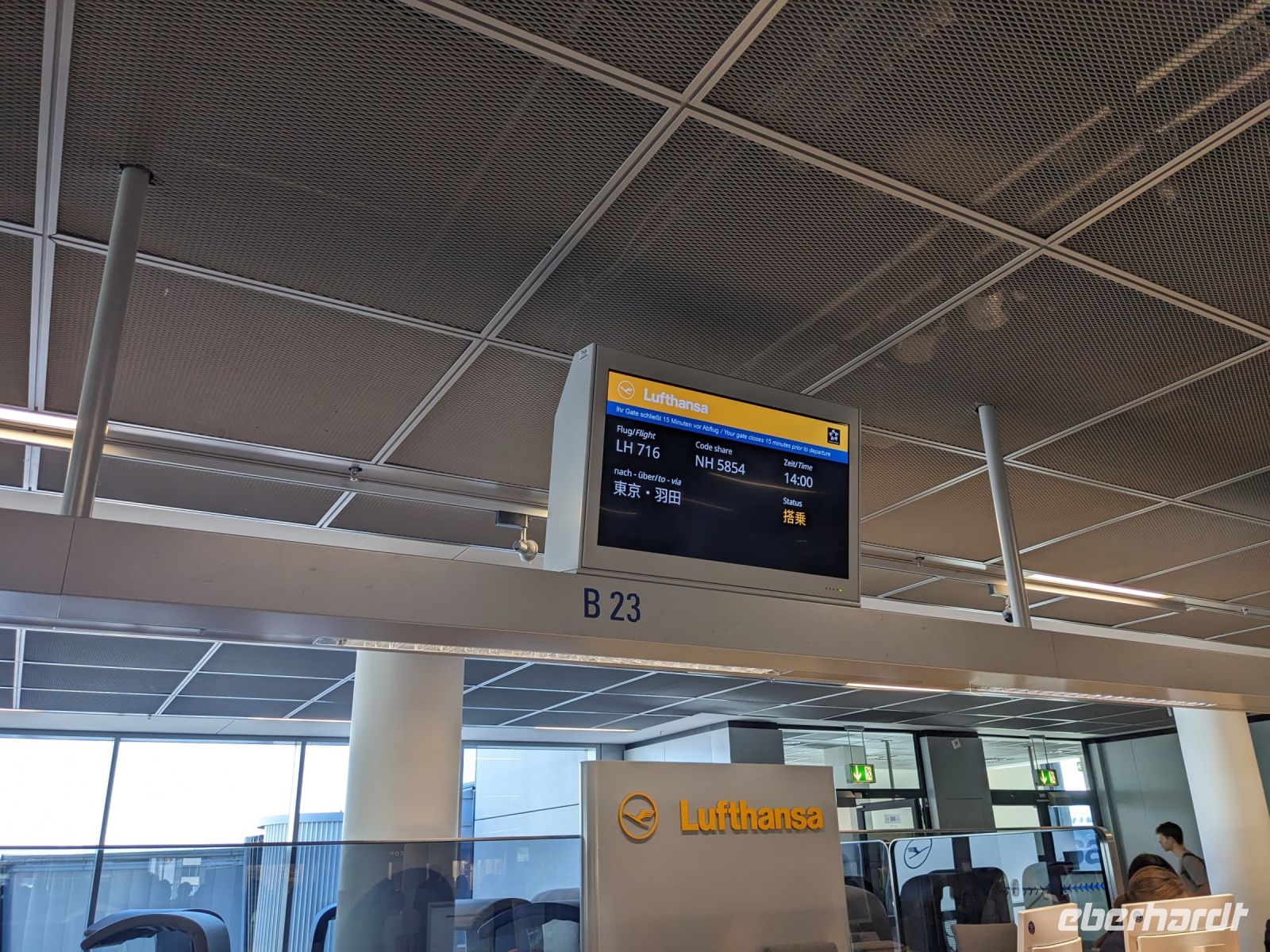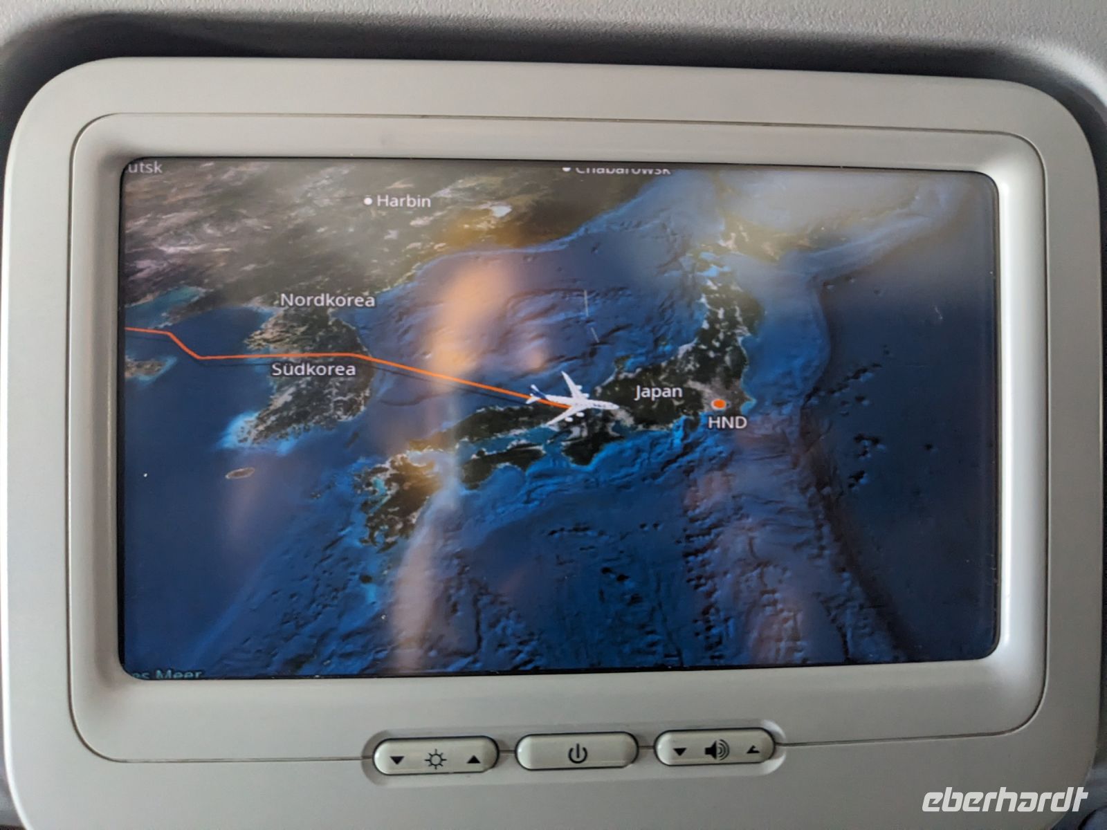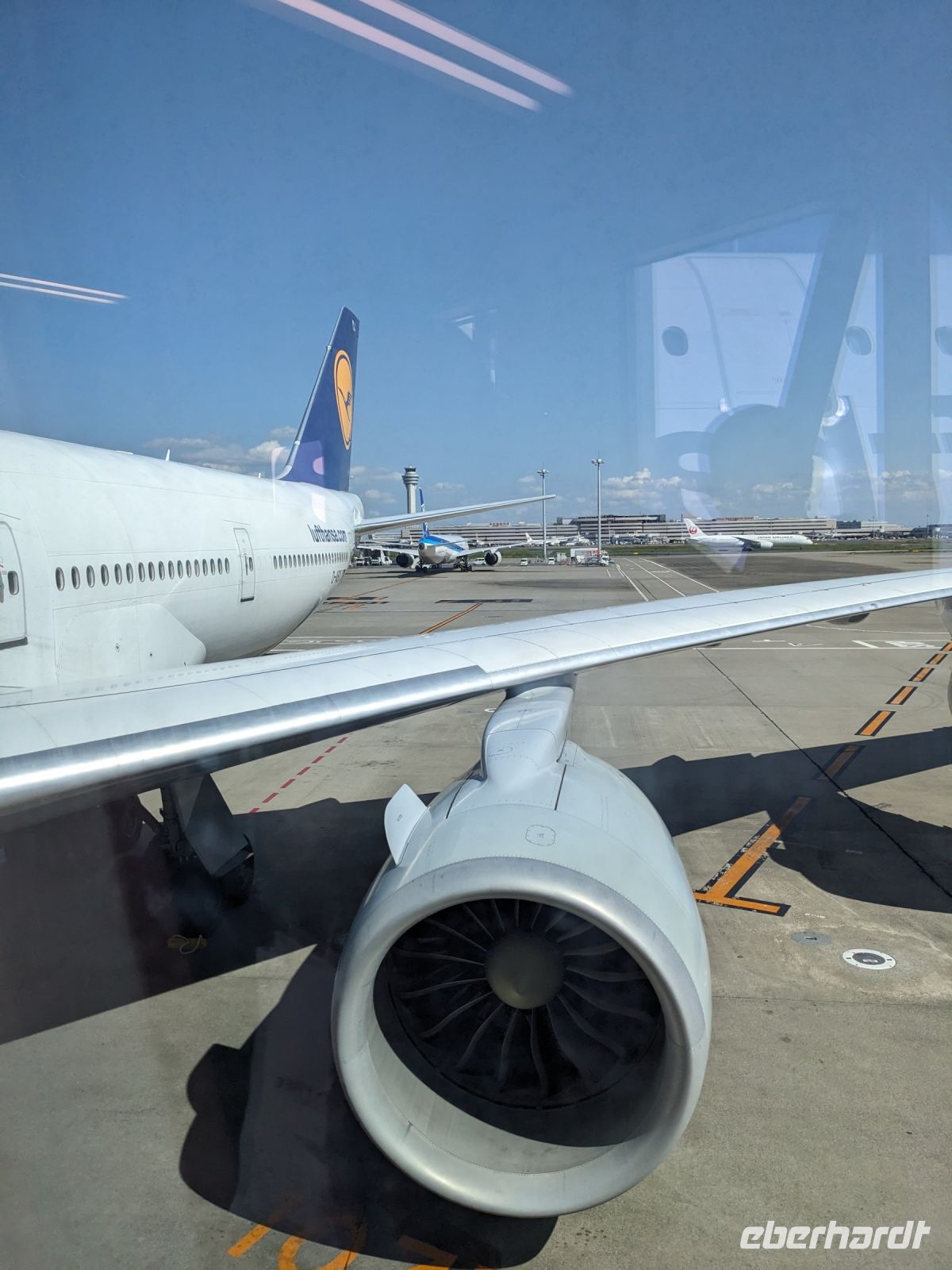 Ob über Berlin, Dresden oder Leipzig - alle Wege führten schließlich nach Frankfurt. Mit meiner blauen Eberhardt-Jacke versuchte ich mich möglichst geschickt am Gate zu platzieren. Das hat auch mehr oder weniger gut funktioniert und letzten Endes haben wir uns auch alle gefunden. Erste Gespräche kamen auf und bei einer kleinen Vorstellungsrunde wurden wir miteinander vertraut. Nach einigen anfänglichen Problemen des Fliegers ging es zwar verspätet los, doch unser Pilot konnte auf dem Flug wieder etwas Zeit herausholen. Über das Bordprogramm gab es diverse Filme, Musik und Spiele, mit denen man sich die Zeit vertreiben konnte. Über Hunger mussten wir nicht klagen - hier hat die Lufthansa uns gut versorgt und so kamen wir, aufgrund der Zeitverschiebung, am Folgetag schließlich in Tokio an. Unsere Rundreise konnte beginnen!