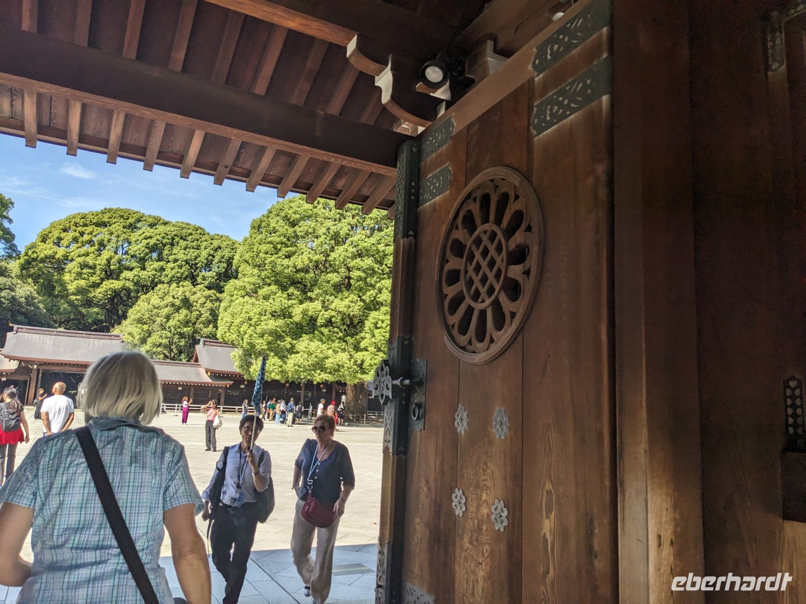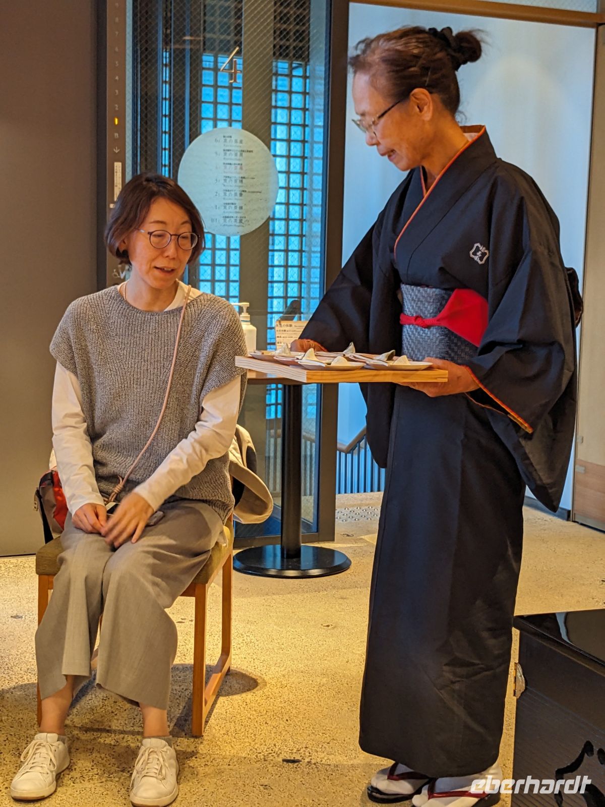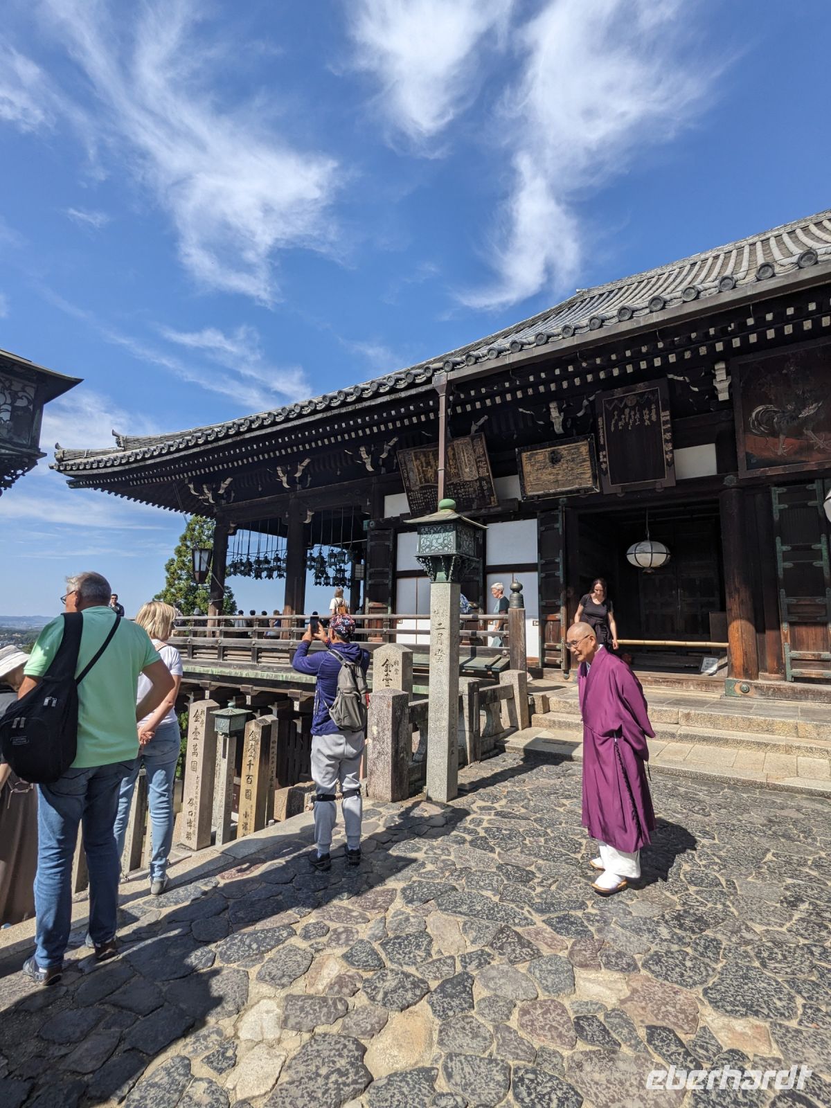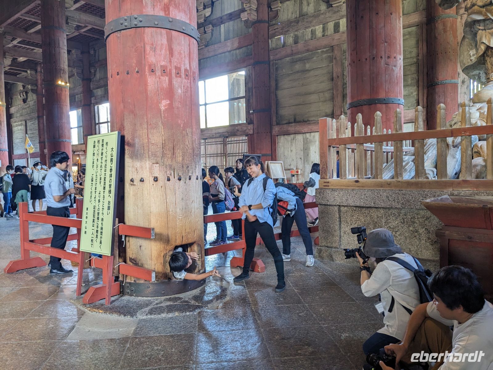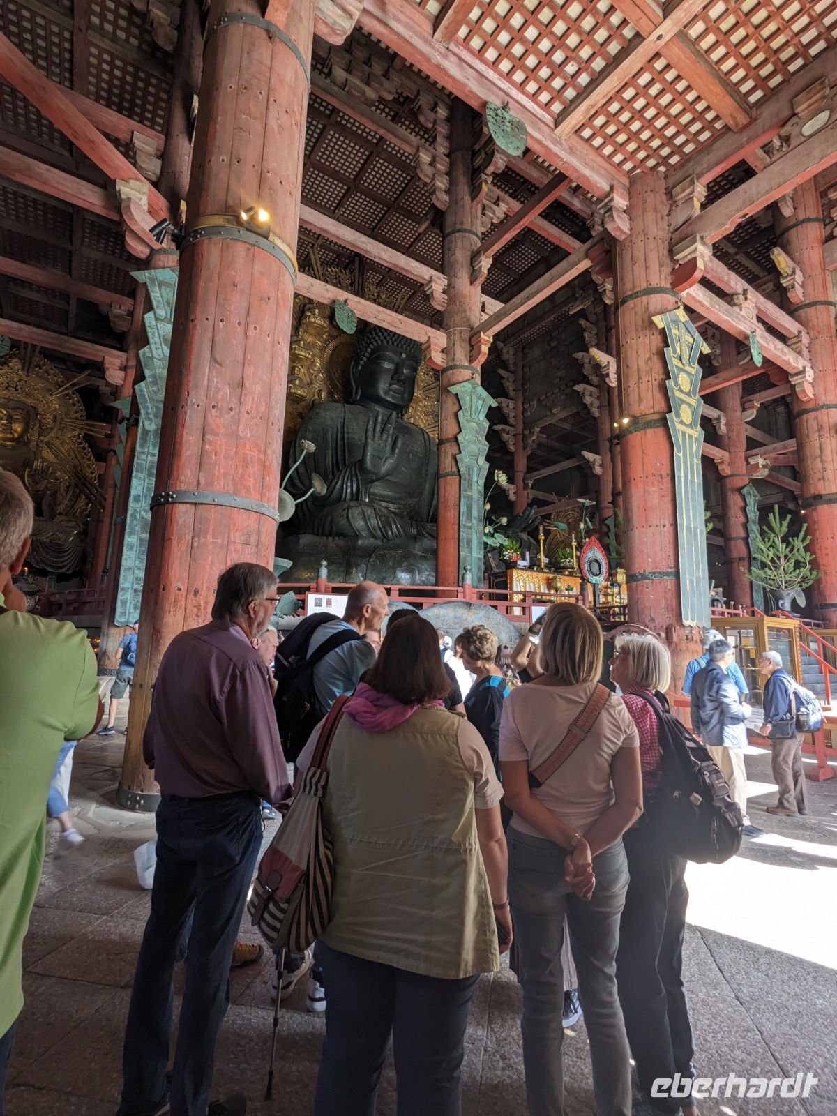 Unser letzter Ausflugstag barg nochmal ein ganz besonderes Highlight: das UNESCO-Dörfchen Nara, unweit von Kyoto. Mit dem Zug und Taxis erreichten wir das Gelände und wurden sogleich von den zahmen und teilweise sogar zudringlichen tierischen Bewohnern begrüßt. Von Scheu war hier keine Spur und die süßen Rehe hielten gespannt Ausschau, ob wir nicht doch irgendwo etwas zu essen dabei hätten. Es machte Spaß die Vierbeiner zu beobachten, doch nachdem wir alle mit den Taxis eingetroffen waren, machten wir uns sogleich auf den Weg die größte bronzene Buddhastatue der Welt zu bestaunen, welche sich zudem in dem größten Holzgebäude der Welt befand - also gleich doppelt beeindruckend. Hier wurde gerade ein großes Fest vorbereitet, welches das Jubiläum der Anlage zelebrieren sollte. In der Halle angekommen, sahen wir die gigantischen Ausmaße der Statue und legten einen kleinen Rundgang ein. Am hinteren Ende des Raumes befand sich eine Säule, durch die ein Loch geschlagen war. Viele Leute, vor allem Schüler, standen an, um sich durch dieses Loch hindurchziehen zu lassen - Schnappschüsse durften hier natürlich auch nicht fehlen. Etwas skurril, aber laut Masayo sollte dies den Teilnehmenden Glück bringen. Anschließend spazierten wir weiter durch den Park und legten schließlich eine Mittagspause ein. Dabei ging ein Teil der Gruppe mit Masayo und probierte eine landestypische Nudelsuppe, während ich mit dem zweiten Teil Quiche sowie Kuchen in einem naheliegenden Restaurant aß. Beide Gruppen waren sehr zufrieden und gestärkt machten wir uns dann gemeinsam auf den Weg zum Kasugataisha-Schrein. Von dort liefen wir zum Parkplatz, wo sich viele bei dem schönen Wetter noch ein Eis holten und wir dann den Bus zum Bahnhof nahmen. Es ging zurück nach Kyoto. Nach einer kurzen Pause am Hotel fuhren wir zu unserem letzten gemeinsamen Abendessen in ein Restaurant, was beinahe einem Labyrinth glich, so verwinkelt war es. Aber trotz der Irrgänge fand das leckere Essen irgendwann schließlich zu uns und wir kamen nochmals in den Genuss einiger japanischen Köstlichkeiten. Ich nutzte die entspannte Atmosphäre für ein paar dankende Worte an Masayo und die Übergabe eines kleinen Geschenks im Namen von Eberhardt TRAVEL, womit meine liebe Gruppe hoffentlich Zuhause fleißig übt, sodass alle für die nächste Reise in den asiatischen Raum gewappnet sind. Zurück im Hotel hieß es erstmal packen und dann schnell ins Bett - schließlich mussten wir am nächsten Morgen früh raus...